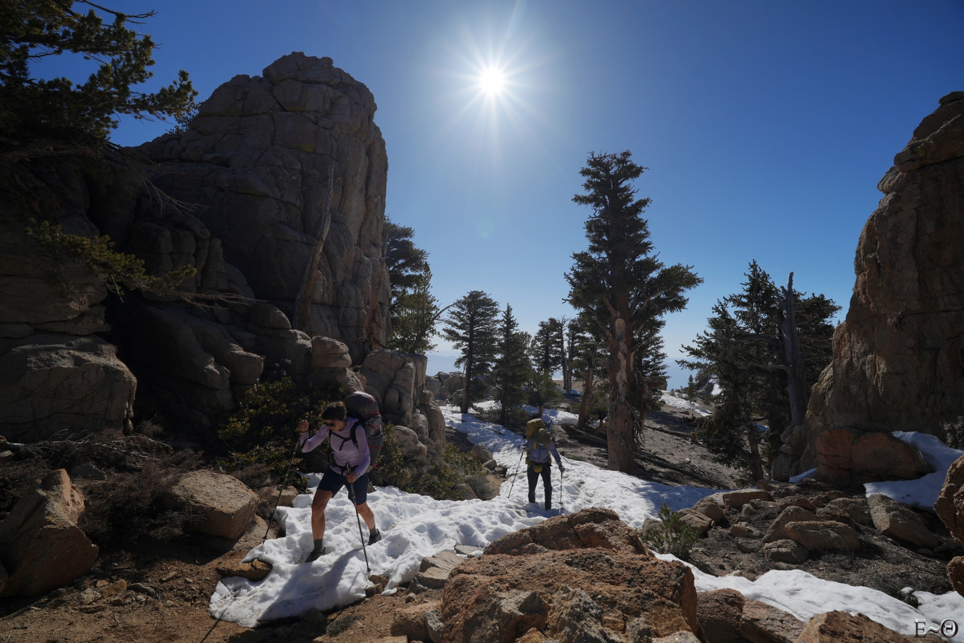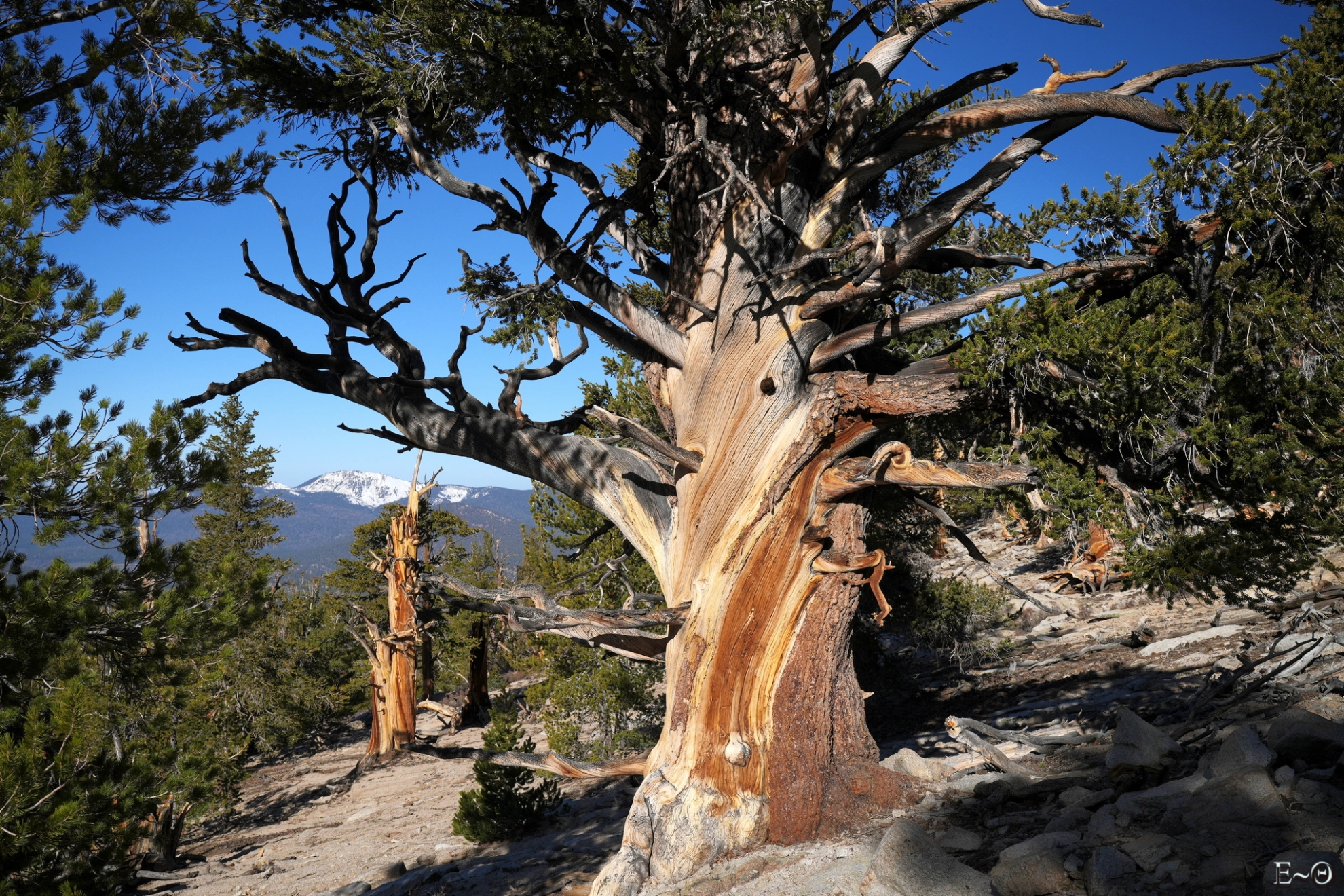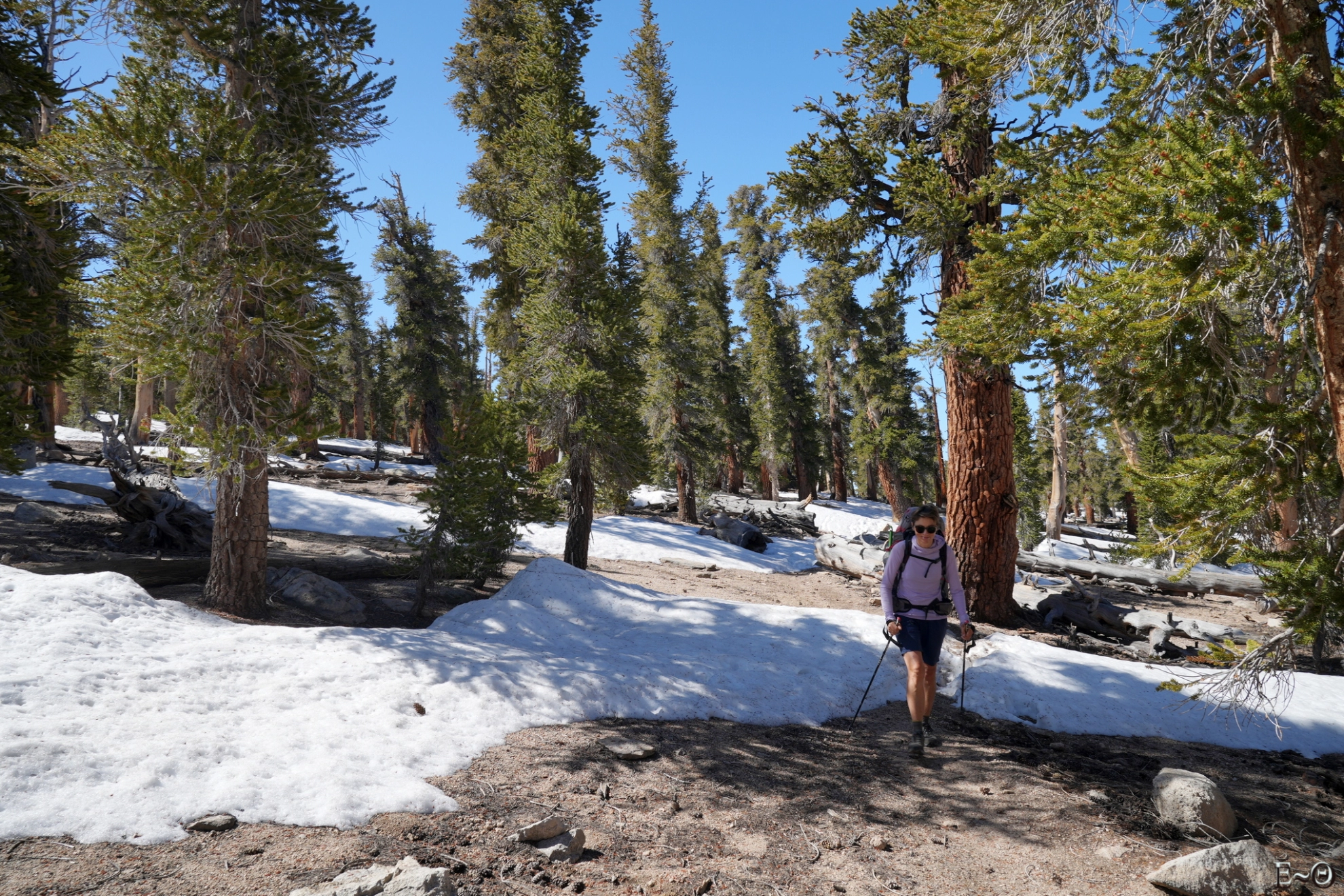 Il est impossible de ne pas être stupéfait devant la variété invraisemblable des formes tortueuses des bois secs. La densité de l’aubier et du duramen, remplis de résine leur permet de ne pas de se décomposer rapidement et certaines branches ont des âges évalués à 10 000 ans. Nous ne verrons pas les grands séquoias, mais nous observons, peut-être et sûrement, des lieux et arbres aussi spectaculaires et extraordinaires ! Nous recroisons Tamara et Anthony, qui reprenne le sentier, ils avancent plus lentement ce jour.
