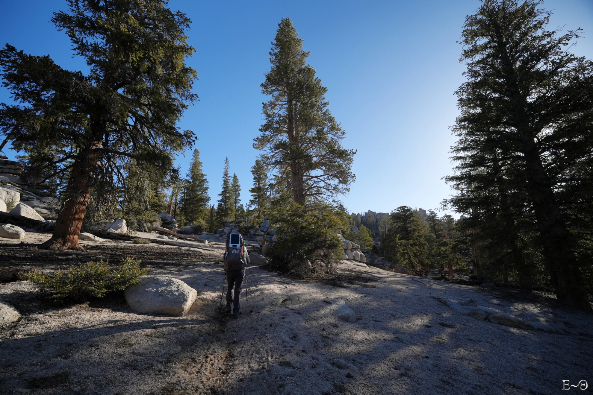 Le démarrage au matin se fait plutôt aisément, le sentier, fine trace sablonneuse, hors neige se faufile dans l’une des belles forêts que nous ayons traversées. Nous commençons sur une crête rocheuse, Sharknose Ridge, qui surplombe les vallées d’Owens et son immense lac, puis South Fork Ash Creek, et d’Ash Creek, où nous montons de 350 m de dénivelé en 1h 30. Les couleurs au lever de soleil sont magnifiques, et les températures pas trop chaudes permettent d’avancer rapidement.