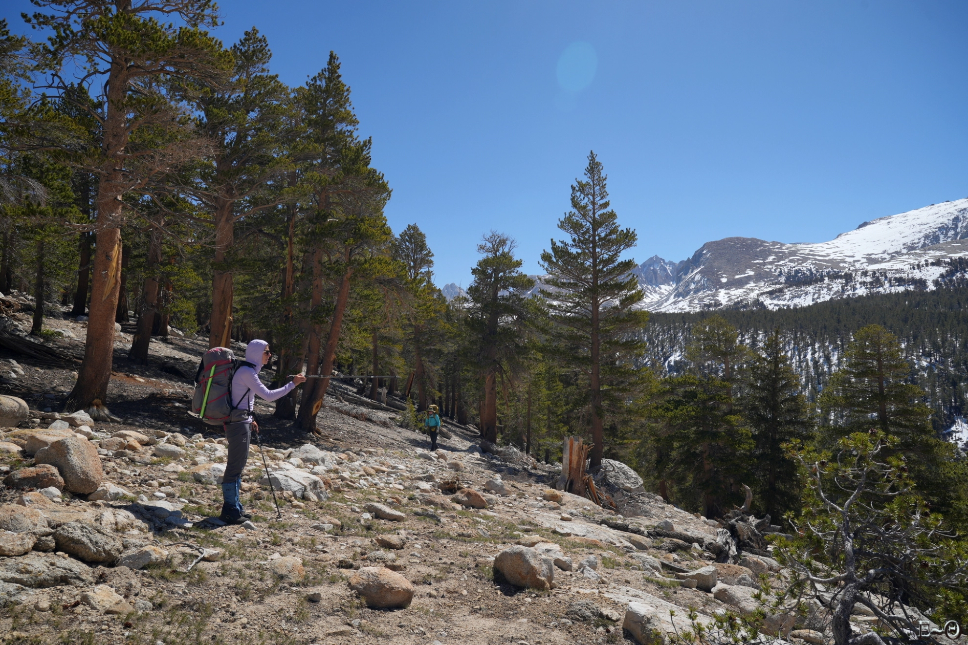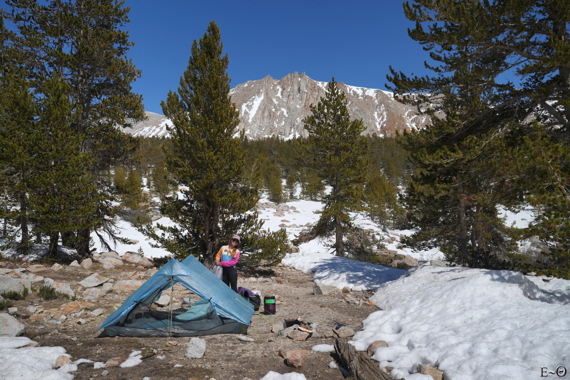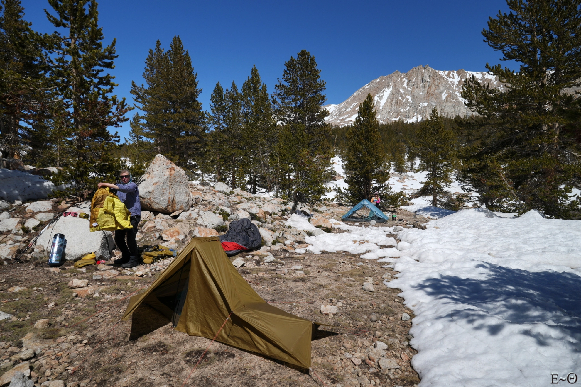Le soleil derrière le sommet du mont Withney éclaire les crêtes, et à-pics en un arc-en-ciel de teintes changeantes de minutes en minutes. Il fait moins 6 degrés ce matin et le réveil glacial est un des plus saisissants que nous ayons eu depuis le début. L’eau gèle en direct dans les gamelles, et les doigts malgré les gants commencent à trouver l’expérience pénible. Heureusement, nous sommes bien équipés et il n’y a pas de risque de se faire une gelure. Par contre, nous ne restons pas traîner au petit déjeuner. Plus tôt nous serons à marcher, plus tôt nous nous réchaufferons. En plus la montée en altitude permettra de se mettre au soleil. L’immense barre verticale des sommets à l’est, qui culmine à 4300 mètres s’interposant entre celui-ci et notre camp.