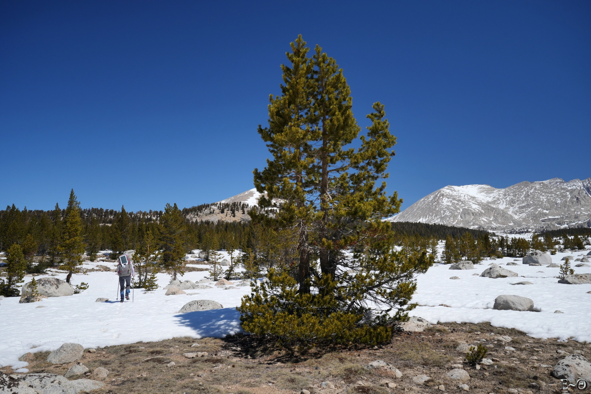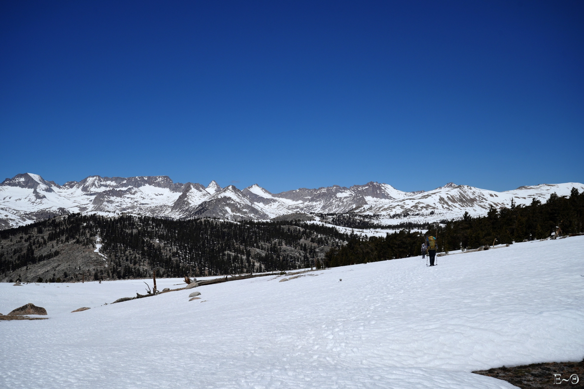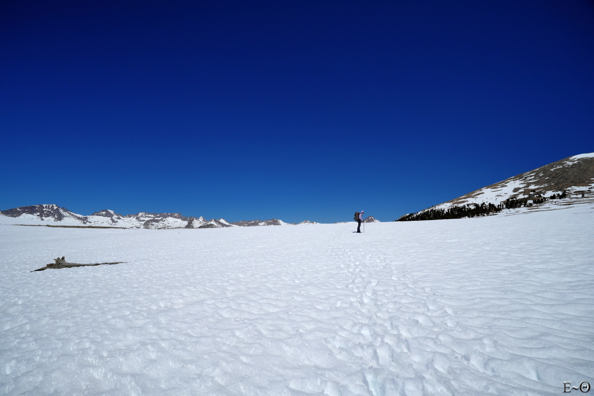Le point haut de la journée sera la traversée du plateau de Big Horn à 3500 m. Le site est incroyable, la vue à 360° sur l’ensemble des sommets de la Sierra Nevada, Mt Withney au Sud, Kaweah et Triple Divide Peak à l’ouest est monumentale. C’est grandiose, imposant, et ressemble presque à une cathédrale céleste. Ce cirque est des plus beaux que nous n’ayons jamais contemplé. Nous progressons sans trace aucune. Nous sommes seuls et le sentiment de solitude est palpable. Pas une présence humaine, que ce soit dans le ciel, les avions de ligne contournant la Sierra, ou sur les crêtes environnantes. Si nous avions eu le temps, c’est vraiment LE lieu où poser sa tente. Les levées et couchers de soleil doivent être grandissimes. C’est un endroit où l’homme est juste toléré, mais que celui-ci n’a ni conquis, ni domestiqué. Merci aux Américains d’avoir su protéger ces espaces vierges.