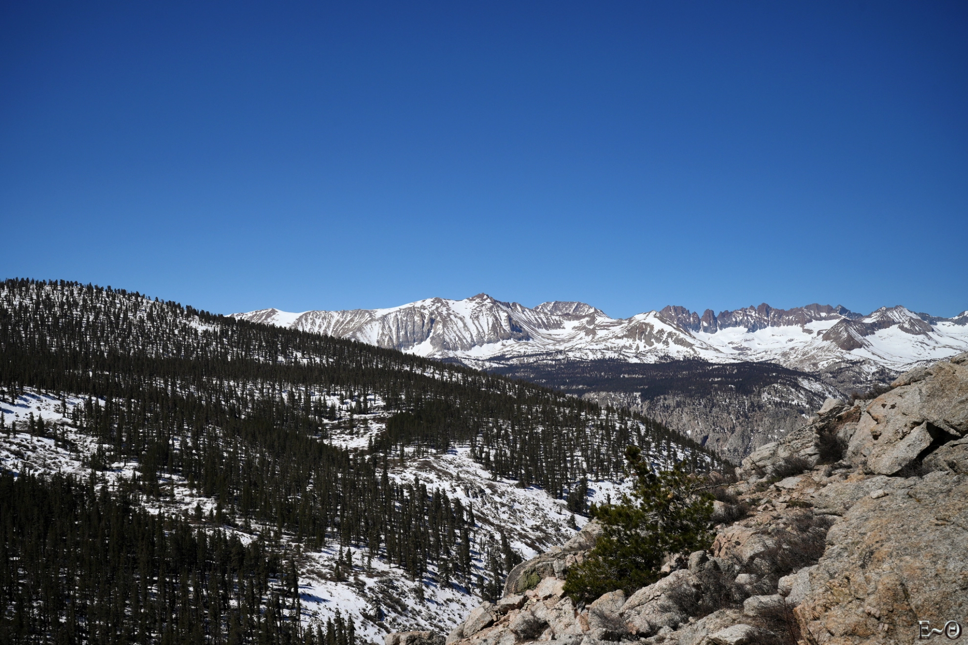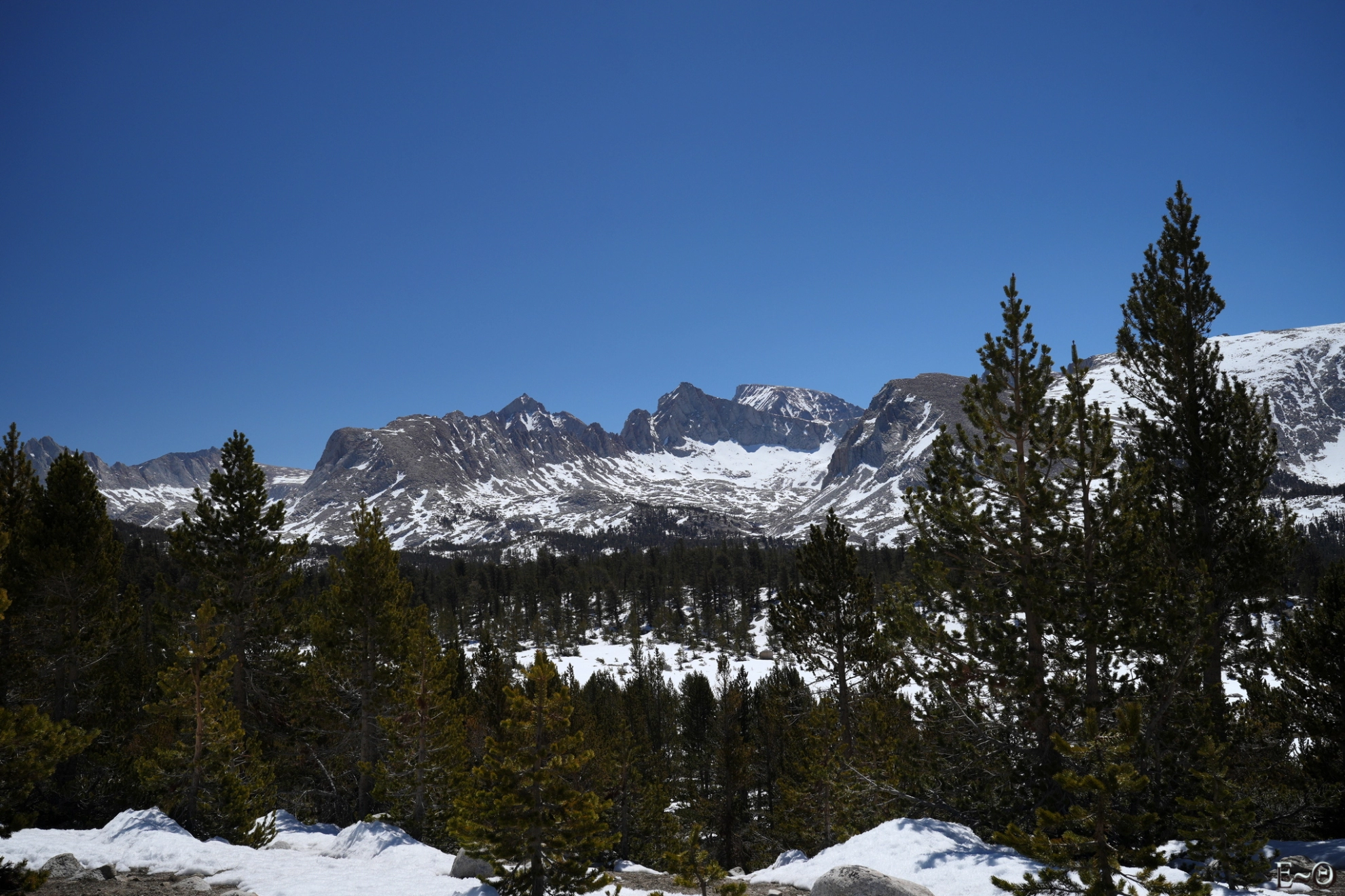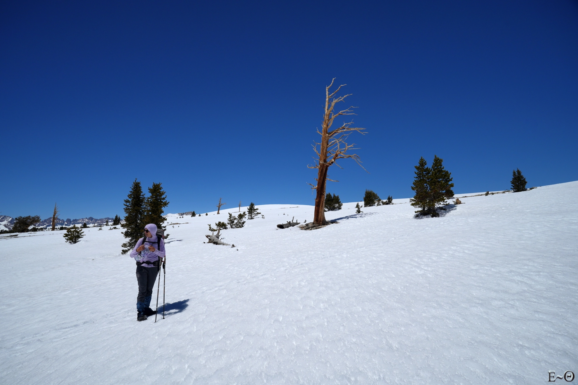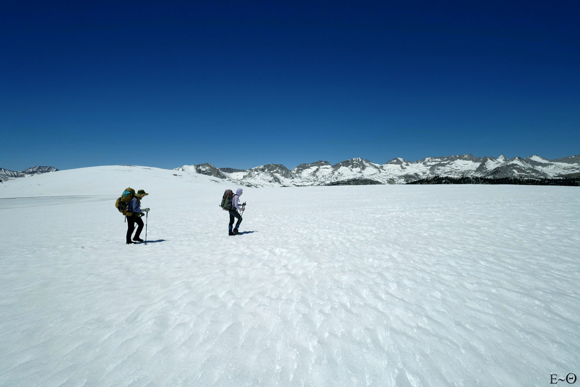 Le point haut de la journée sera la traversée du plateau de Big Horn à 3500 m. Le site est incroyable, la vue à 360° sur l’ensemble des sommets de la Sierra Nevada, Mt Withney au Sud, Kaweah et Triple Divide Peak à l’ouest est monumentale. C’est grandiose, imposant, et ressemble presque à une cathédrale céleste. Ce cirque est des plus beaux que nous n’ayons jamais contemplé. Nous progressons sans trace aucune. Nous sommes seuls et le sentiment de solitude est palpable. Pas une présence humaine, que ce soit dans le ciel, les avions de ligne contournant la Sierra, ou sur les crêtes environnantes. Si nous avions eu le temps, c’est vraiment LE lieu où poser sa tente. Les levées et couchers de soleil doivent être grandissimes. C’est un endroit où l’homme est juste toléré, mais que celui-ci n’a ni conquis, ni domestiqué. Merci aux Américains d’avoir su protéger ces espaces vierges.