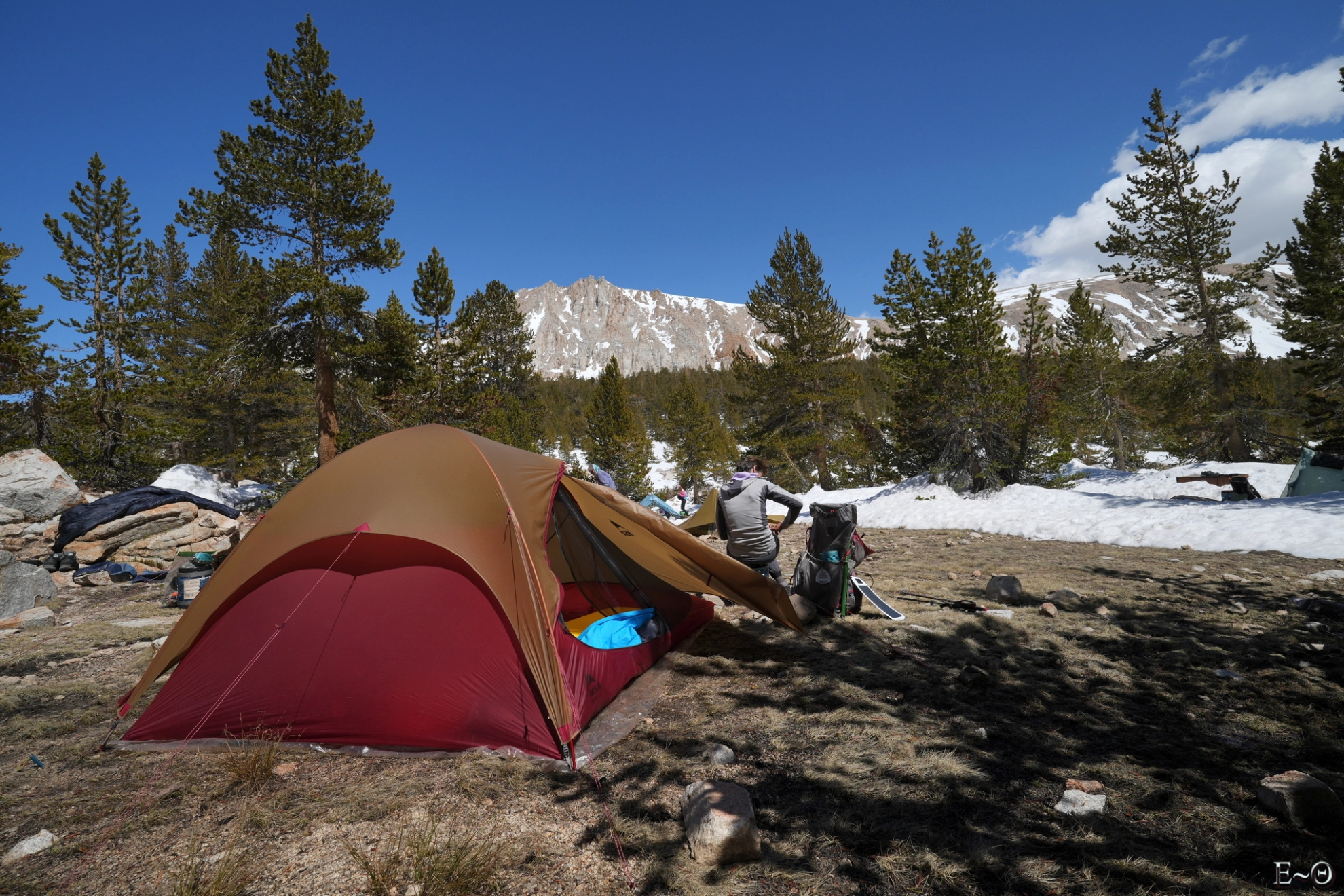 Nous arrivons tôt au campement. Nous avons la chance de trouver des emplacements hors neige de quelques jours probablement, le sol étant encore mou de la fonte récente. Chacun s’installe dans une pastille à sa taille et nous creusons dans les congères des chemins pour que chacun puisse rejoindre son voisin sans se mouiller les pieds.