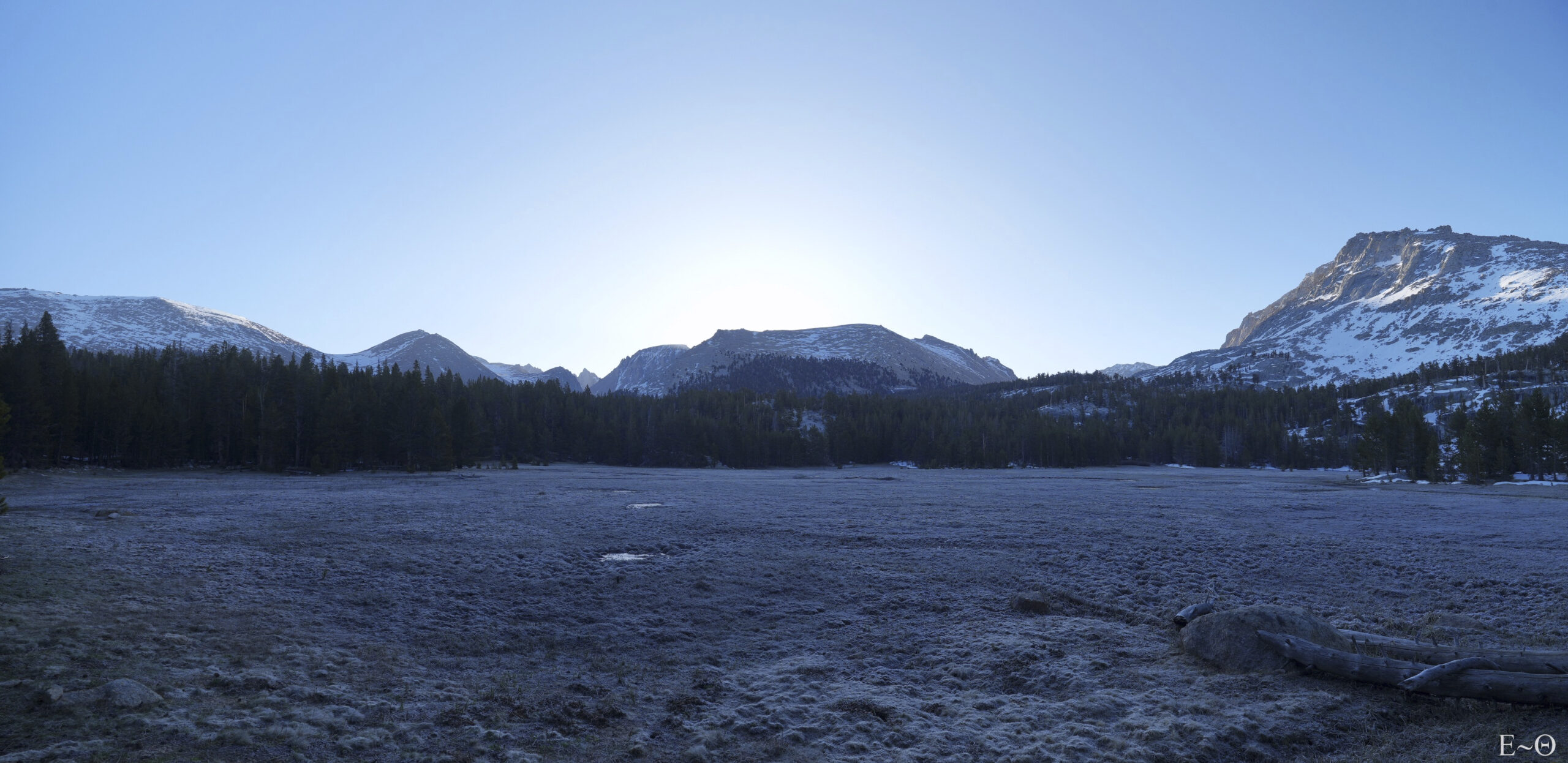 La prairie de Crabtree Meadows est silencieuse, sans vent et les rares brumes de la rivière s’évapore dans l’air sec et mordant de la haute altitude. Les couleurs sont à dominante de bleu, un bleu un peu dur, froid, qui vous fait sentir le gèle au plus profond des os. L’azur du ciel se reflète dans le givre présent au sol, mais aussi sur les arbres, et le torrent. C’est majestueux et impressionnant. Ce cirque montagneux est un de ces endroits qui conforte dans le choix de marcher longtemps.