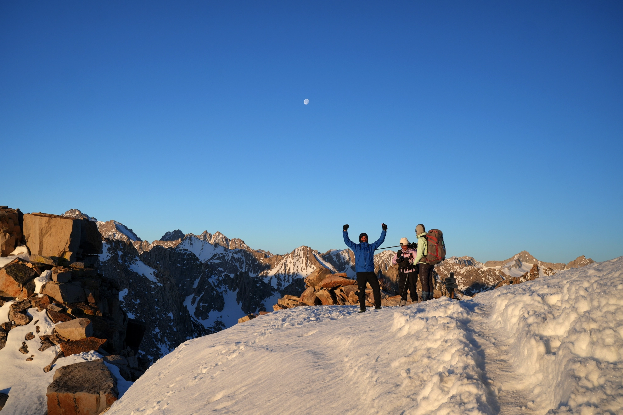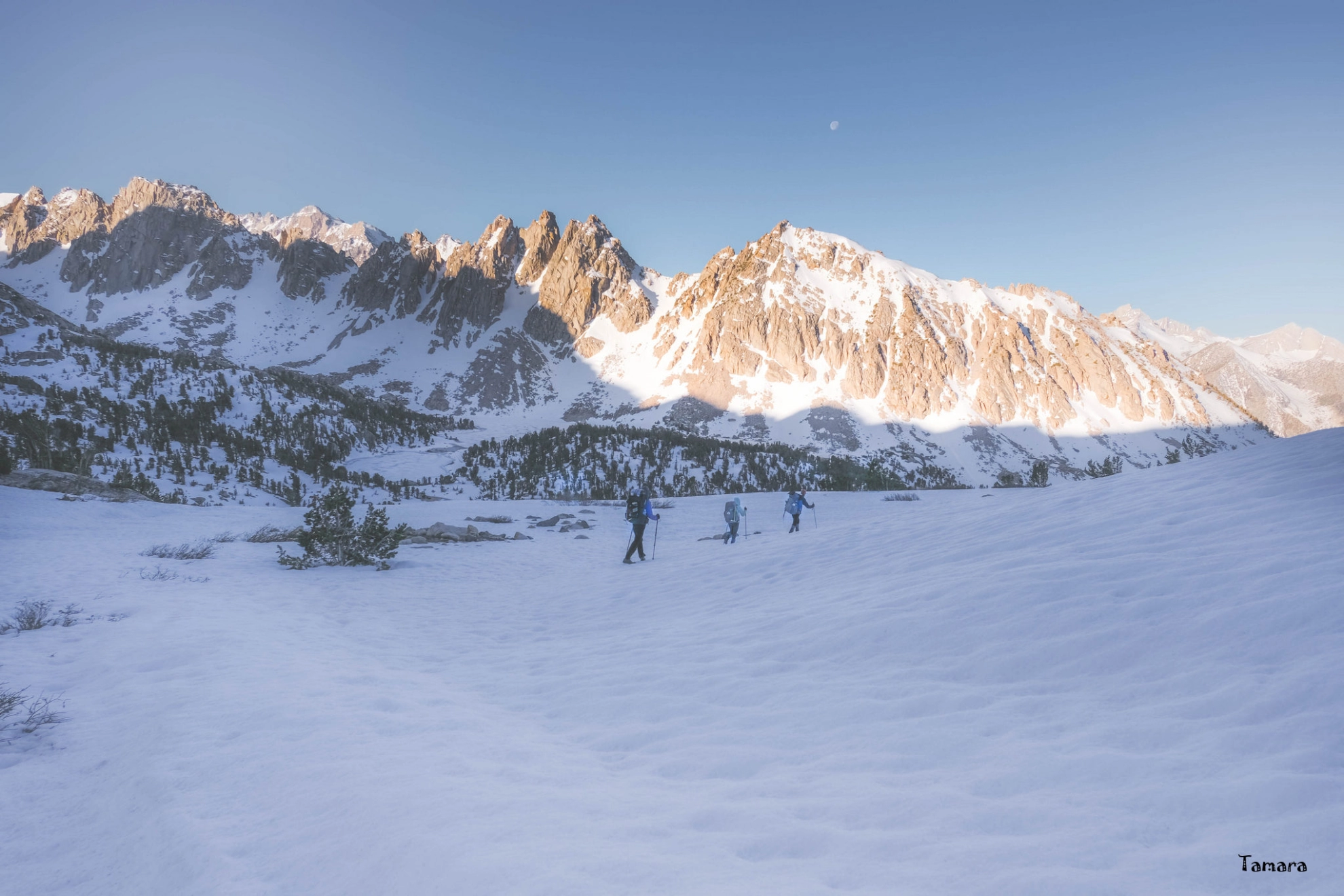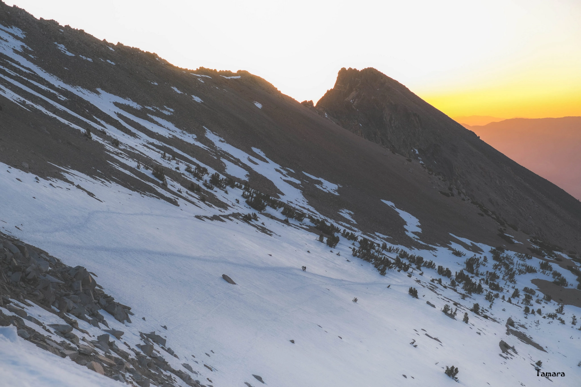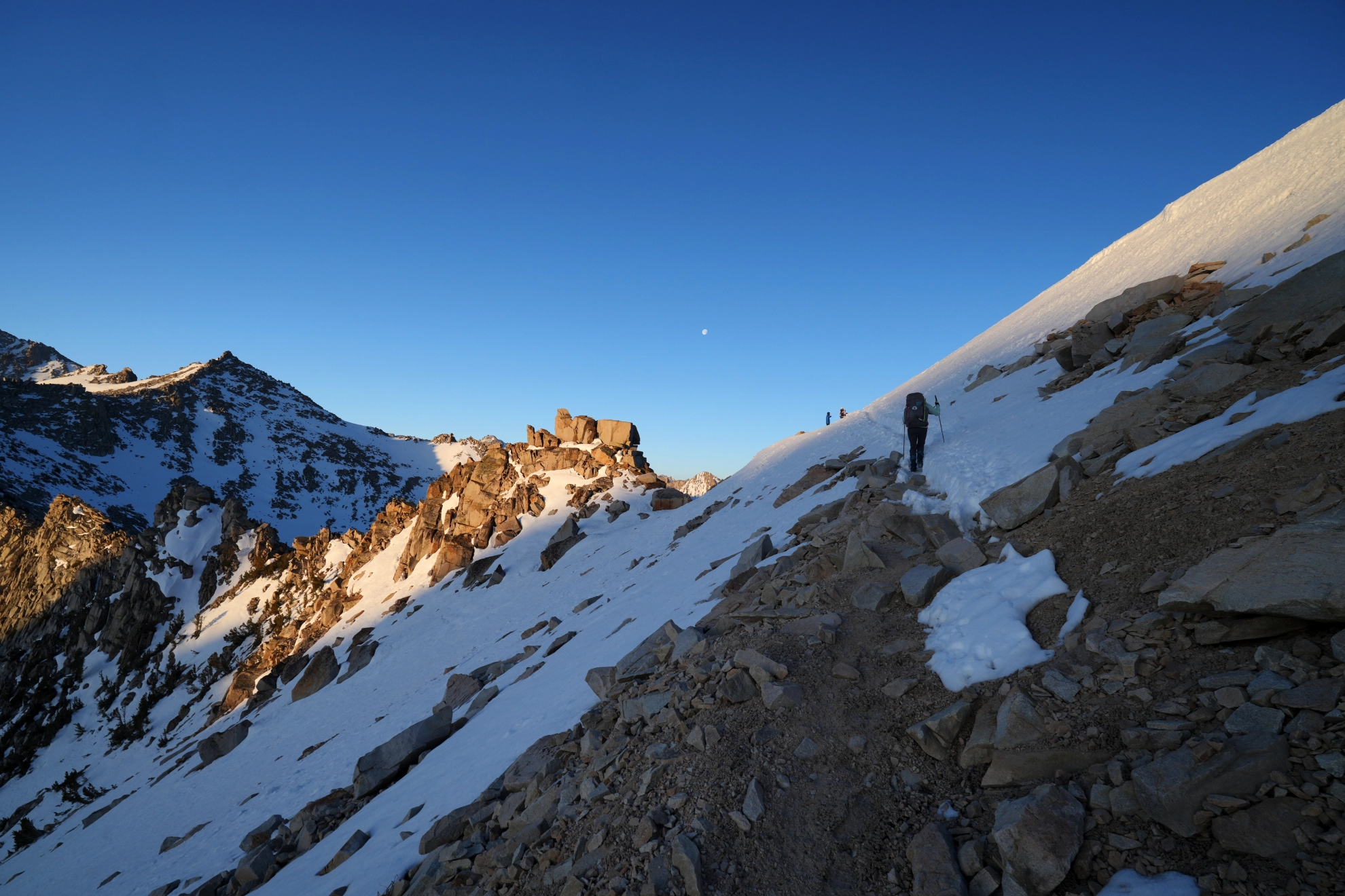 Nous avançons bien et les sensations sont excellentes. Le repos a été bénéfique. Étonnamment, nous errons moins qu’au premier passage et arrivons à bien suivre les traces. Après avoir franchi les deux ressauts au niveau des lacs de Heart Laket et BigPotHole lake, dans l’immense cirque d’University peak qui commence à s’illuminer sous le soleil levant, nous nous engageons dans les pentes sous Kearsage. Nous devinons au loin Anthony et Tamara qui sont déjà au col. Génial et bien vue !
