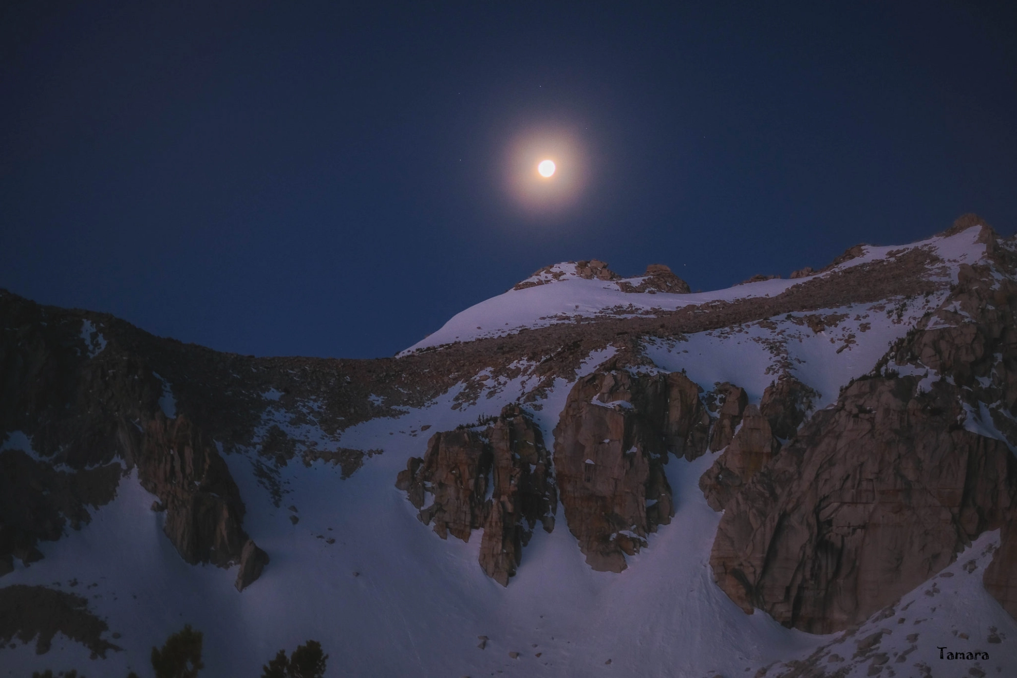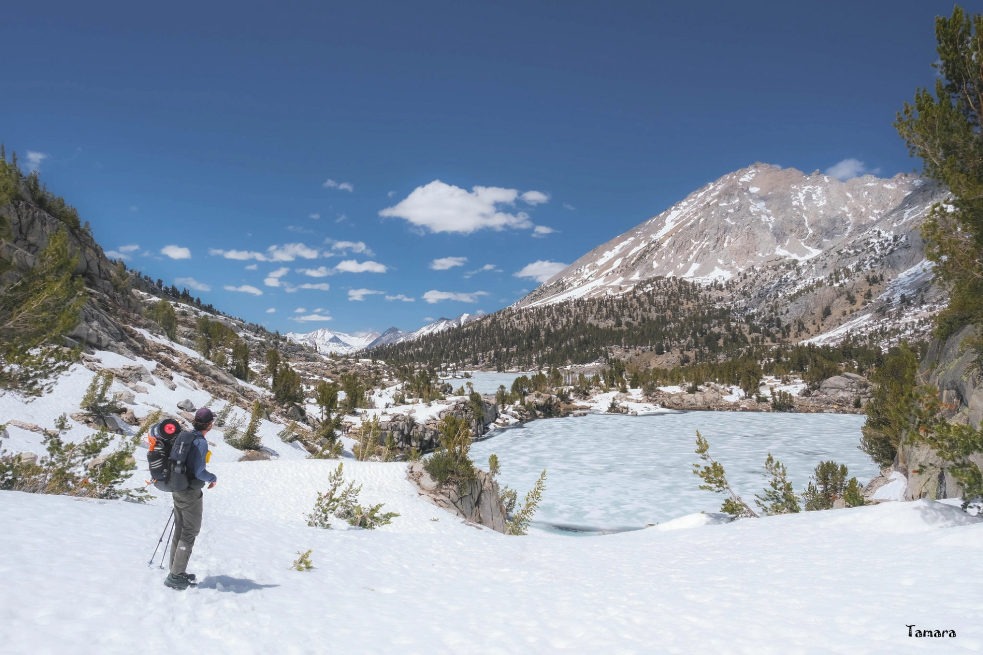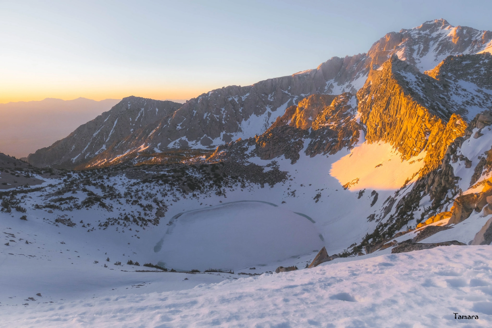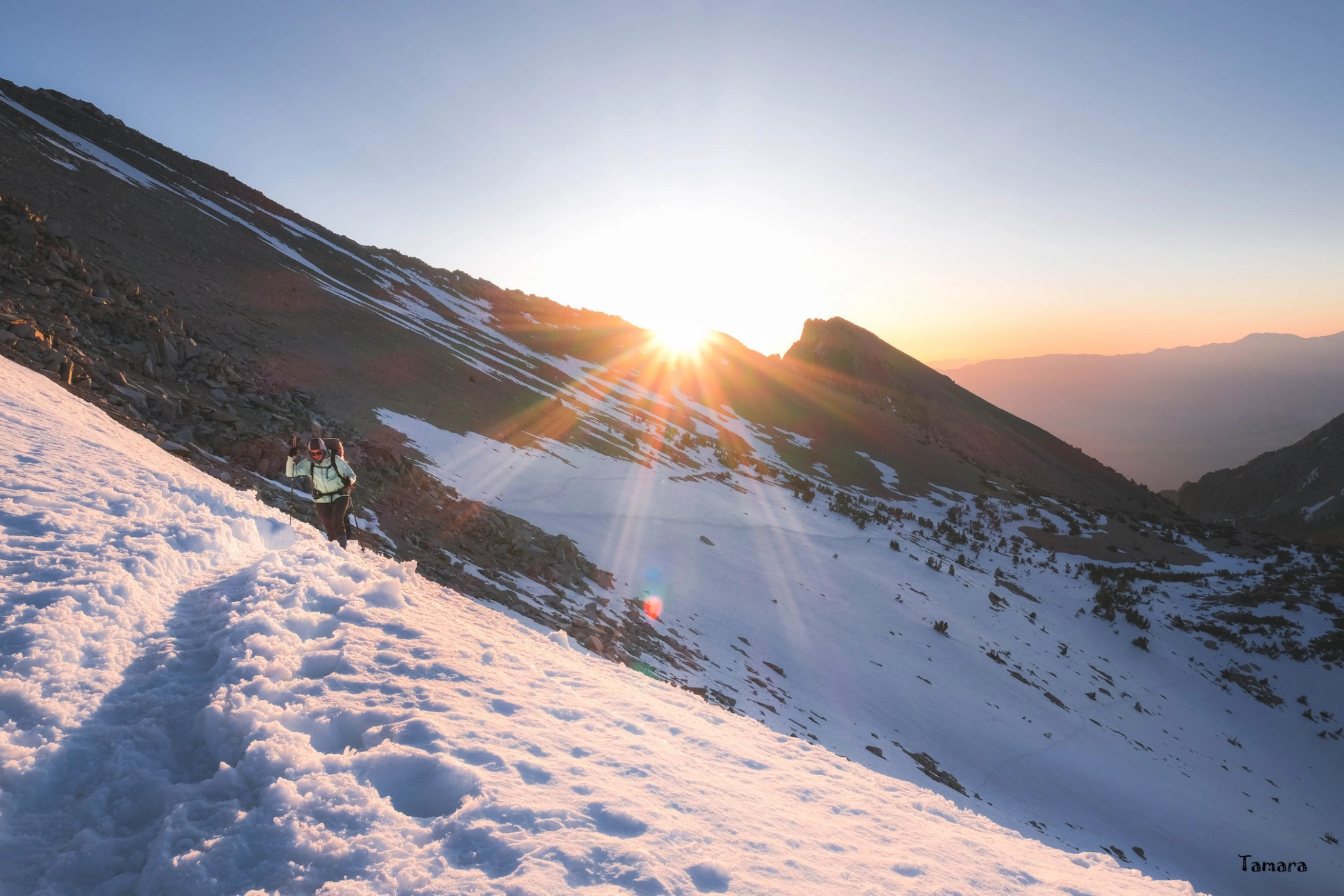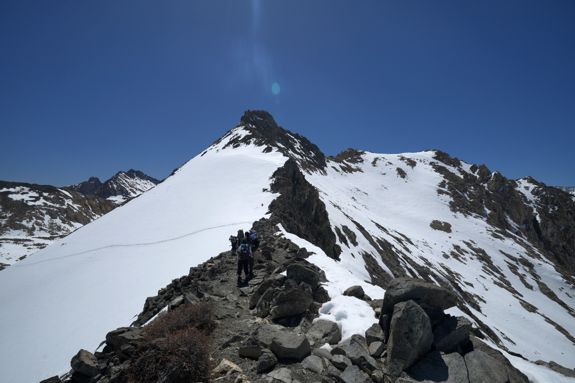 Nous avançons bien et les sensations sont excellentes. Le repos a été bénéfique. Étonnamment, nous errons moins qu’au premier passage et arrivons à bien suivre les traces. Après avoir franchi les deux ressauts au niveau des lacs de Heart Laket et BigPotHole lake, dans l’immense cirque d’University peak qui commence à s’illuminer sous le soleil levant, nous nous engageons dans les pentes sous Kearsage. Nous devinons au loin Anthony et Tamara qui sont déjà au col. Génial et bien vue !