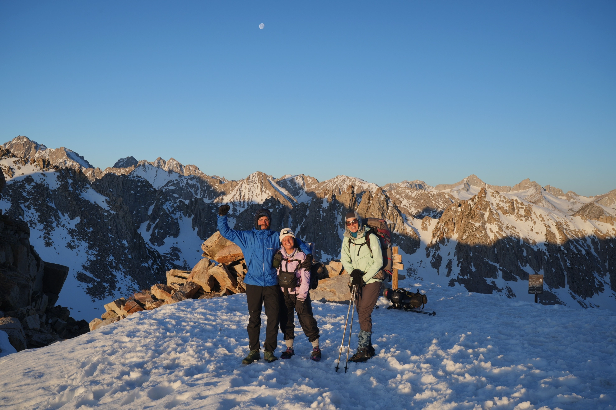 Étonnamment nous ne voyons pas Chloé et Benjamin, nous étions pourtant juste quelques minutes devant eux. Nous apprendrons plus tard qu’ils ont perdu du matériel et que Benjamin est retourné le chercher. Nous arrivons au col quelques minutes après le lever de soleil. L’ambiance est magique et les sommets s’allument tous les uns après les autres.