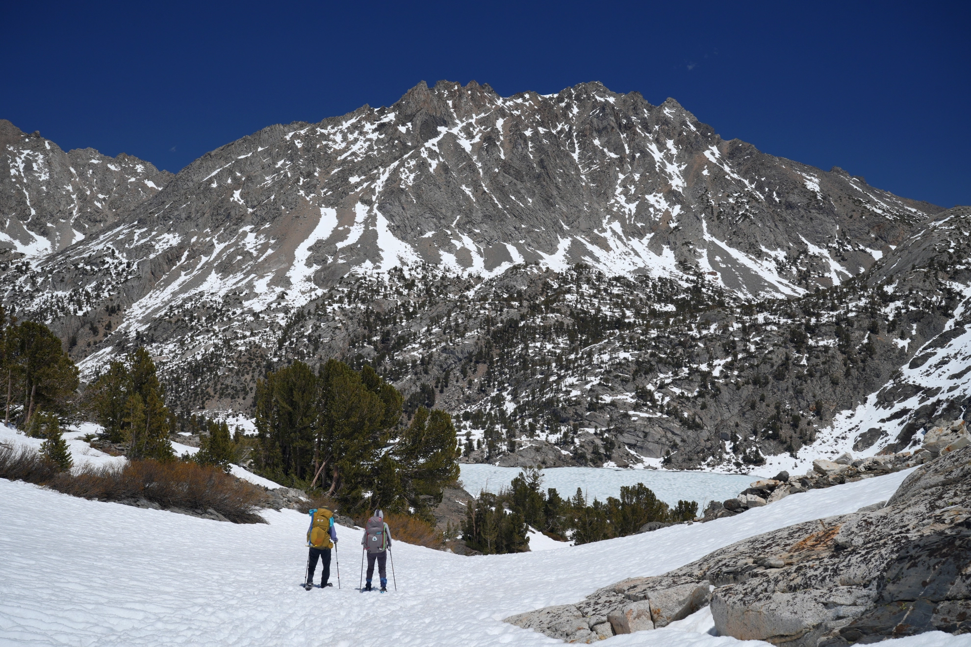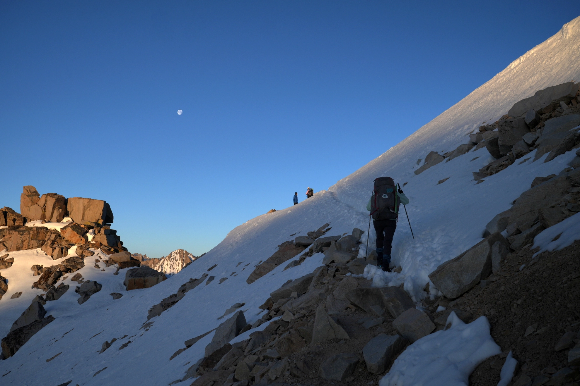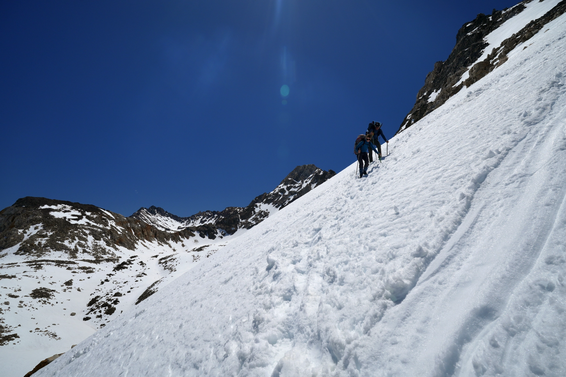 C’est un verrou à franchir qu’il ne faut pas prendre à la légère. Idéalement nous devons être au terme de l’ascension avant 10 h pour que la neige à la descente ne soit pas trop molle. Il permet de passer d’un des affluents de Bubbs Creek à l’immense vallée glaciaire qui fend du sud vers le nord la Sierra jusqu’au col de Mather Pass.