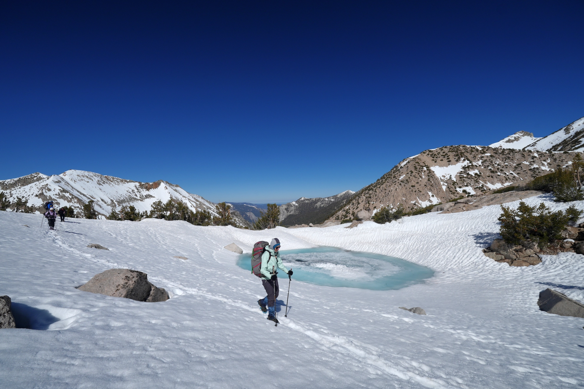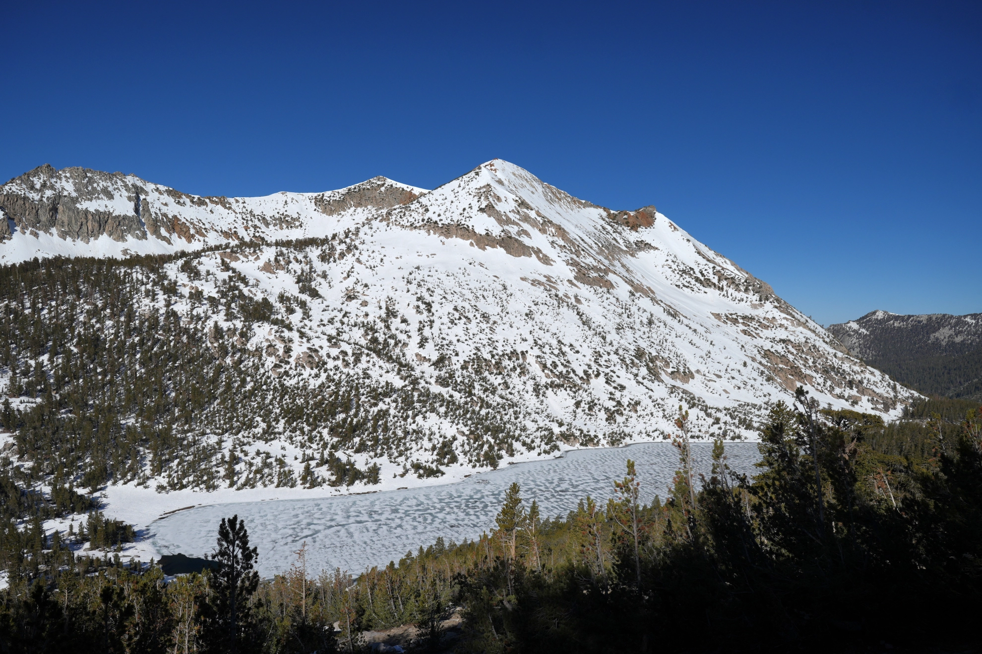 Tamara et Anthony sont partis encore plus tôt. Tamara, qui va essayer ses crampons a préféré prendre de l’avance. Elle a envie d’être à l’aise et avancer un peu plus doucement est la clé. Le premier col, Kearsage nous est déjà familier. C’est le passage que nous avions emprunté pour sortir du PCT il y deux jours. C’est une mise en jambe de 3 km pour 600 m d’ascension. Nous savons qu’il y a une traversée un peu sérieuse. Ce sera plus agréable de progresser avec une neige portante.
