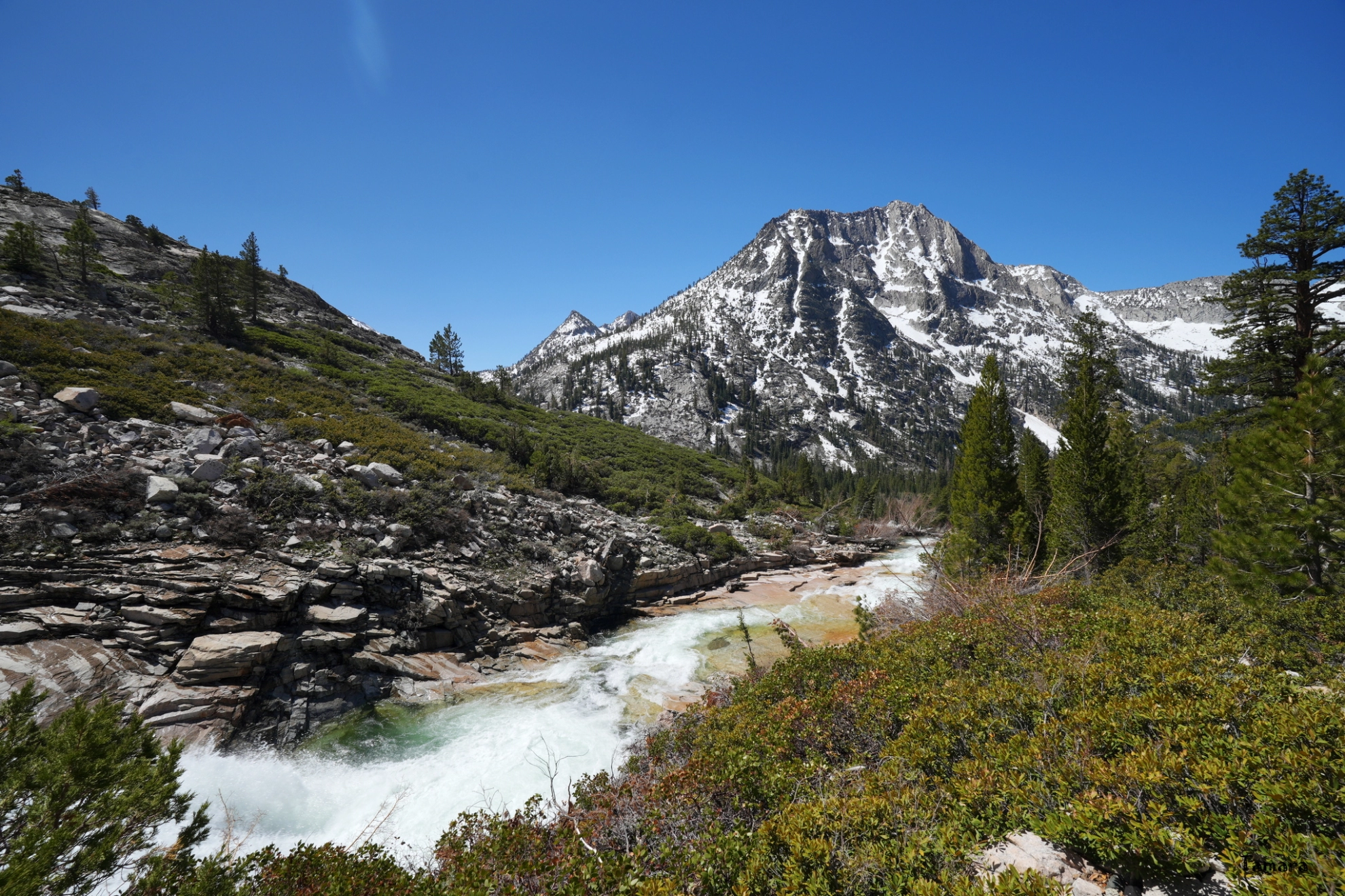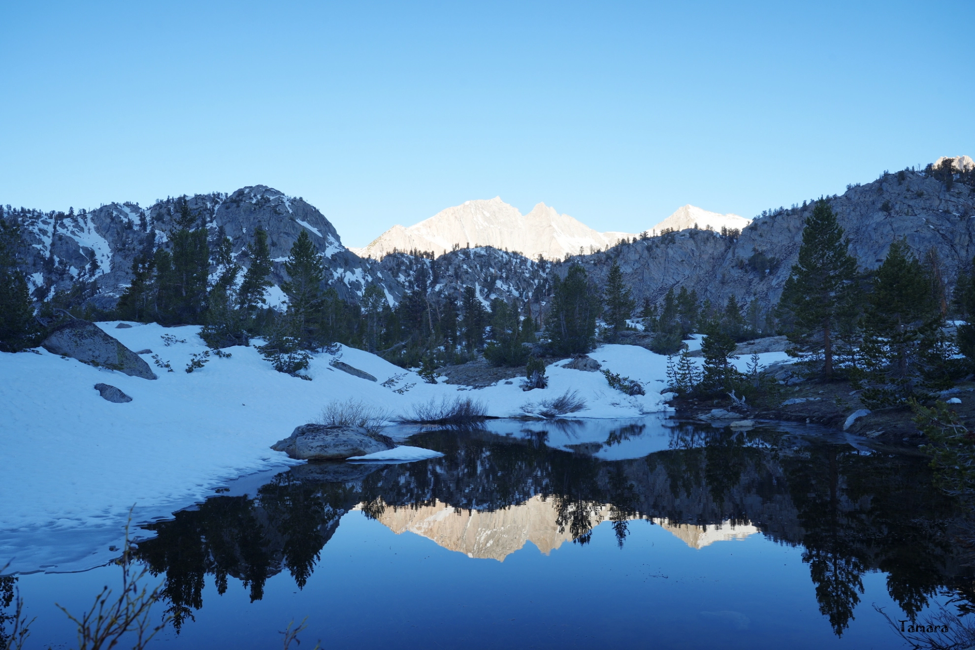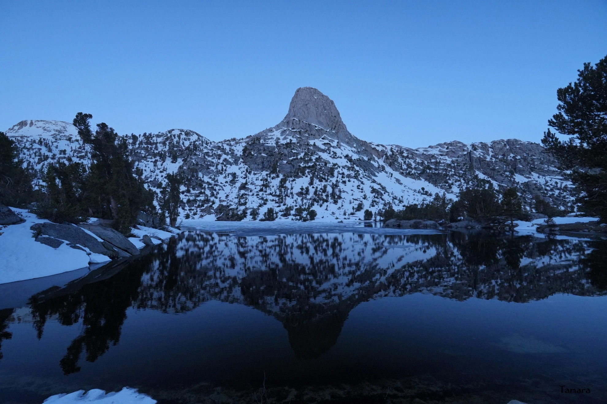 Nous rejoignons le verrou vers la rive gauche des lacs Rae. Se plonger à 5 h 30 entre les lacs Arrowheard et Dollar Lake dans un torrent bien tonique, qui passe les genoux est revigorant. Finalement avec des températures négatives, une eau au-dessus de zéro degré c’est toujours plus chaud. Nous positivons. Il n’empêche, 2 degrés, ça met dans l’ambiance. Nous n’avons pas de col à franchir, c’est presque un vrai regret. Les passages de gué sont bien plus compliqués et traîtres. En plus, c’est impossible d’arriver à avancer vite. Sois-vous enlevez systématiquement vos chaussures, et vous perdez 10 minutes par rivière, et au bout de 20 cela fait presque trois heures « d’offert » au PCT. Sois-vous gardez vos chaussures et vous appréciez la fraîcheur du sol transmise par l’humidité de vos pieds. Pas simple.