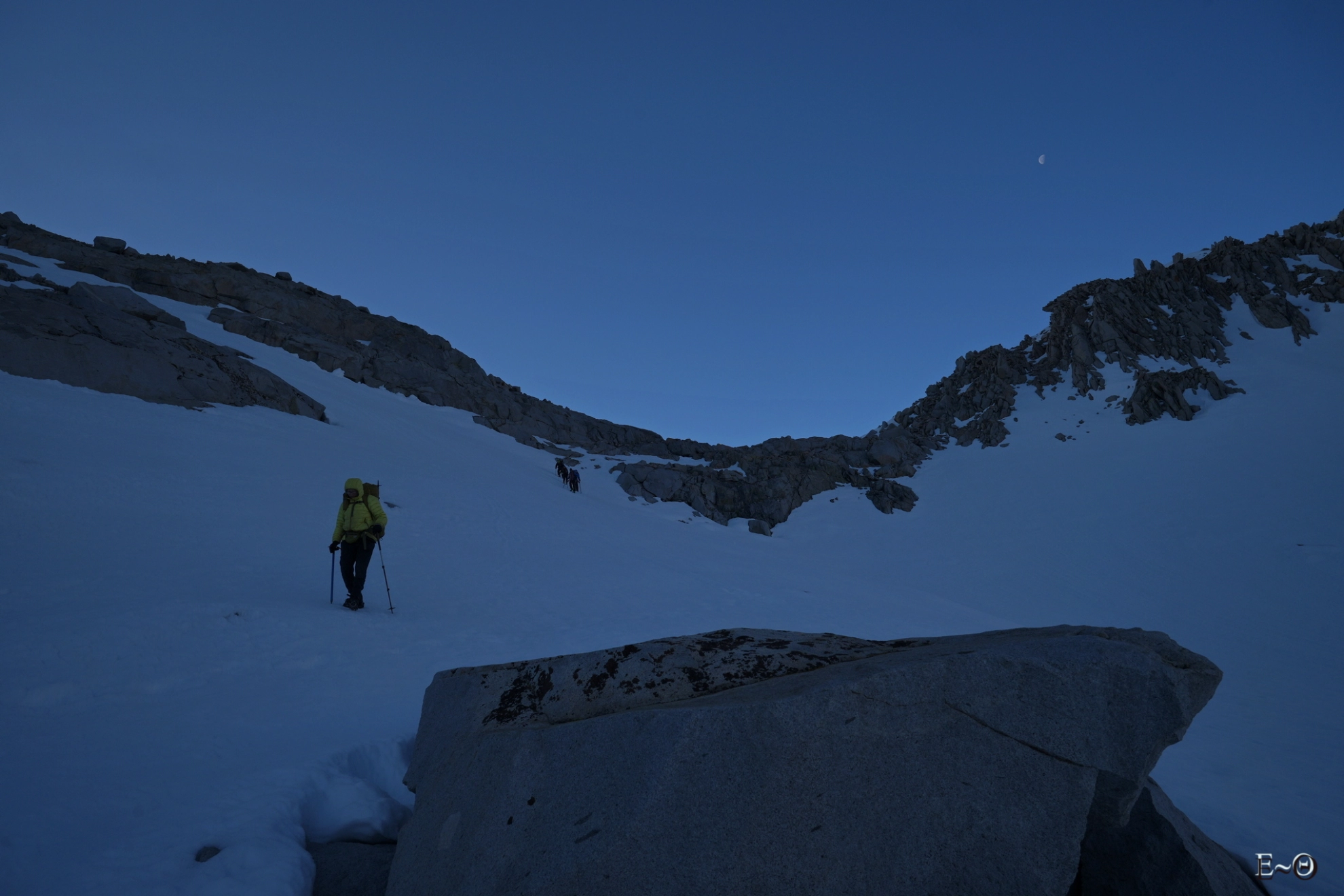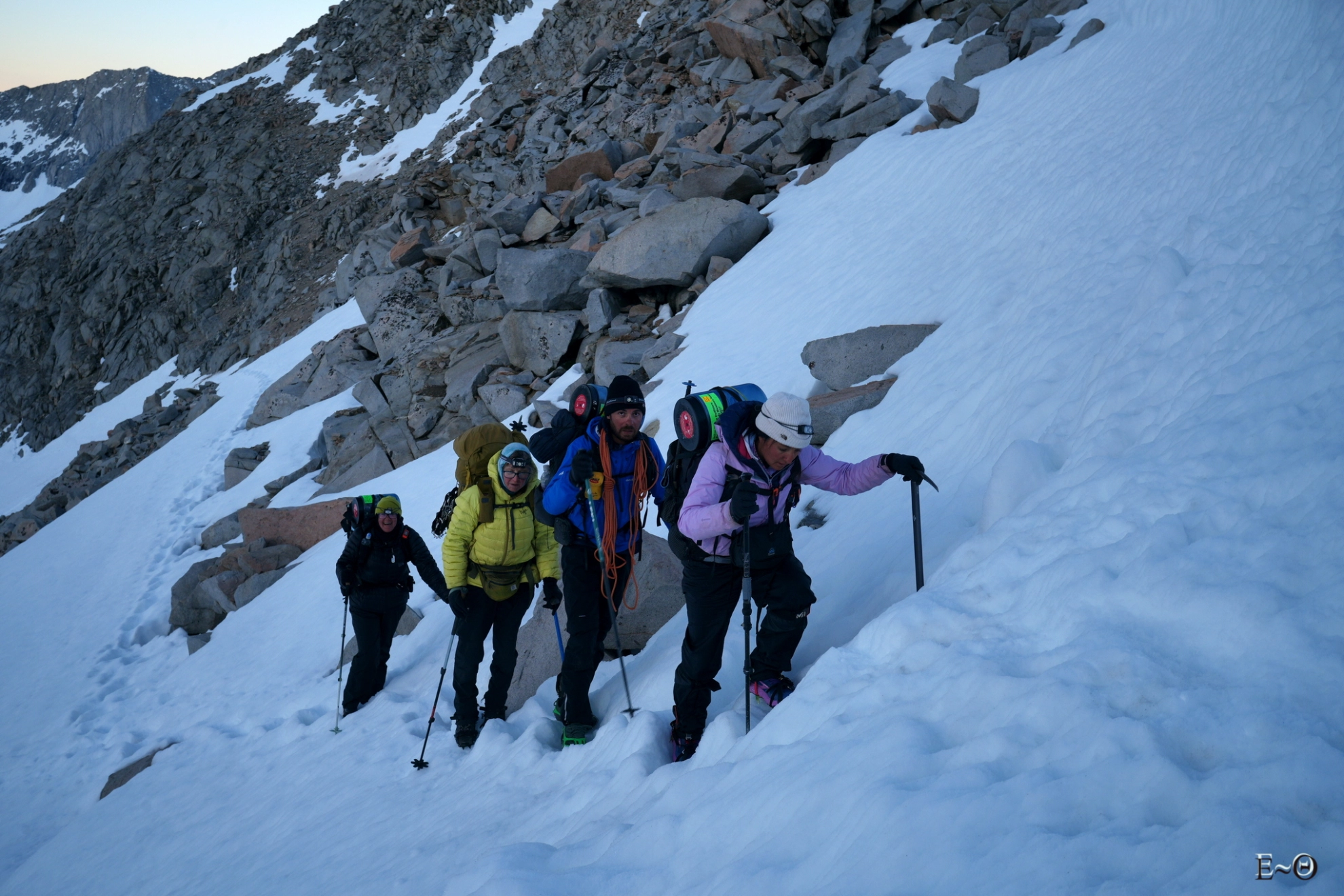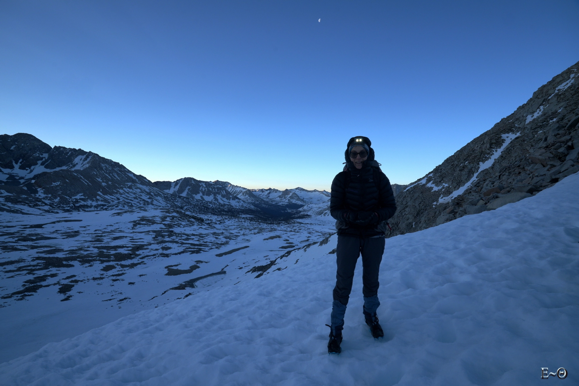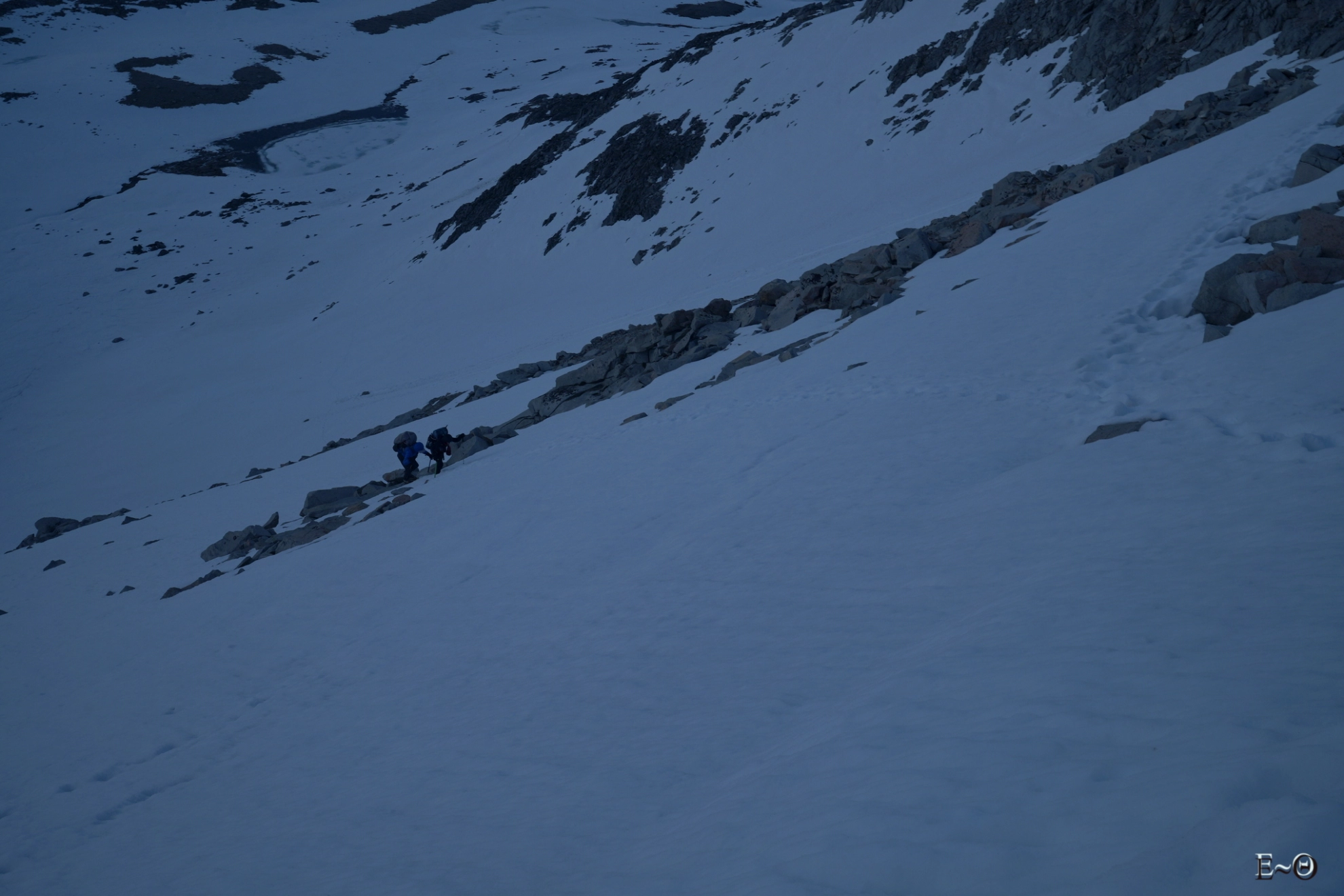 Après un lever à 2 h du matin, et un départ à 3 h, ce sera pour le groupe une ascension dans le noir et une ambiance très haute montagne. Nous chaussons les crampons ou micro spikes, et à peine un kilomètre plus loin nous sommes dans la rampe à 45°. J’avais fait une reconnaissance la veille et avais bien repéré qu’il fallait absolument passer en montée de gauche à droite, pour rapidement arriver dans l’axe de l’immense pente. Malgré cette information, cruciale, ça ne loupe pas nous butons sous les falaises du milieu de couloir trop à droite. L’été c’est la trace officielle du PCT. En hiver c’est bien trop dangereux. Cela signifierait louvoyer entre 3 toboggans en glace à 50° et des parois de roches instables. Demi-tour.