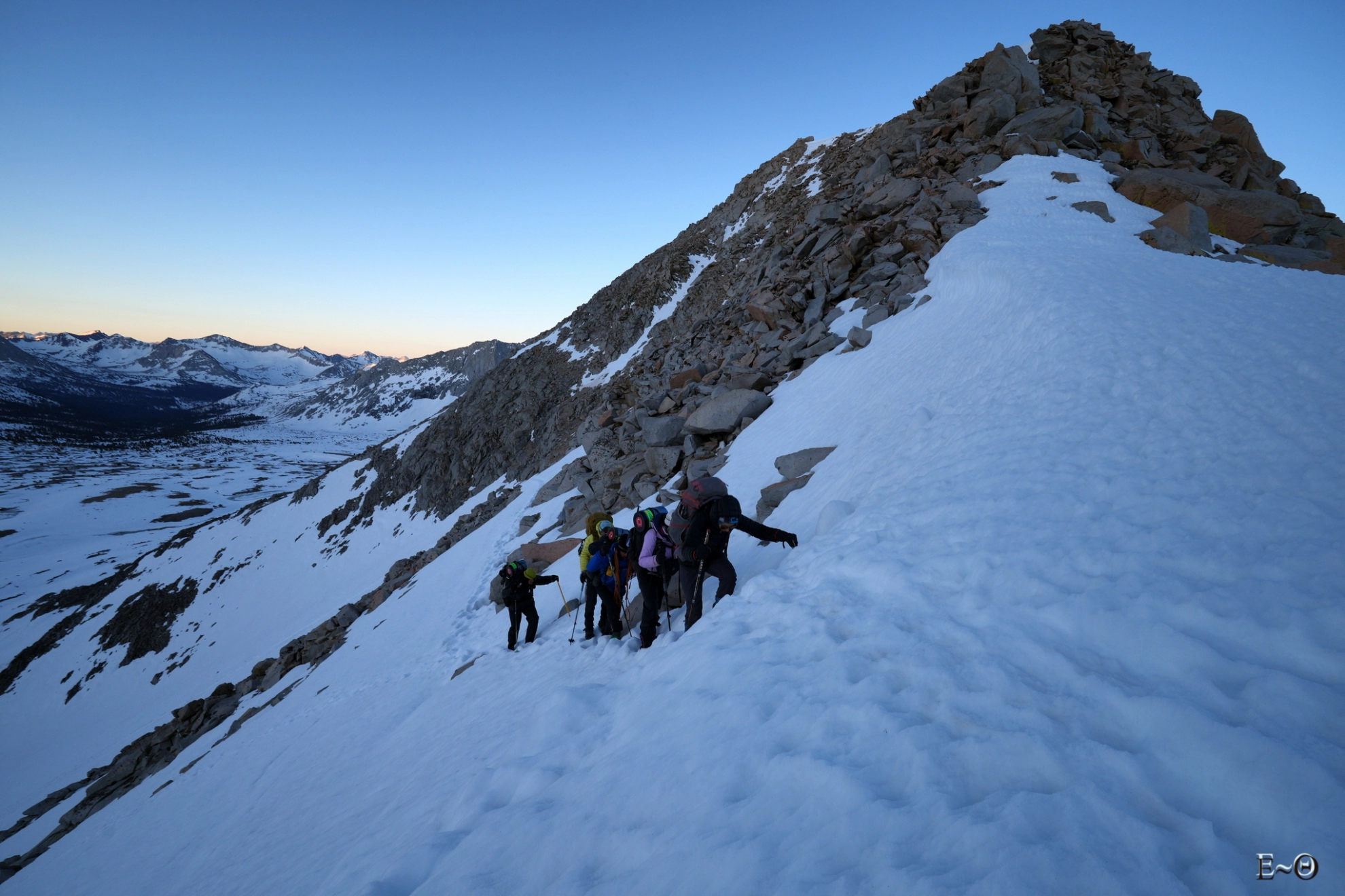 Nous sommes une cinquantaine de mètres sous le PCT officiel qui nous nargue. Nous devinons le muret du chemin taillé dans la roche. Il est recouvert de névés et son inclinaison est un vrai repoussoir. Nous avons bien fait de passer par dessous, même si cela impose une progression de bouquetins de compétitions. Les traces se redressent franchement sur la fin, obligeant à poser les mains. L’éboulis de cailloux instables n’est pas très engageant, mais bon, il serait malvenu de vouloir faire demi-tour maintenant. La concentration du groupe est palpable. Chacun est vigilant à ce que tout se finisse au mieux. Je sens qu’il est temps d’arriver, plusieurs d’entre nous ont quitté leurs zones de confort depuis un moment. La dernière section avant de franchir la corniche qui a été taillée par les précédents hikers est splendide.