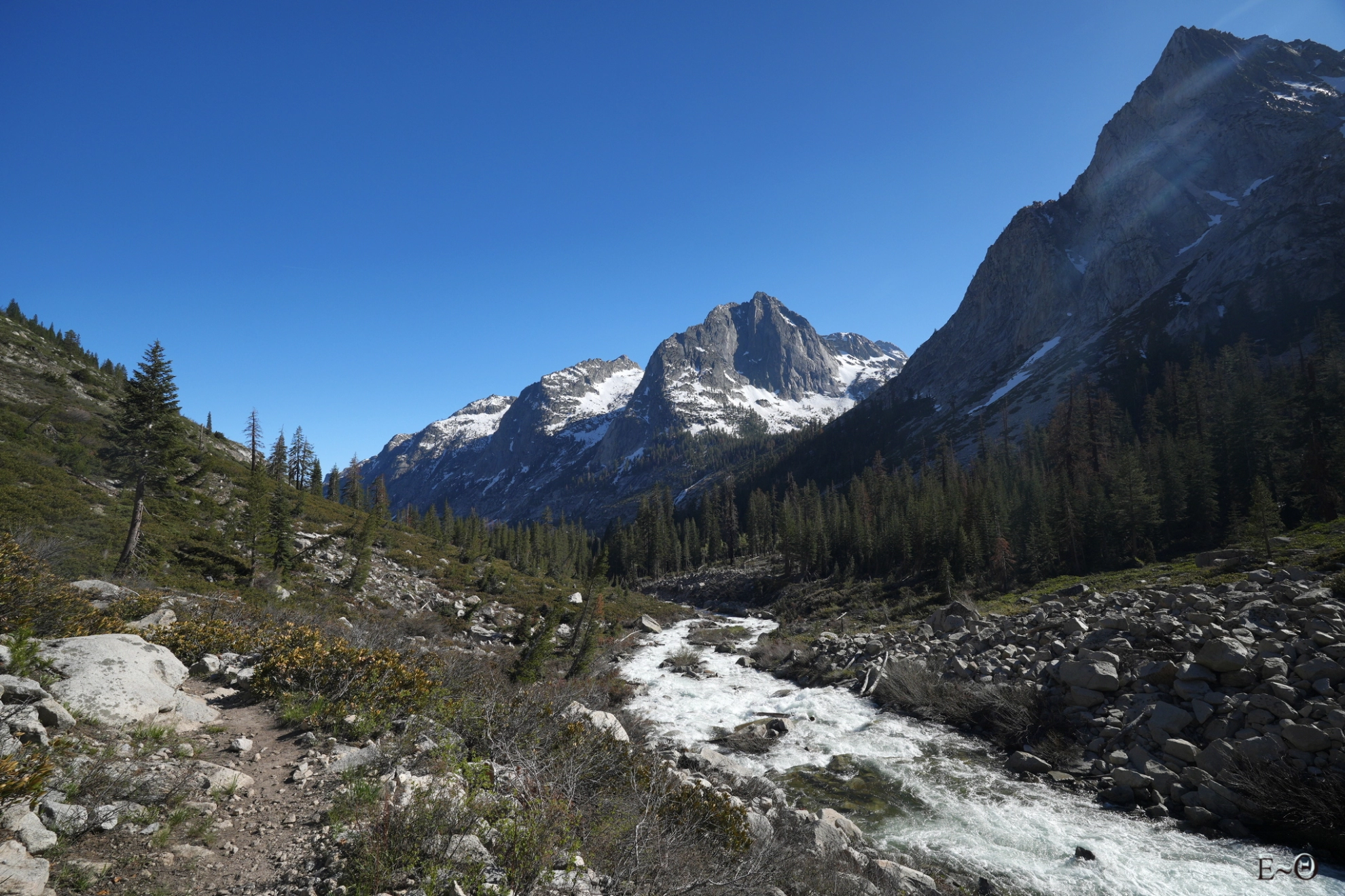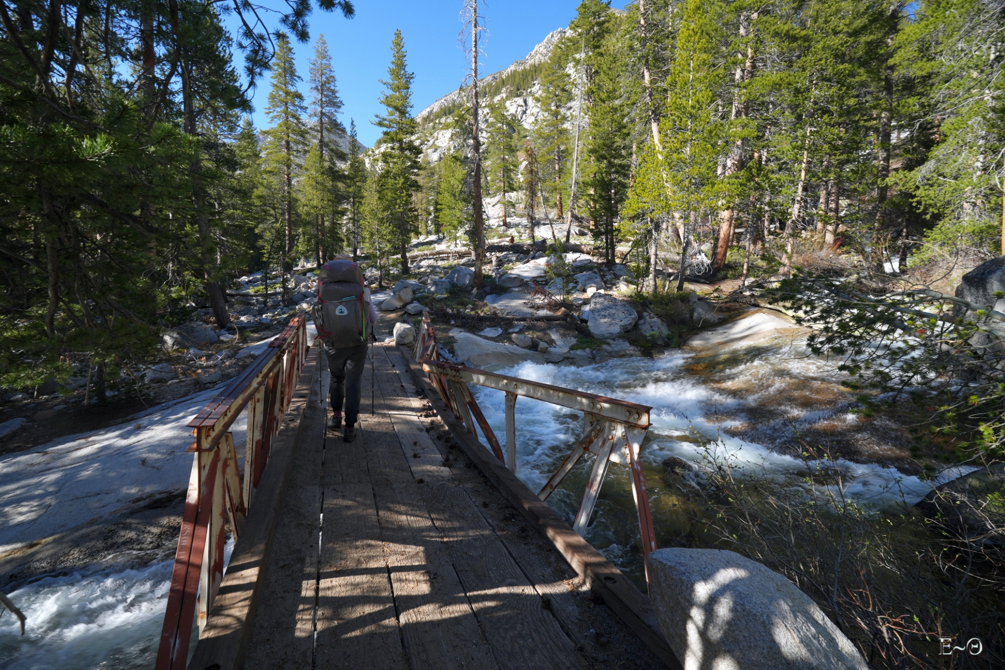 La poursuite de cette longue journée sera plus tranquille. Nous longeons pendant 10 km un torrent, Palissade Creek, en crue, sous les pentes de Knapsack Peak au nord et de Rambaud Peak au sud. Le canyon de Deer Meadow est majestueux et le chemin taillé dans la falaise. C’est un tour de force que d’être passé ici. Nous aurons la chance de voir un bobcat, félin proche du lynx, puis un troupeau de biches à moins de 10 m. Cool.
