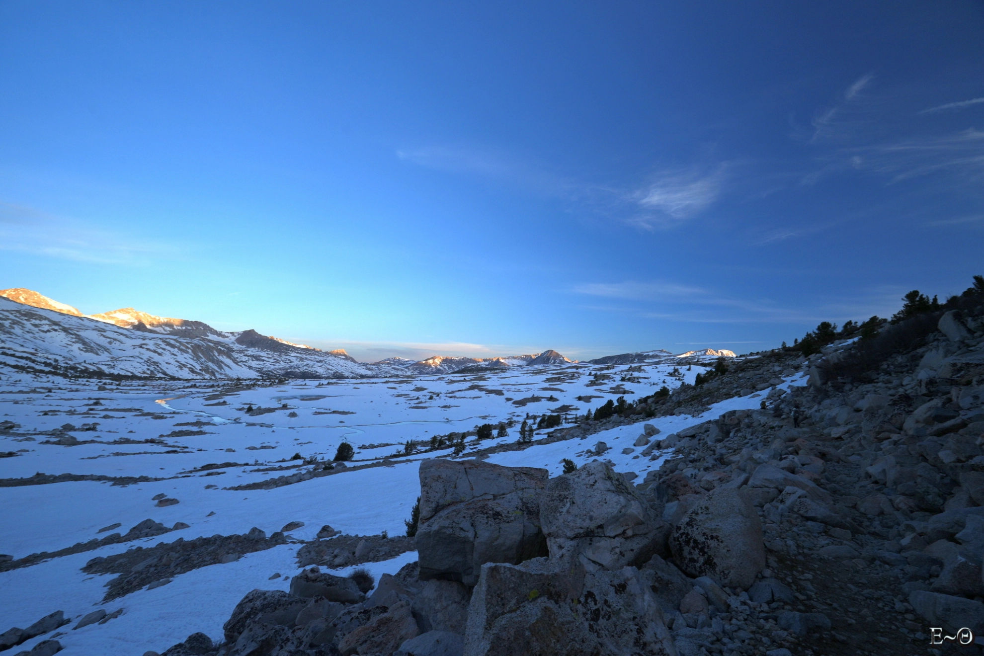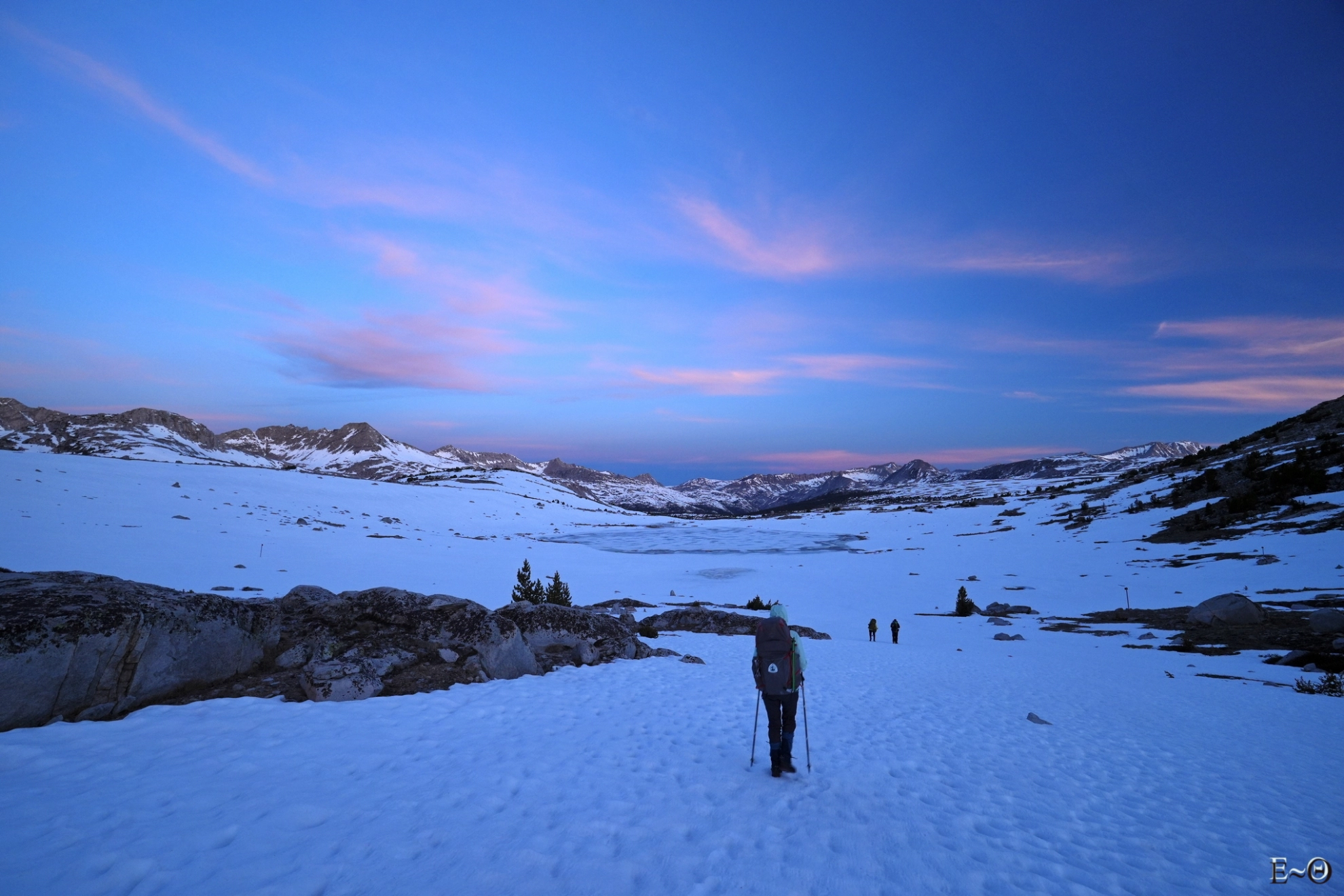 Nous nous levons tôt de nouveau pour profiter de la neige durcie et avancer au plus vite. Il y a peu de kilomètres, mais la trace est peu évidente. Il n’y a pas, tout du moins au départ ce matin, de cheminement évident. Le plus simple dans ce cas est d’aller à l’azimut, de points remarquables en points remarquables. Nous quittons le camp à 5 h 30, avant le lever de soleil. Nousfilons plein nord, en contournant le lac gelé de Summit Lake. Le plateau à l’ouest du col de Piute est immense et nous y passerons presque 1 h 30.