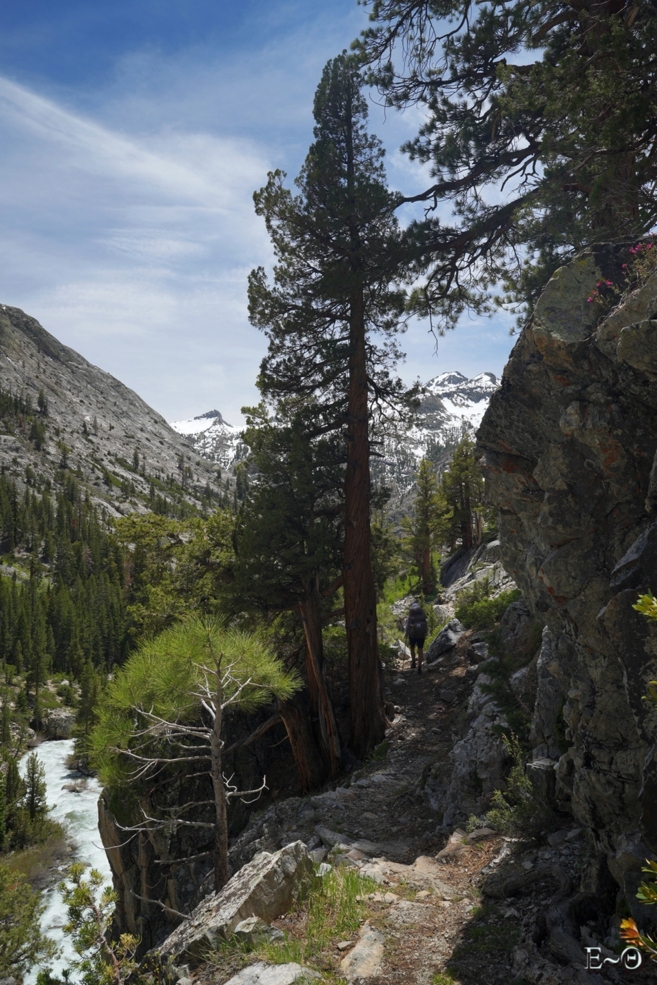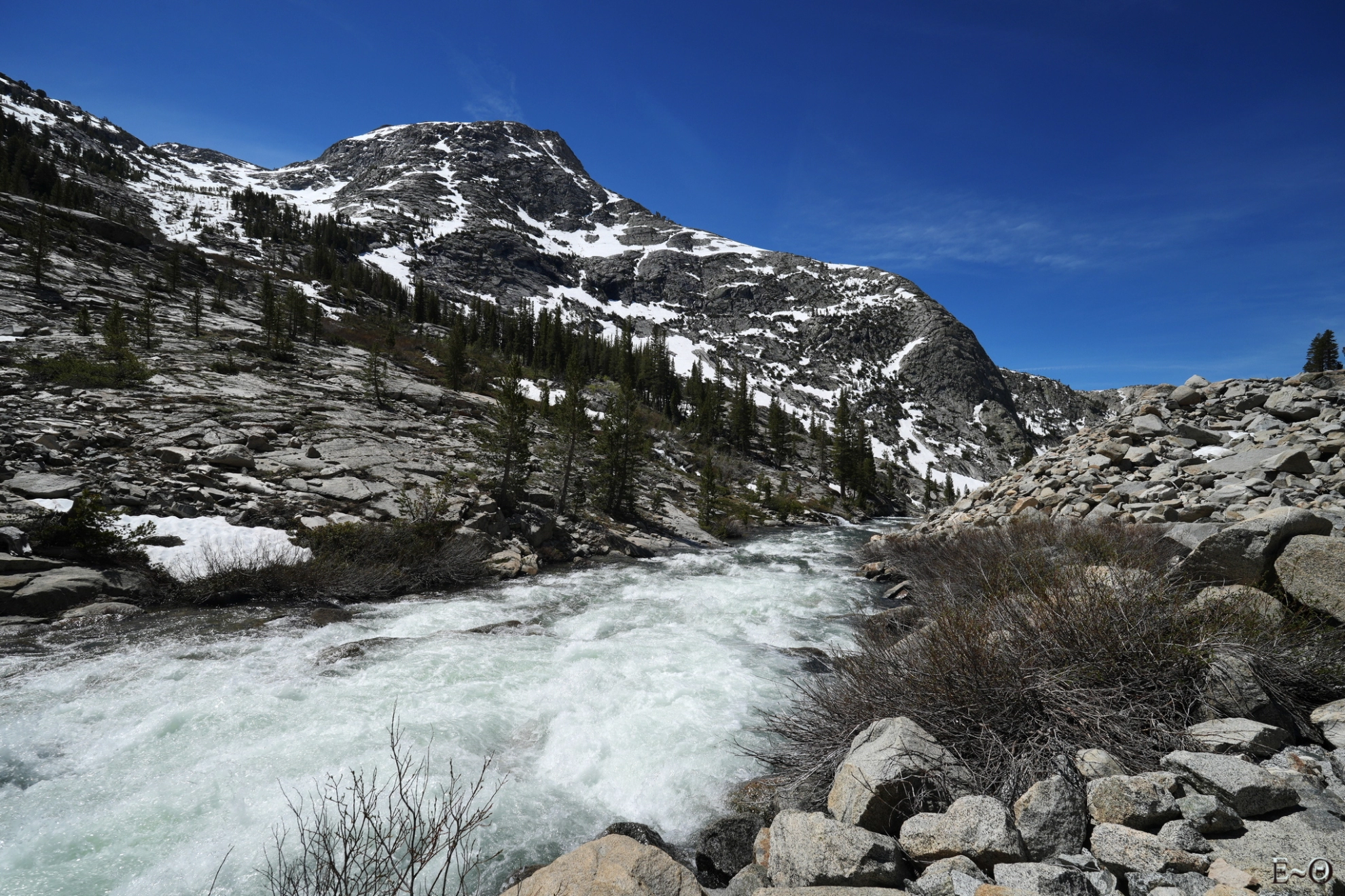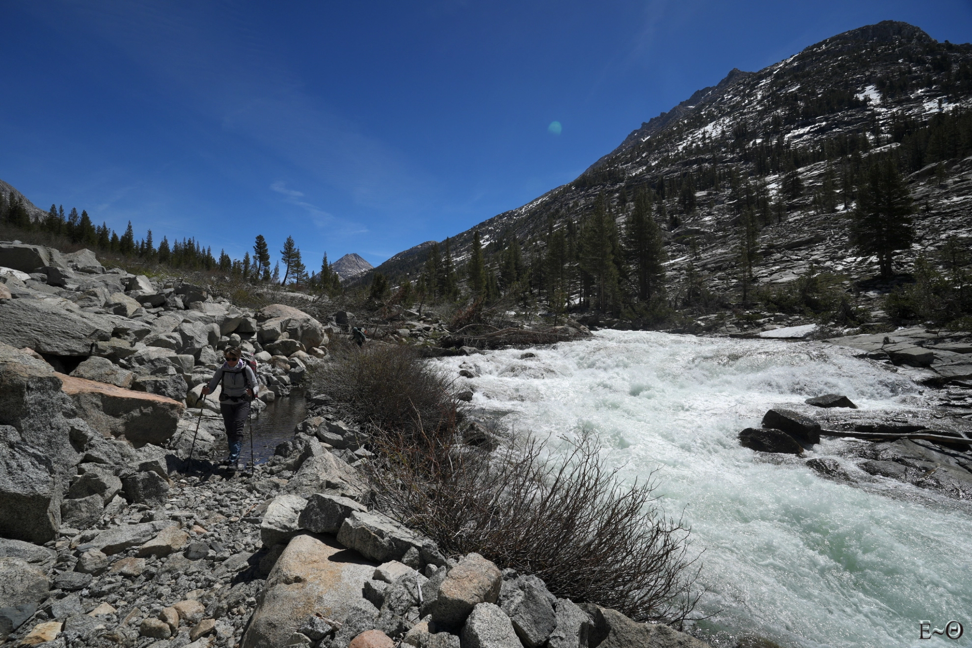 Il est devenu illusoire de garder les pieds aux secs et du coup, on reste la journée en chaussettes humides. C’est d’autant plus vrai que le nombre de river crossing est record. Nous devons même franchir une section bien tonique, à la jonction de Piute Canyon et de French Canyon, de cinq torrents en 150 m. Les débits sont maintenant à considérer avec sérieux. L’eau pousse fort et il est aisé de faire un faux pas. La seule bonne nouvelle c’est que la cryothérapie version Sierra est excellent pour les courbatures. Nous sommes tous en forme et cela se sent. Dès que le chemin devient facile à marcher, les gens avancent vite.