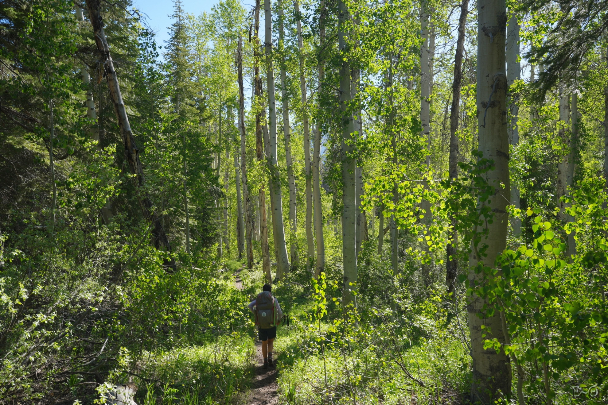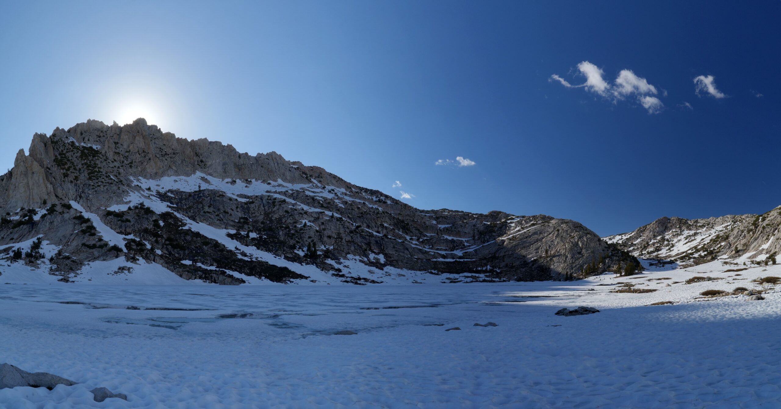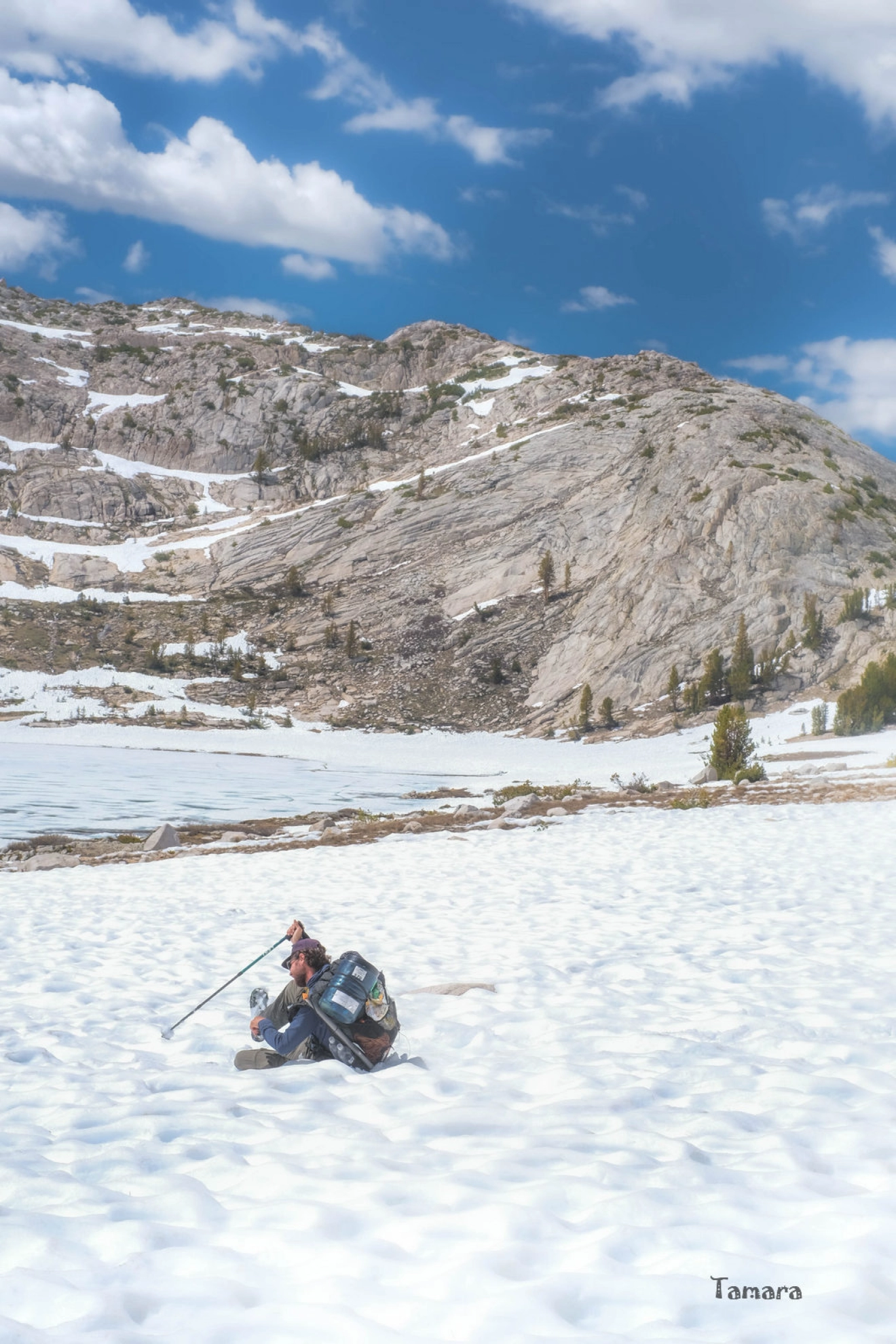 Nous n’avons pas une grosse journée, et devrions être vites au campement. L’objectif du jour est le lac situé juste sous le col de Silver. C’est l’un des derniers passages d’altitude de la Haute Sierra et nous souhaitons y être tôt, car le dégel a commencé. On est sur des taux de fonte record, atteignant entre 35 et 90 % du manteau neigeux cette semaine. Nous avons bien constaté que la progression sur la neige est maintenant devenue un sacerdoce. L’autre conséquence, c’est l’augmentation spectaculaire du débit des torrents et des rivières. Franchir ceux-ci en matinée est un gage de sécurité indéniable.