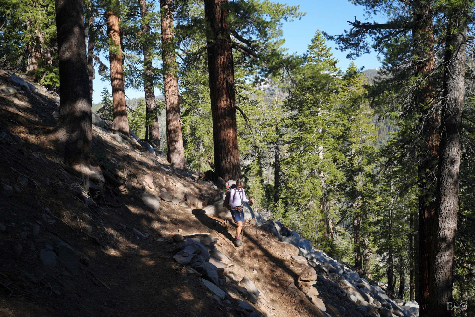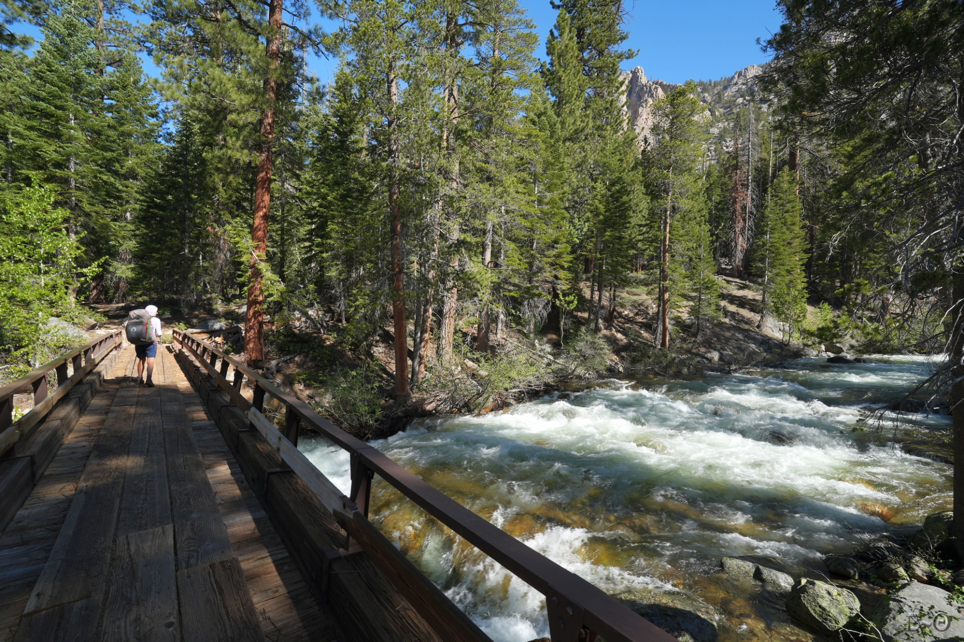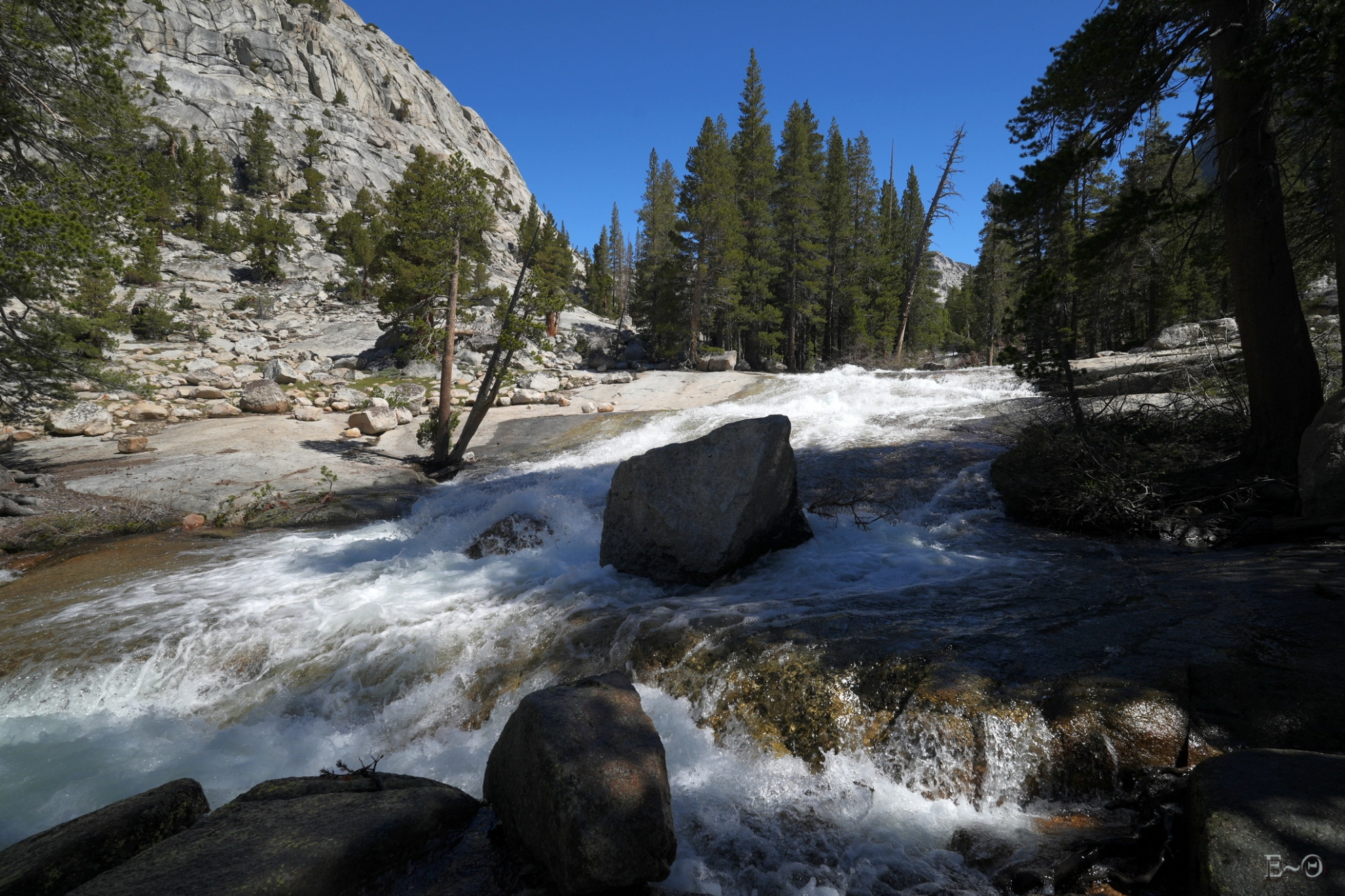 D’ailleurs aujourd’hui nous avons probablement effectué les river crossing les plus toniques. Le premier, North Fork Mono Creek, d’une largeur d’une dizaine de mètres se passera avec de l’eau en haut des cuisses. Le courant est violent, mais le sol est peu caillouteux, et nous avançons sans difficulté aucune. Nous longeons ensuite la rivière en rive gauche puis, pour aller de nouveau en face, retraversons de nouveau celui-ci.
