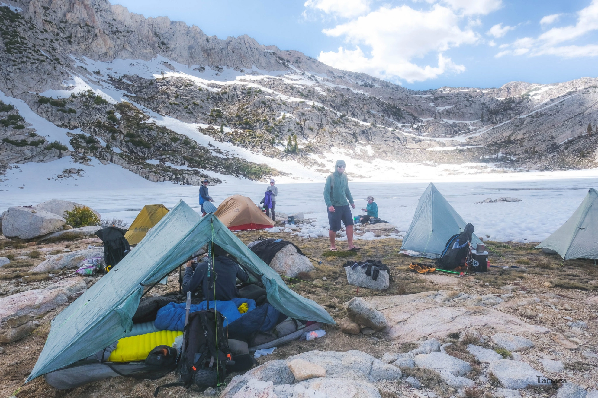 Nous arrivons sur une épaule qui surplombe le lac et constatons que la zone de campement officielle est encore couverte de neige. Il va être impossible de pouvoir s’installer, le sol est trop mou et humide. Après une vingtaine de minutes de recherche, en nous séparant, Janet, Hélène et moi, finissons par trouver un espace en terre juste à quelques mètres du lac. De loin cela semblait peu évident, mais ce sera LE bon emplacement pour six tentes.