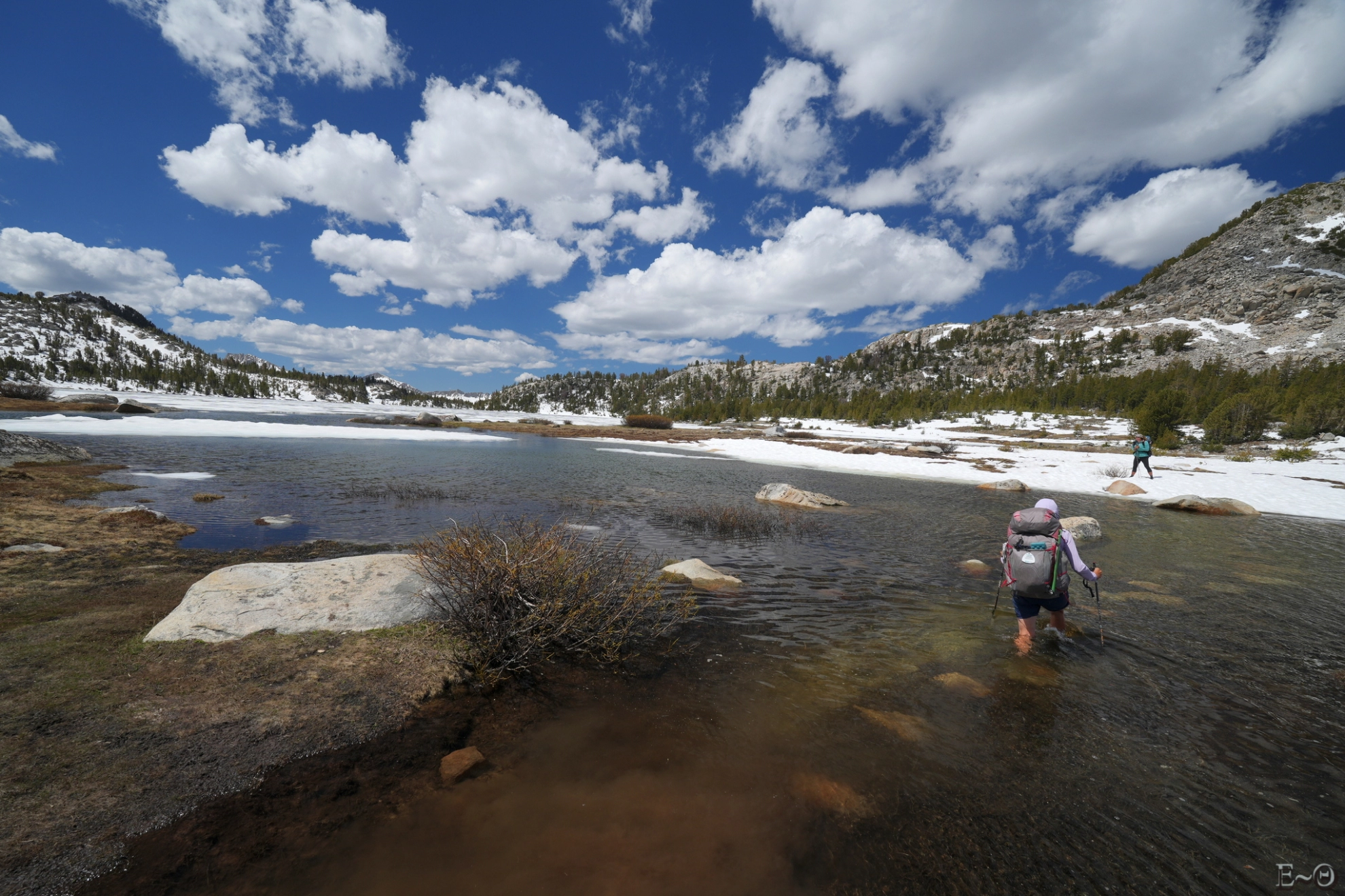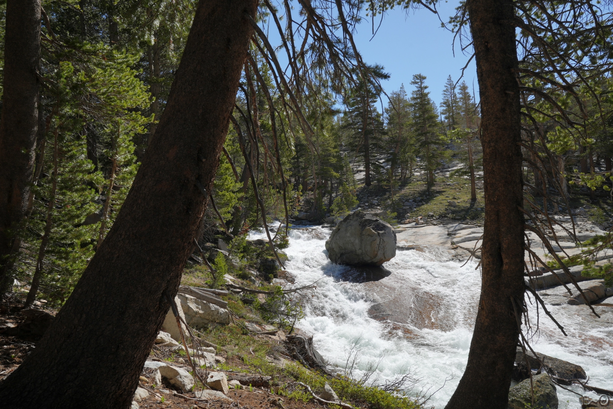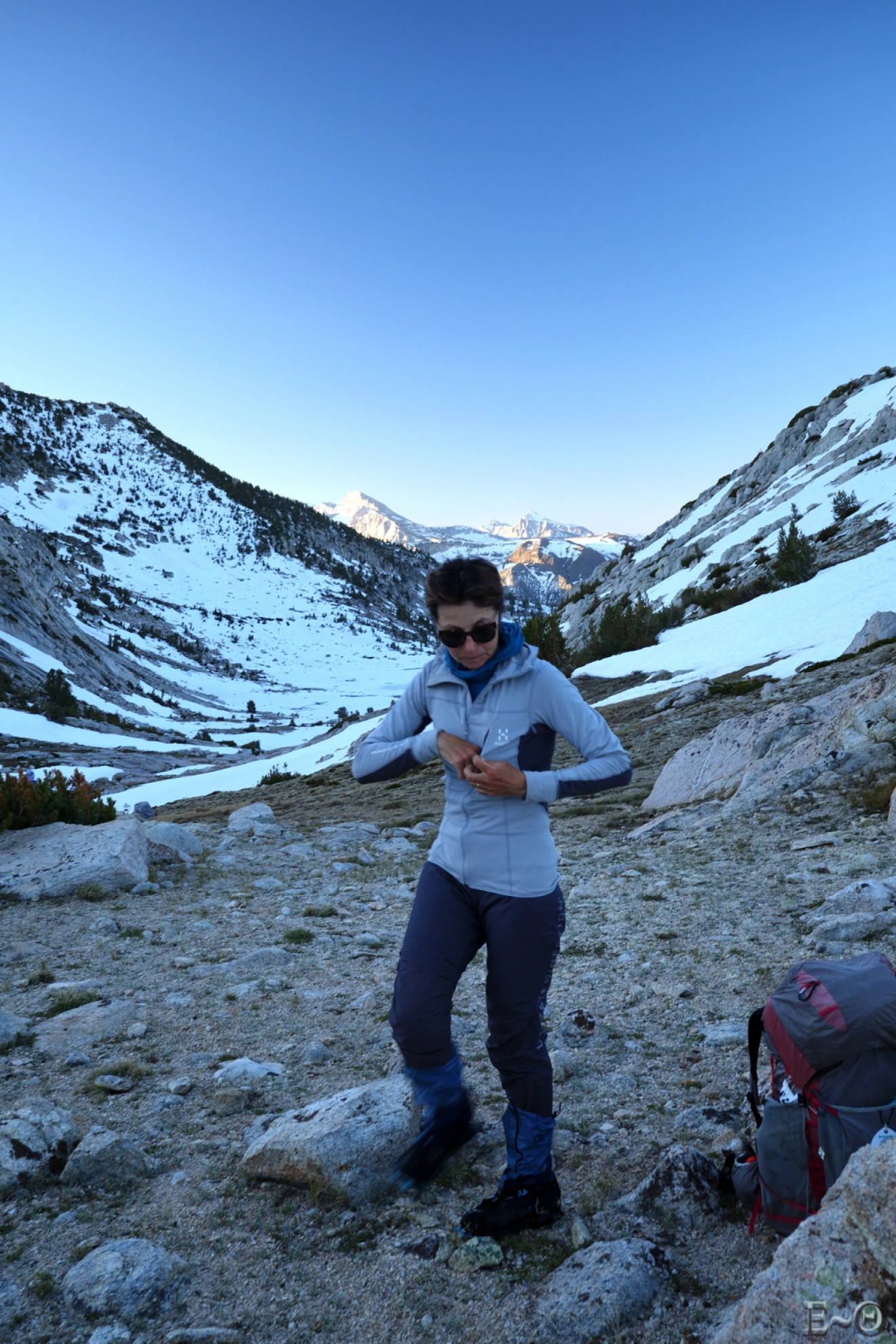 Nous descendons en direction de Cascade Valley, puis remontons le long de Fish Creek jusqu’à Tully Hole. Nous sommes maintenant en plein éveil de la nature. En dessous de 2800 m, les arbres, fleurs, herbes sont tous à éclore. Nous sentons que nous quittons la Haute Sierra. Les sommets sont moins couverts de neige. Nous sommes passés de l’hiver au printemps sans transition. Nous pouvons enfin recommencer à nous mettre en T-shirt. Sauf que les moustiques buveurs de sang émergent de leurs torpeurs. Et c’est réellement pénible.