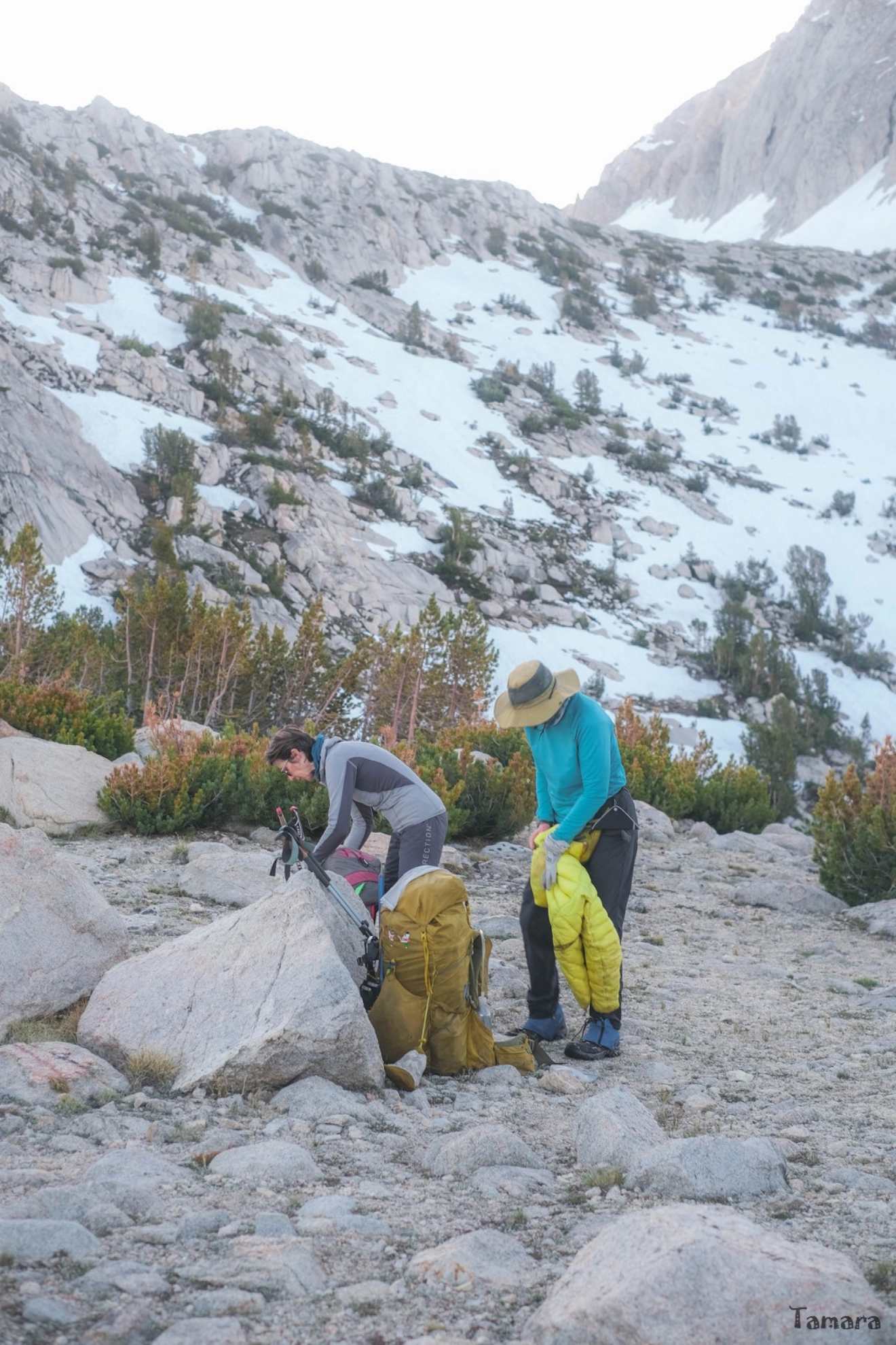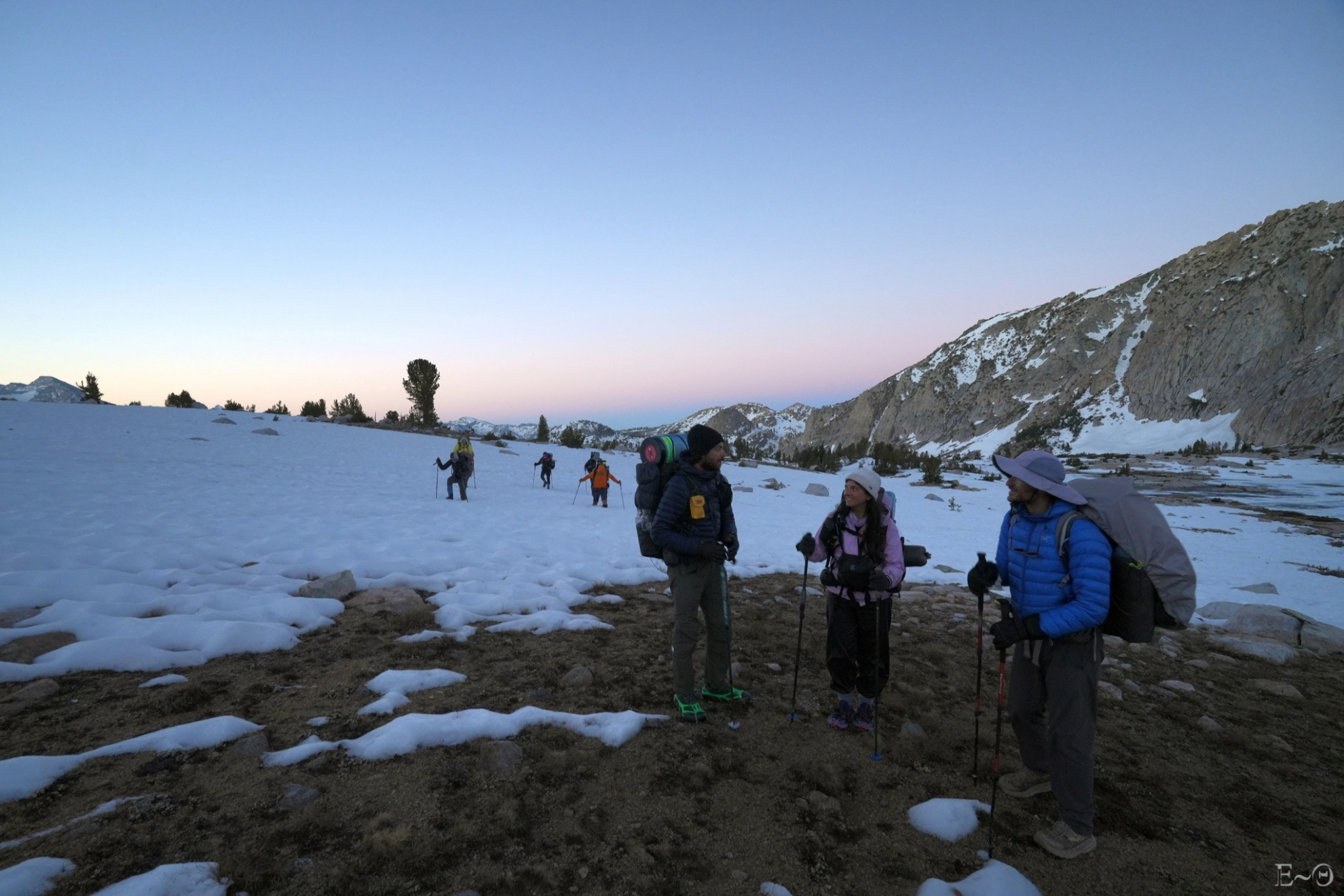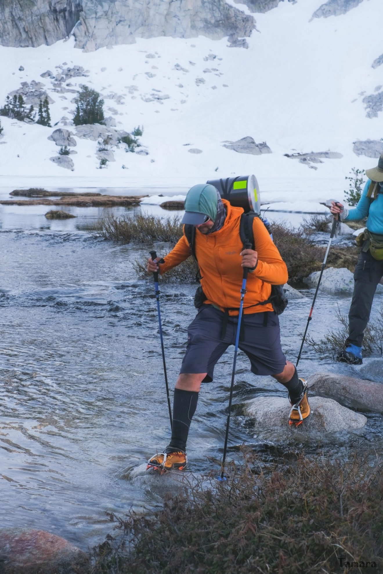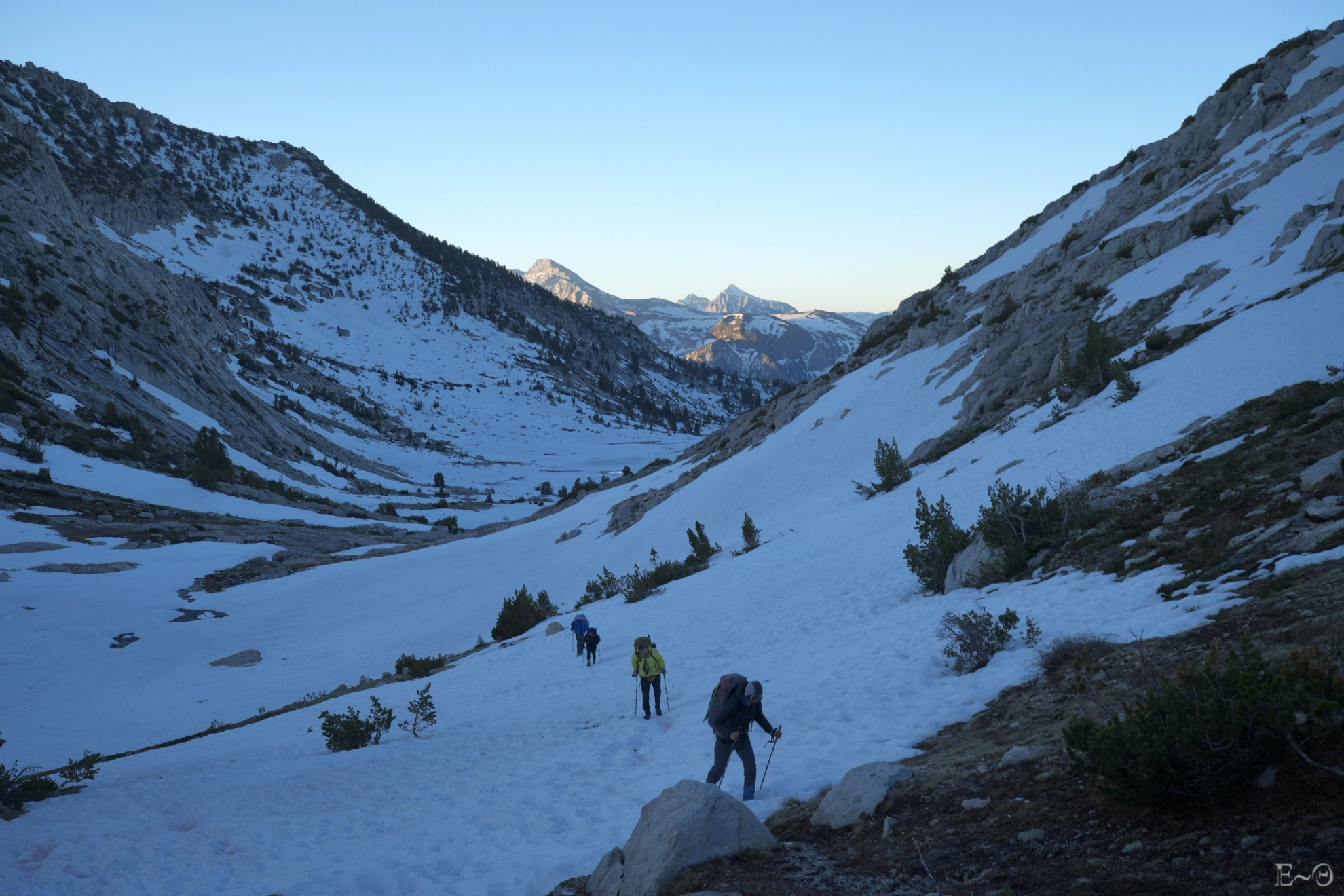 Le réveil est frisquet, mais nous avons la désagréable surprise de constater que la couche de regel n’est plus portante. Les températures sont plus clémentes et pourtant nous sommes à plus de 3100 mètres d’altitude. Cela n’augure rien de bien évident pour la suite. Effectivement, la montée au col, sera de nouveau une immense expérience de post holling. Nous sommes tous à en rire. Aucune trajectoire ne permet d’être tranquille. La palme revenant à IceBreaker qui n’aura jamais autant justifié son trail Name. Nous avons l’impression par moment de tailler une tranchée glacée, et avançons tous hors de la trace officielle du PCT au mieux.
