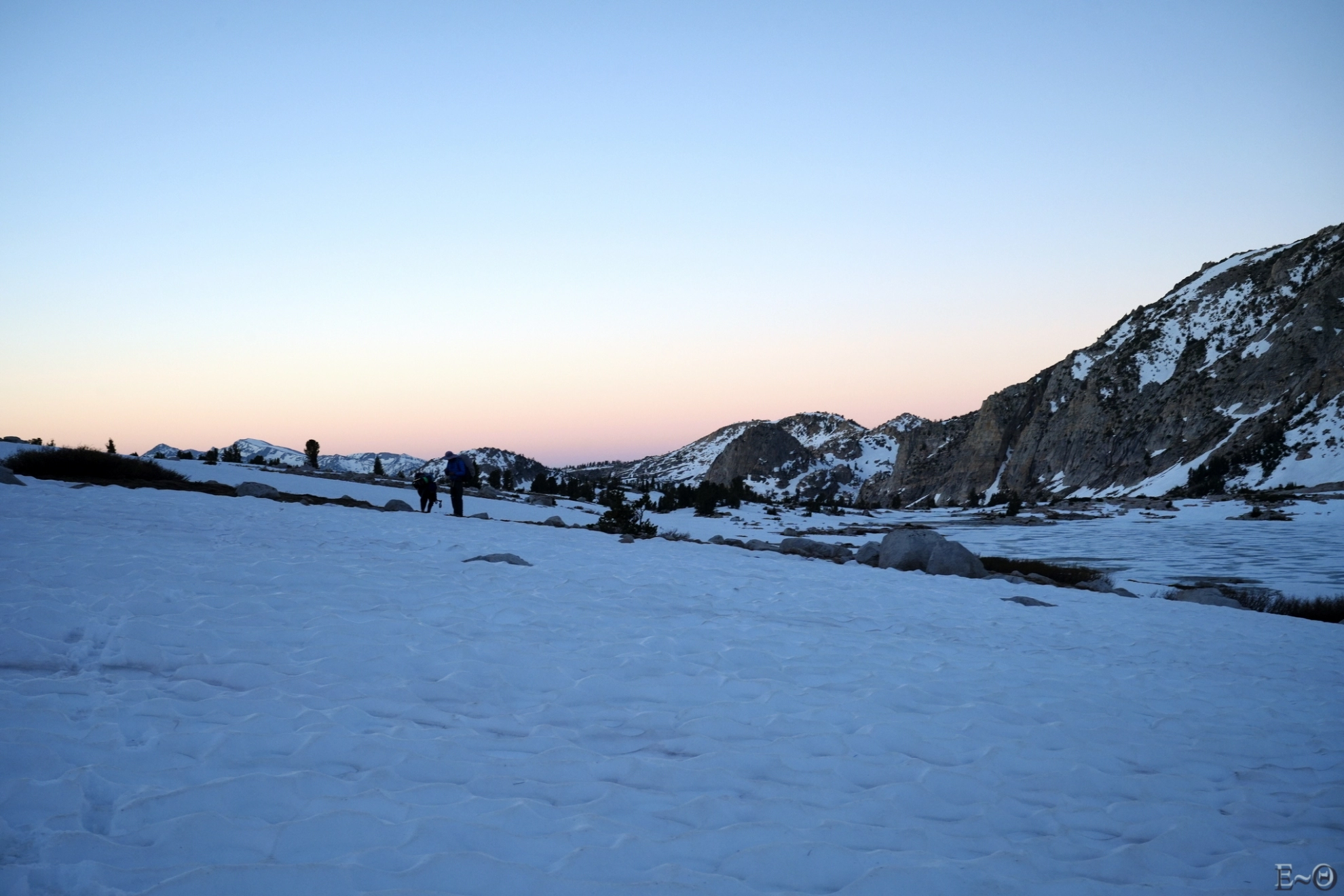 Au col, nous surplombons Chief Lake. Nous ne partons pas en sa direction. Étonnamment nous montons encore une centaine de mètres en flanc droit et passons une épaule, contre fort du mont Evon. Nous prenons le temps de faire des photos, constatons que nous aurions peut-être pu dormir un peu plus. Point n’est grave nous profitons des couleurs orangées du levant et regardons le soleil franchir les crêtes de Warrior Ridge, au-dessus du lac glacé du même nom. Puis, le chemin avance en face nord et la neige redevient portante. Nous remettons les crampons pour ne pas glisser.