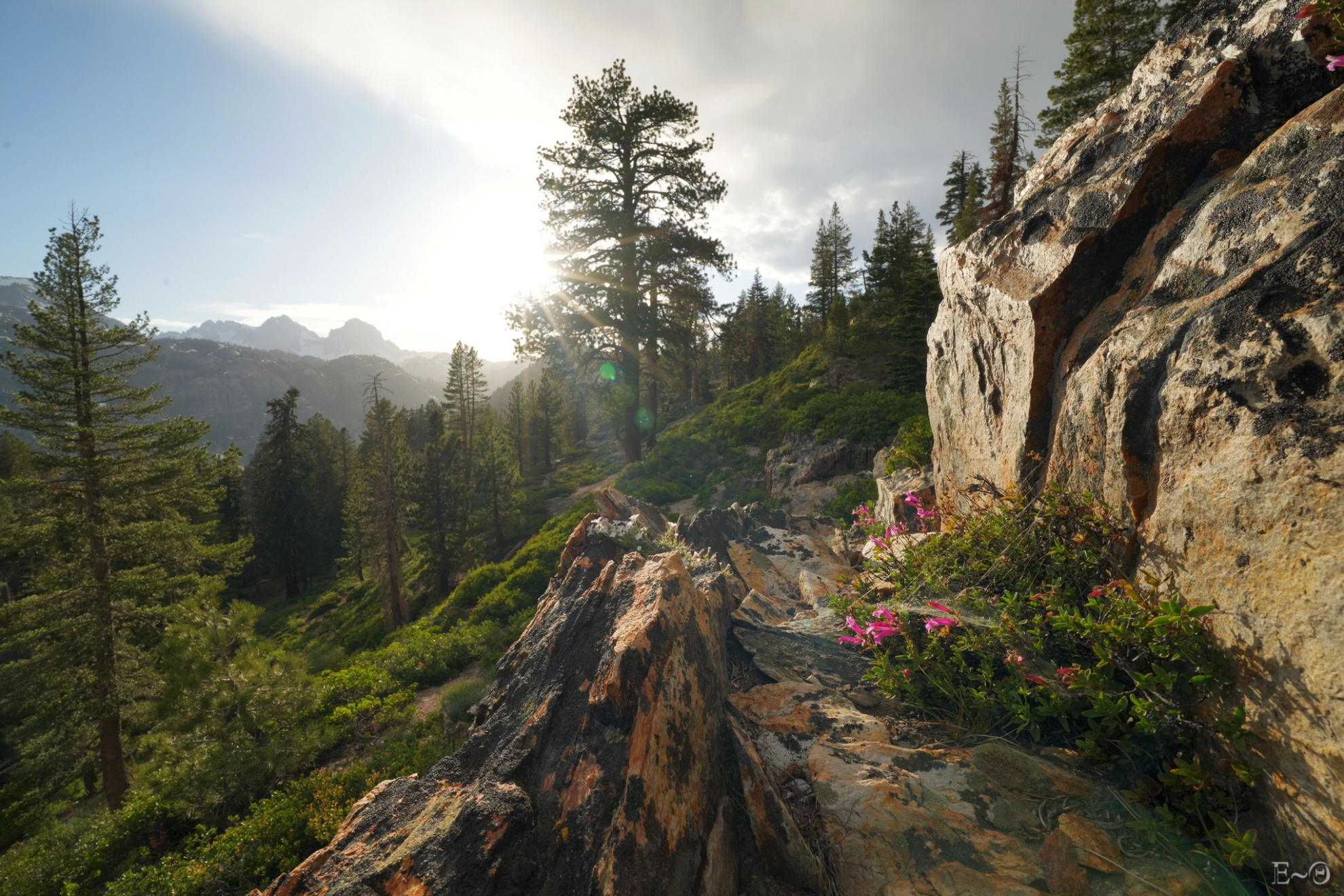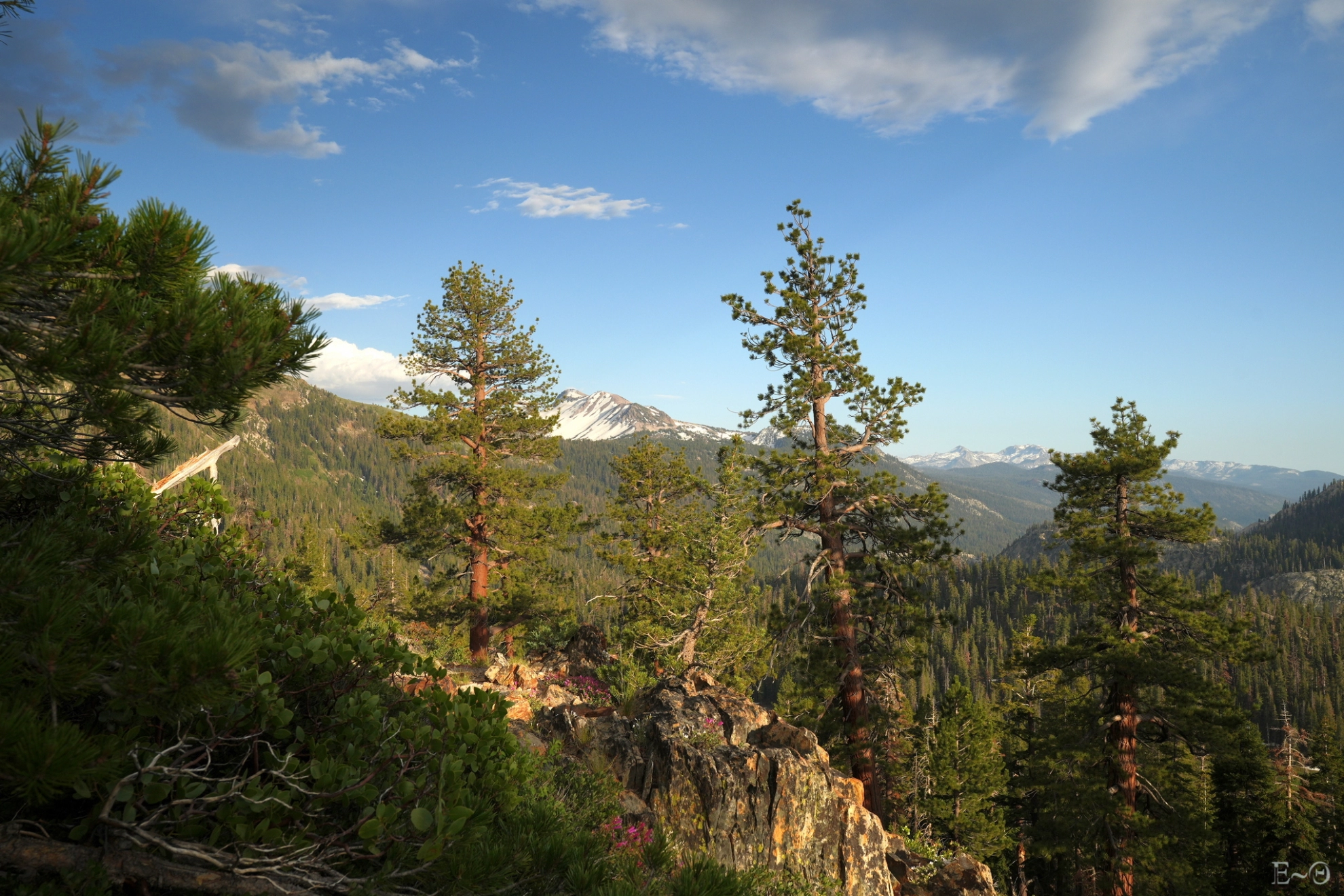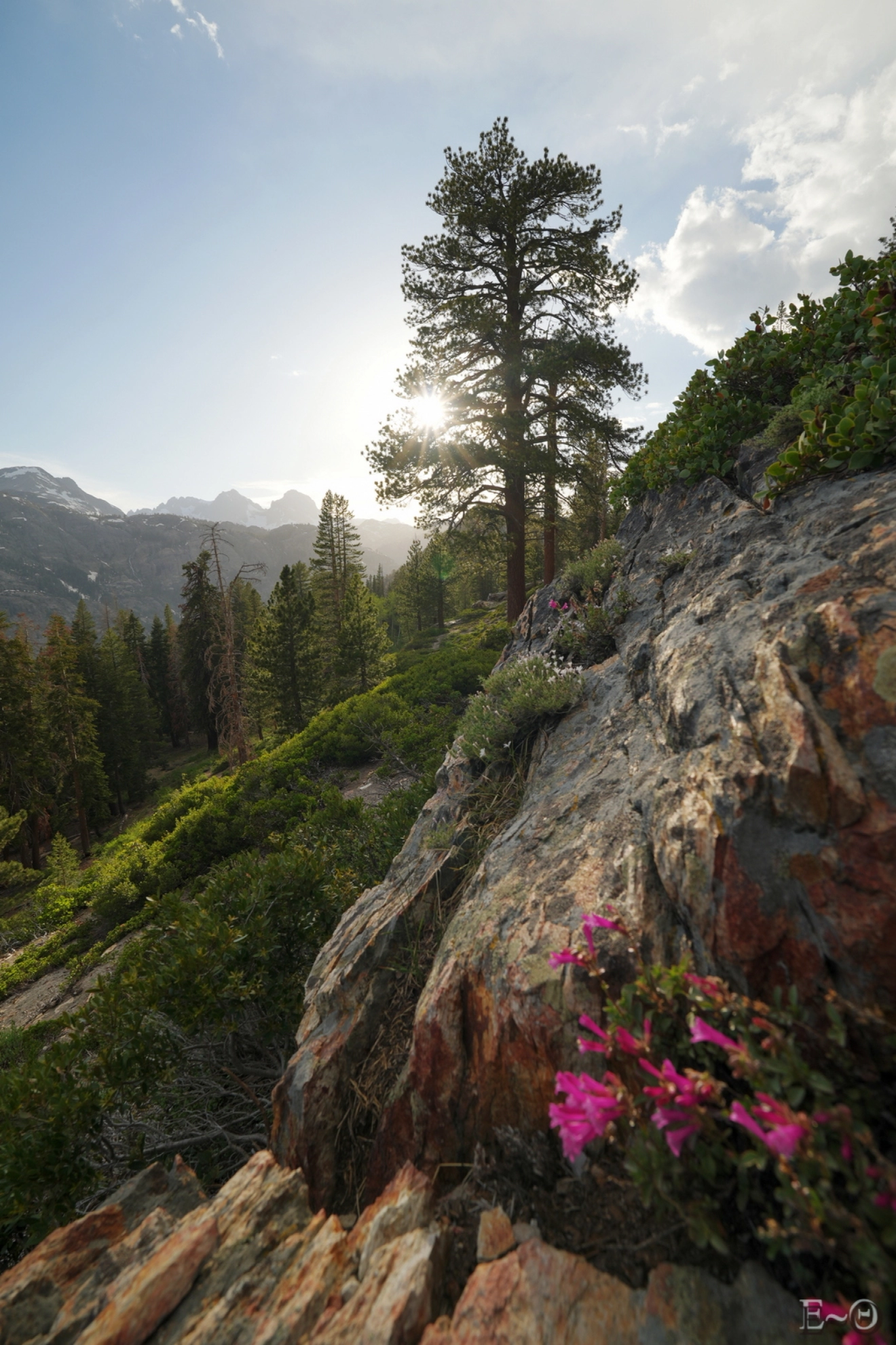 Le site de campement de ce soir est situé sur un éperon rocheux dans la vallée de Middle Fork San Joaquim River, au-dessus d’Agnew Meadows. Il y a encore beaucoup de moustiques, mais le lieu est particulièrement sympathique, plat, en surplomb sur la vallée, avec une rivière juste à côté pour l’eau.