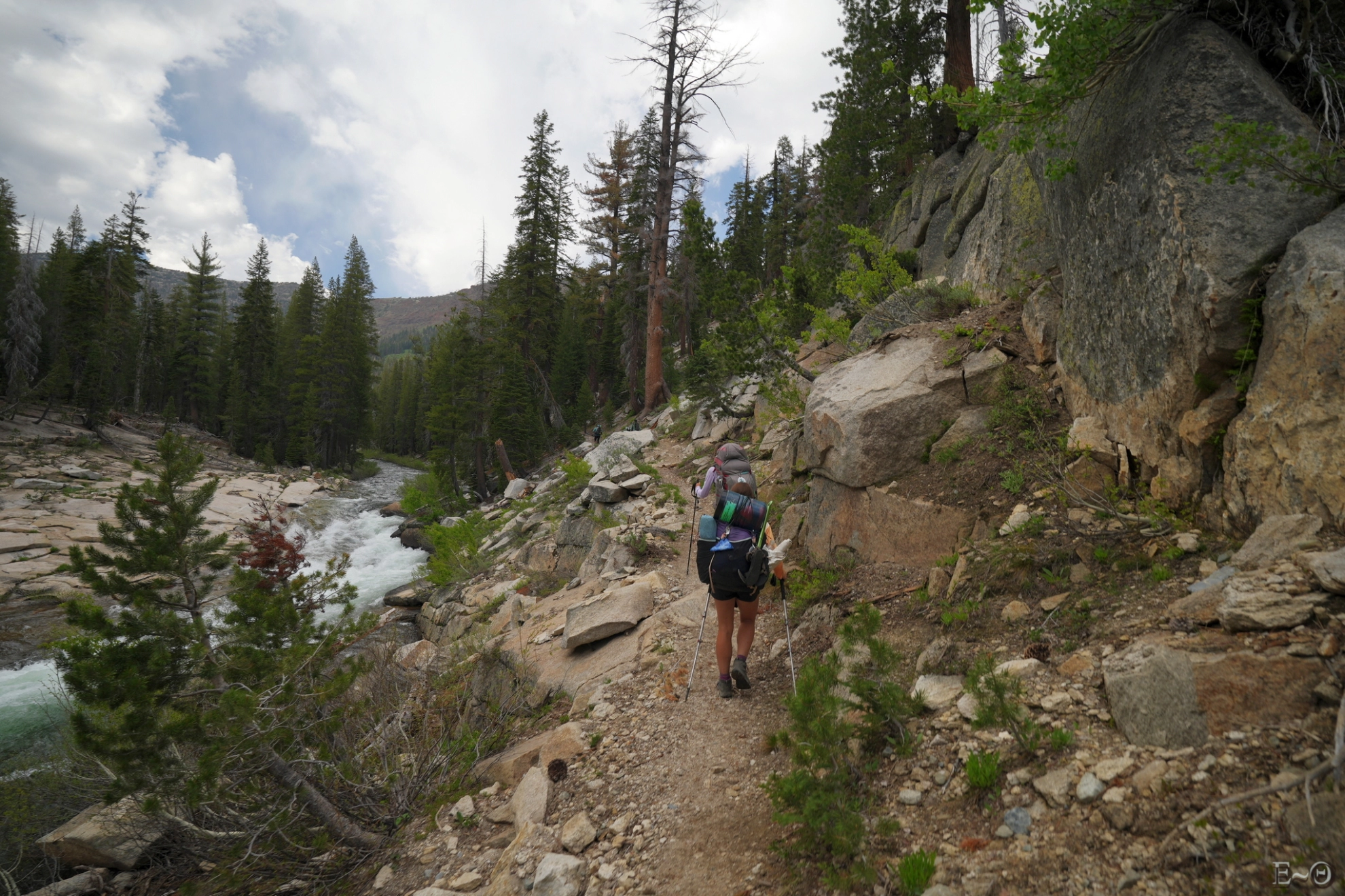 Nous ne reprenons pas le PCT à partir d’ici, le pont sur la rivière Middle Fork San Joaquim est brisé depuis l’hiver dernier. Le détour de 6 km oblige à rester en rive gauche, en face du chemin, ce qui n’est pas gênant. Nous en profitons pour visiter la curiosité géologique locale que sont les devils postpiles, à savoir des orgues basaltiques volcaniques. Elles sont impressionnantes même si elles n’ont pas l’ampleur de celles déjà vues en Islande. Nous ne sommes pas les seules à faire le tour. Comme de classique le tracé du PCT est à distance des points remarquables.