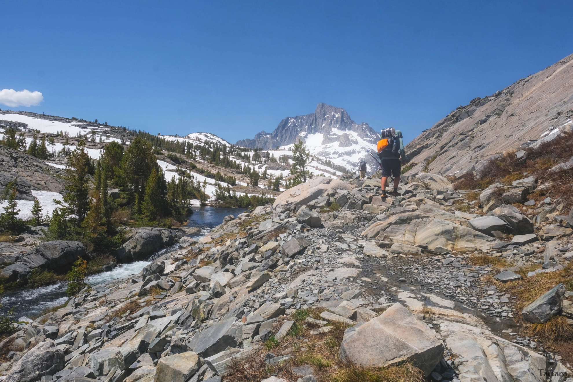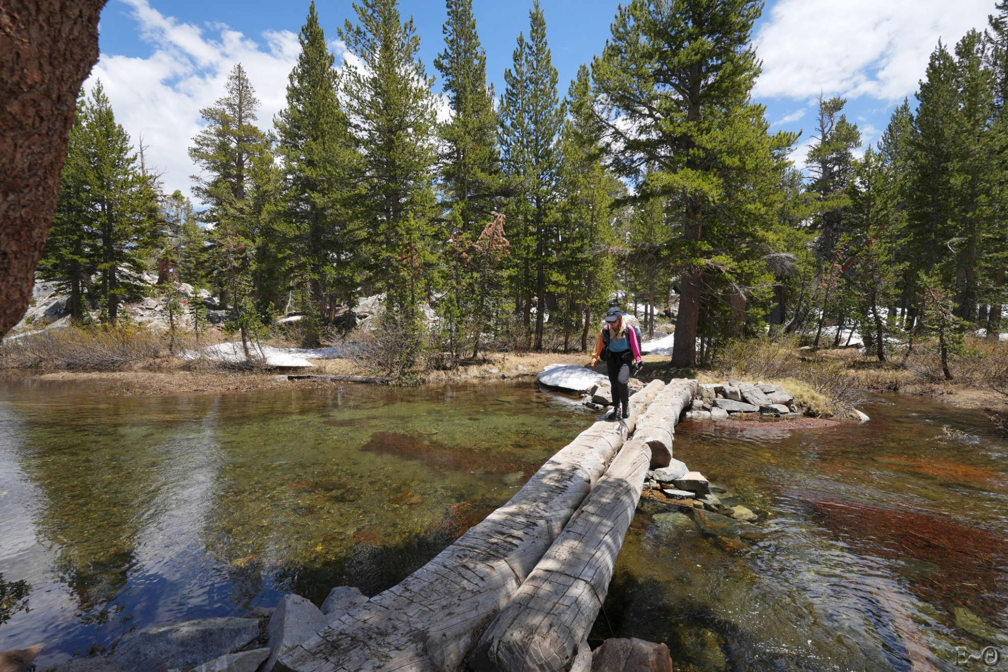 Nous repartons vers 14 h et recommençons à progresser au GPS, en suivant les lignes de faiblesses des packs de neiges, et en évitant les nombreuses mares qui se sont créées. En descente, nous rattrapons le PCT qui reste en rive gauche de la rivière Rush Creek. Nous nous heurtons régulièrement à des torrents gonflés par une abondante fonte. Ils sont d’habitude débonnaires et sont non décrits dans le topo. En période normale ils ne sont pas identifiés comme gués pouvant poser problème.
