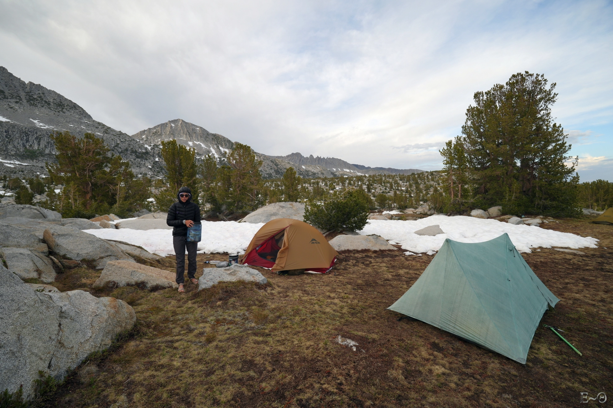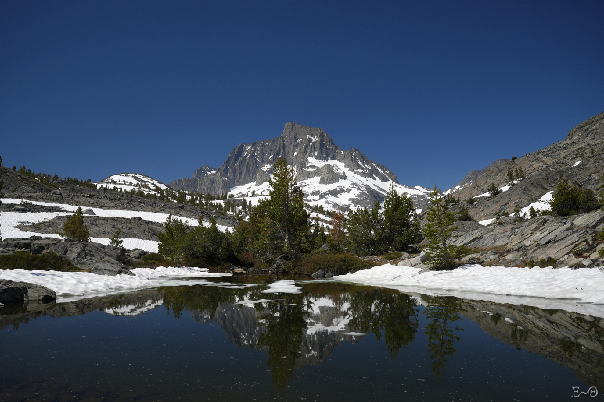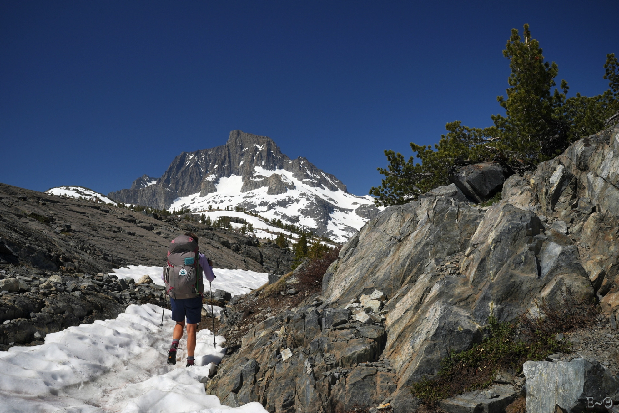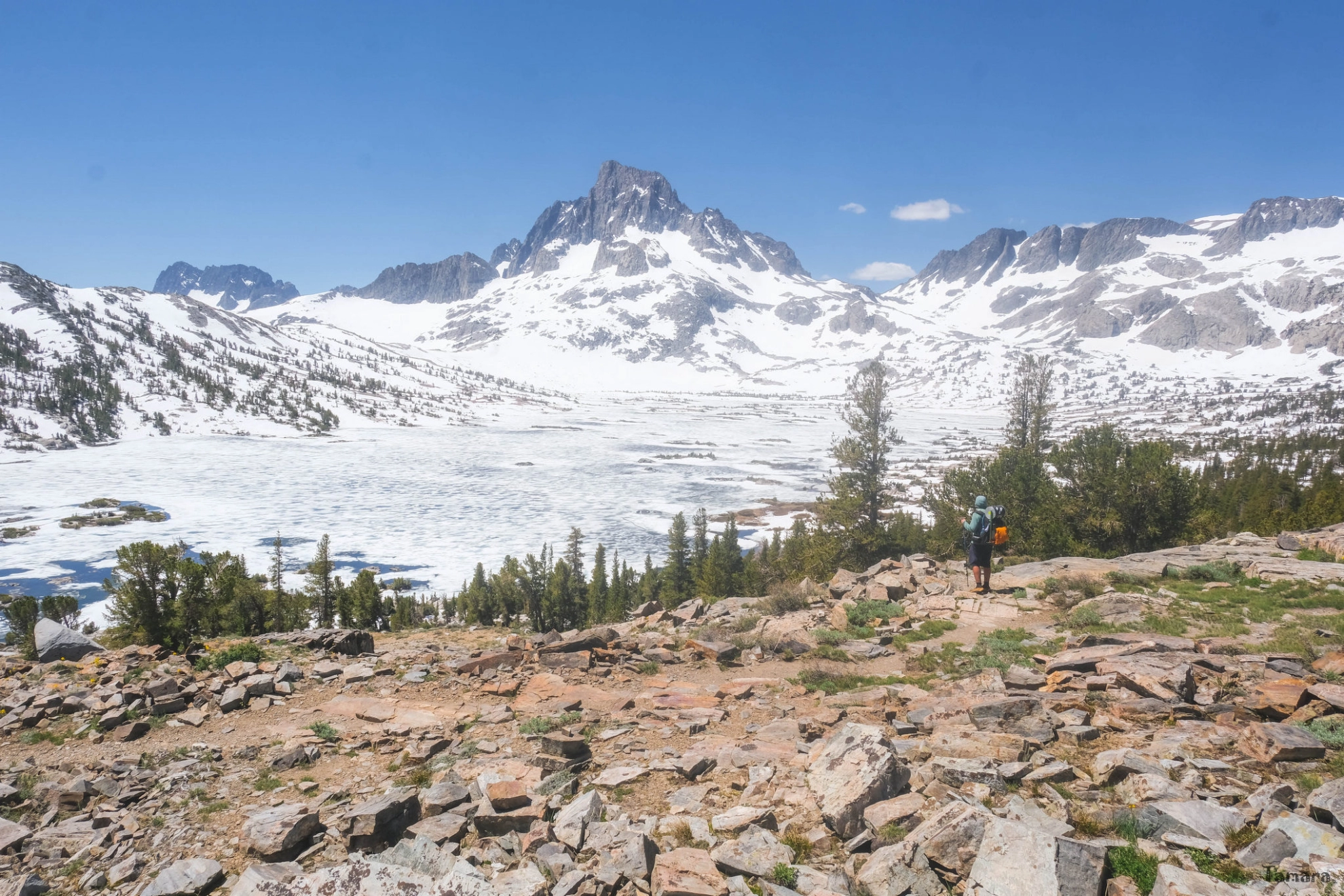 Nous partons vers 6 h du matin et suivons le PCT en balcon au-dessus de la rivière San Joaquim, dans les pentes des monts Deadman, Two Teats et San Joaquim. Sous le col d’Agnew Pass, nous filons vers l’ouest le long des contreforts du mont Davis au nord du lac Thousand Islands. Le cadre est majestueux. Nous avons en panorama les monts Banner, Ritter, Davis, Carson et Minarets. Ce sont tous des sommets rocheux de presque 4000 m, qui surplombent une série de lacs tous plus somptueux les uns que les autres. Le lac Thousand Island, le plus grand de tous, est encore bien en glace. Il clôture en beauté ce cirque de haute altitude.