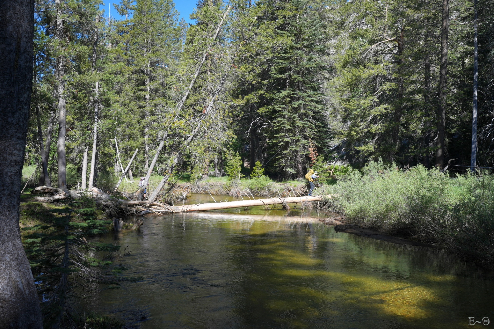 Nous repartons et marchons pour le reste de la journée en rive droite de Falls Creek, puis dans Jack Man Canyon. Nous sommes tous les trois en forme olympique et parcourons la vallée en faisant les prochains quatorze kilomètres, en montée sur 400 m en à peine 4 h. Soit une vitesse presque au double de ce matin. Cela augure de bonnes choses pour la suite. Il faut avouer que cette gorge est splendide, ouverte, sur une prairie en fleurs, encerclées par une forêt de pins, d’où émergent les dômes granitiques de Chittenden, Kendrick, Bigelow, Keyes du parc du Yosemite.