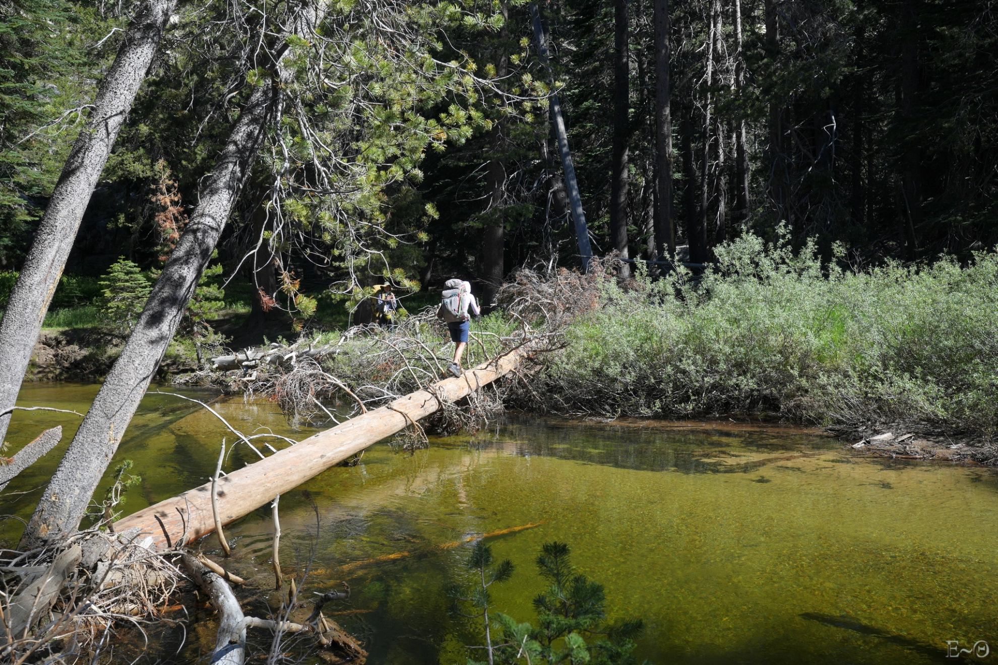 C’est un régal de randonnée. Il est tôt, et nous sommes déjà au dixième kilomètre. C’est une excellente nouvelle, nous allons pouvoir être vite en haut de la deuxième montée, vers Macomb Ridge. Effectivement, à peine 1 h 10 après nous basculons en versant nord vers Tilden Canyon Creek. Celui-ci est large, mais peu profond. C’est un torrent splendide, aux couleurs jaunes, vertes. Cela fait autant de temps à passer dans une eau bien fraîche, et avec les températures qui grimpent cela devient même agréable. Nous voyons nos premiers poissons.