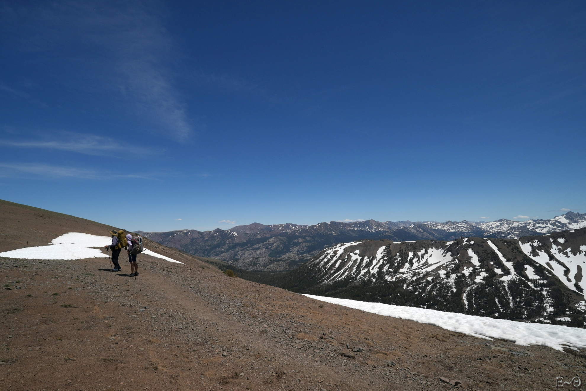 Nous poursuivons notre périple dans une forêt de pins clairsemée, sur une sente en balcon sur des scories de couleurs rouge violacé. À l’altitude 3000, nous retrouvons un immense névé qui domine la vallée et que nous suivons en montée. C’est une des plus belles ascensions qui soient. Nous avons l’impression de survoler le sud Sierra, qui s’étale à perte de vue devant nous. À plus de 3 200 m dans une ambiance lunaire, nous retrouvons un vent qui va nous accompagner sur les derniers kilomètres, dans Emigrant Wilderness. Nous avançons sur les flancs arides de Leavitt Peak au-dessus de Kennedy, 1000 mètres en contrebas. L’absence de végétations rend le lieu unique. Il y a un peu de beauté islandaise dans ces grands espaces naturels.
