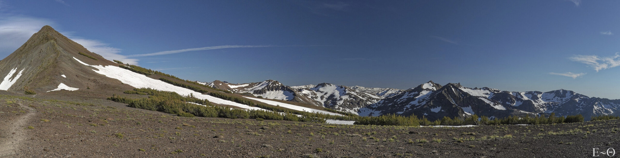 En fait il n’en sera rien. On passe brutalement en changeant de vallée, à hauteur d’Emigrant Wilderness d’un monde à un autre. Les dômes arrondis qui nous accompagnaient depuis 4 jours font place à un terrain mixte, de roches volcaniques et métamorphiques. On est sur le bord de l’énorme poussée magmatique granitique du Yosemite. Du coup c’est un vrai bazar géologique et les couleurs sont folles, alternance de rouge, noir, gris, vert ou jaune. Avec la persistance de la neige, vous avez une ambiance et des paysages extraordinaires.