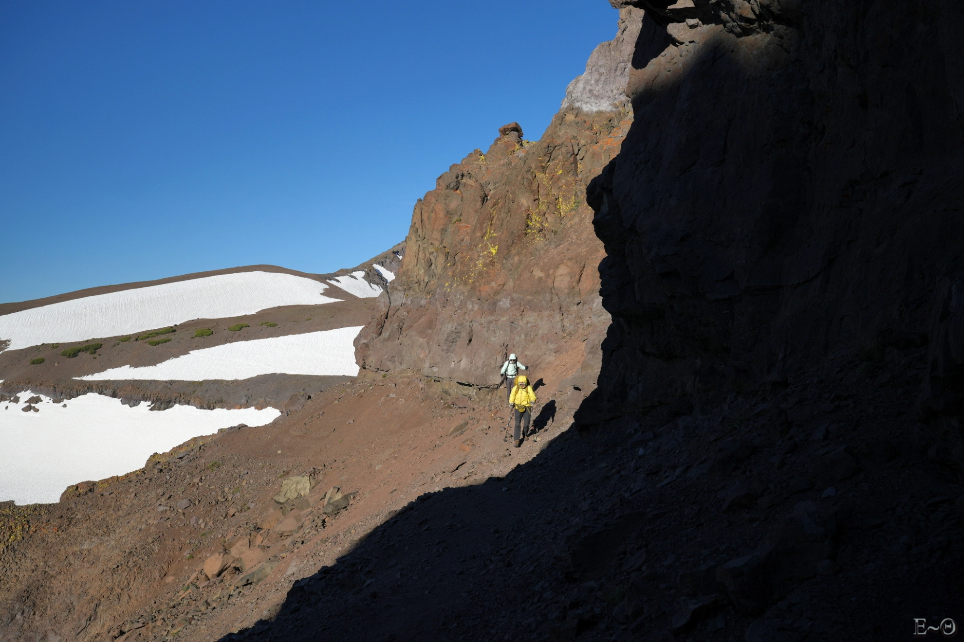 Nous avions lu que la descente vers Sonora pouvait être délicate, « … should be extremely careful if there is any snow… ». Ce sera le cas. Nous passons un dernier névé complètement gelé. Je manque de finir cul par-dessus tête en glissant et m’arrête à distance d’une falaise. Nous avons aussi cru que Janet allait faire une ultime grande chute, car elle est encore plus prêt du bord que moi. À la fin de la crête, nous buttons sur un couloir de roche instable. Pas le choix, les traces sont bien la, droits dans l’éboulis !