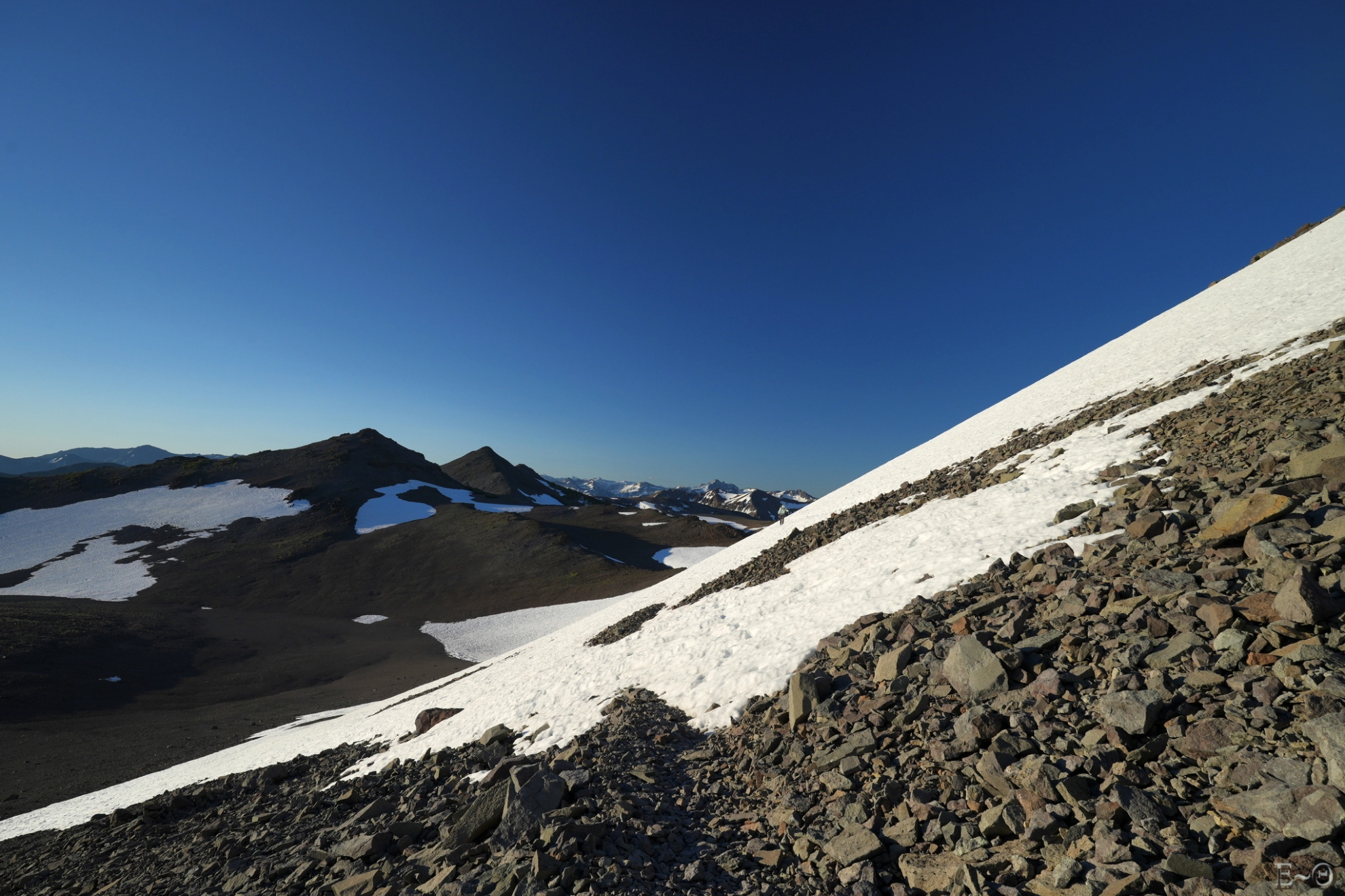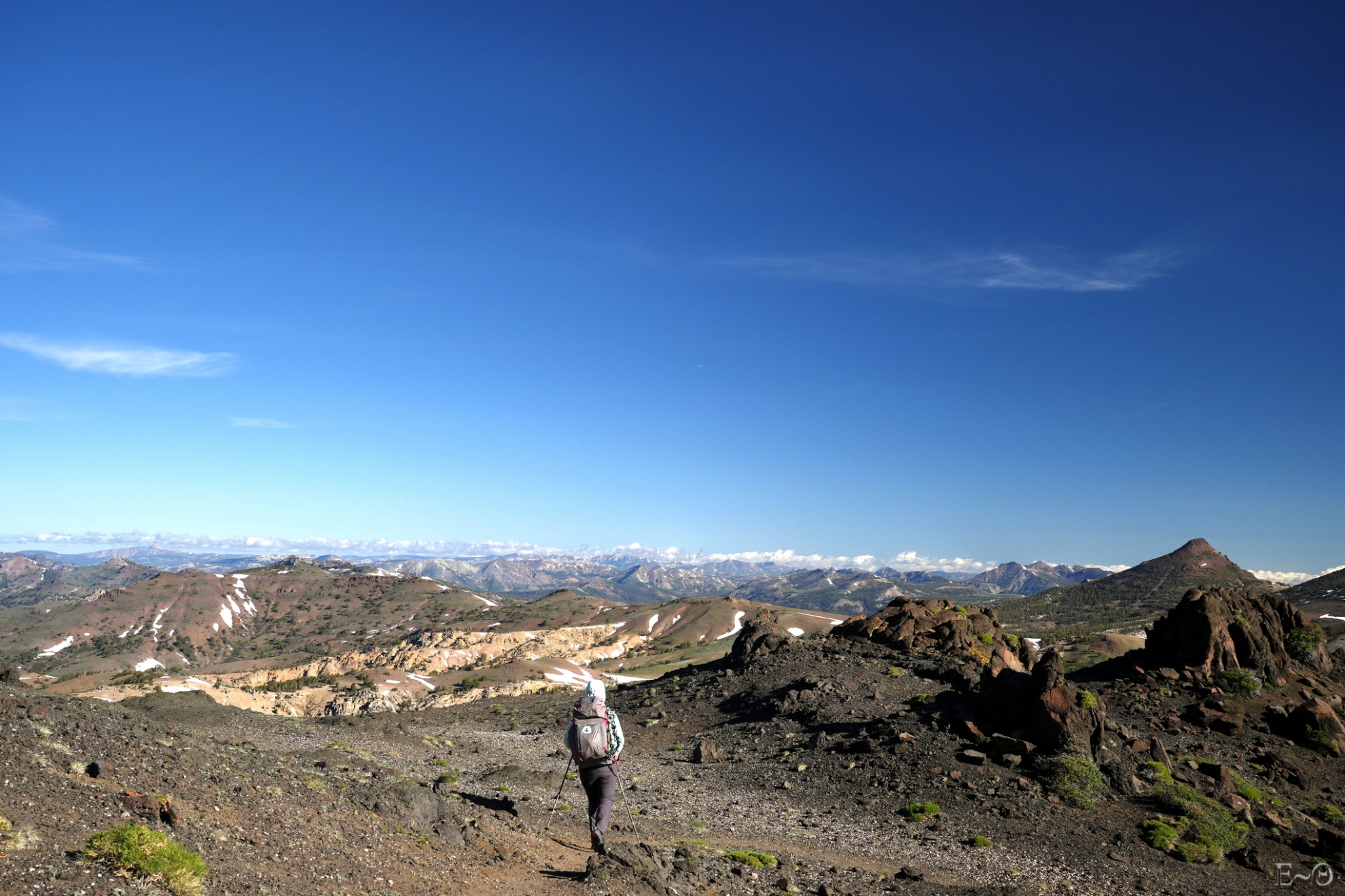Hélène remet les crampons. Il vaut mieux perdre 5 minutes et arriver entier. Les paysages au sein de la Caldera volcanique de Leavitt Peak que nous contournons sont magnifiques. Le falaises fracturées alternent avec des pentes de scories, laves, pierre ponce. Çà et là, quelques lacs en glace ajoutent une touche de blanc dans ce lieu sans vie. Les contrastes de lumière sont éblouissants et donnent un aspect lunaire à cette portion. Nous passons sur la crête que nous allons suivre jusqu’à notre terminus par une brèche dans l’arête rocheuse. Le moment est incroyable. Au loin, les sommets de la Californie du Nord s’étendent à perte de vue.