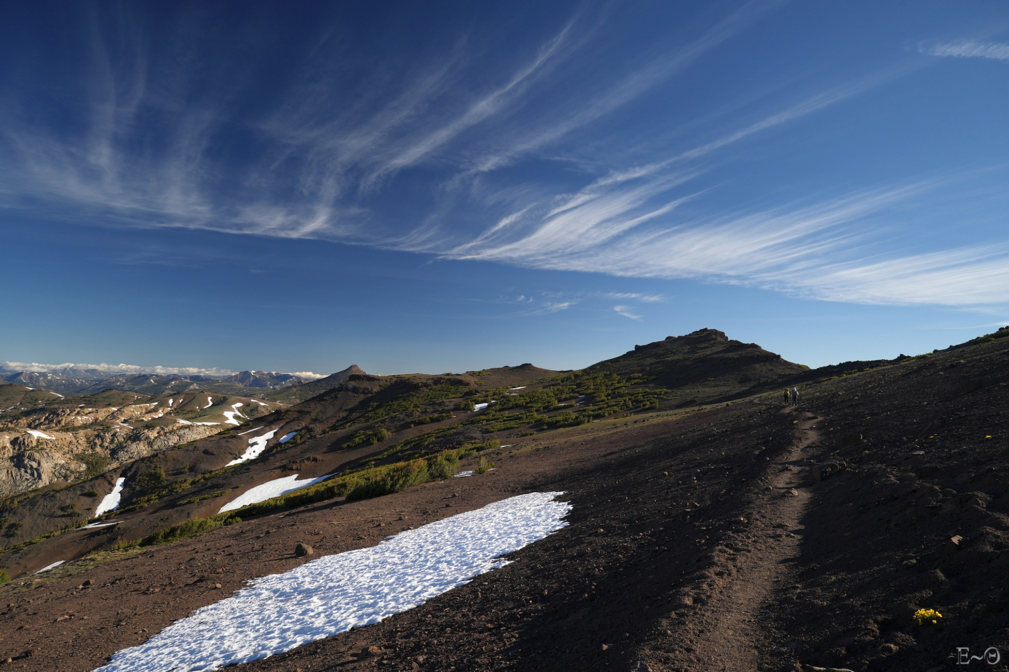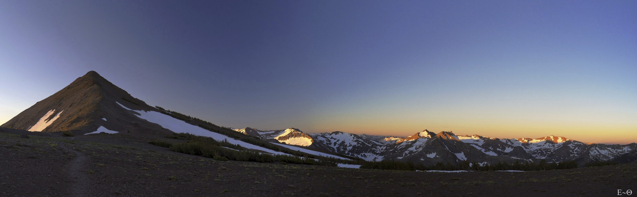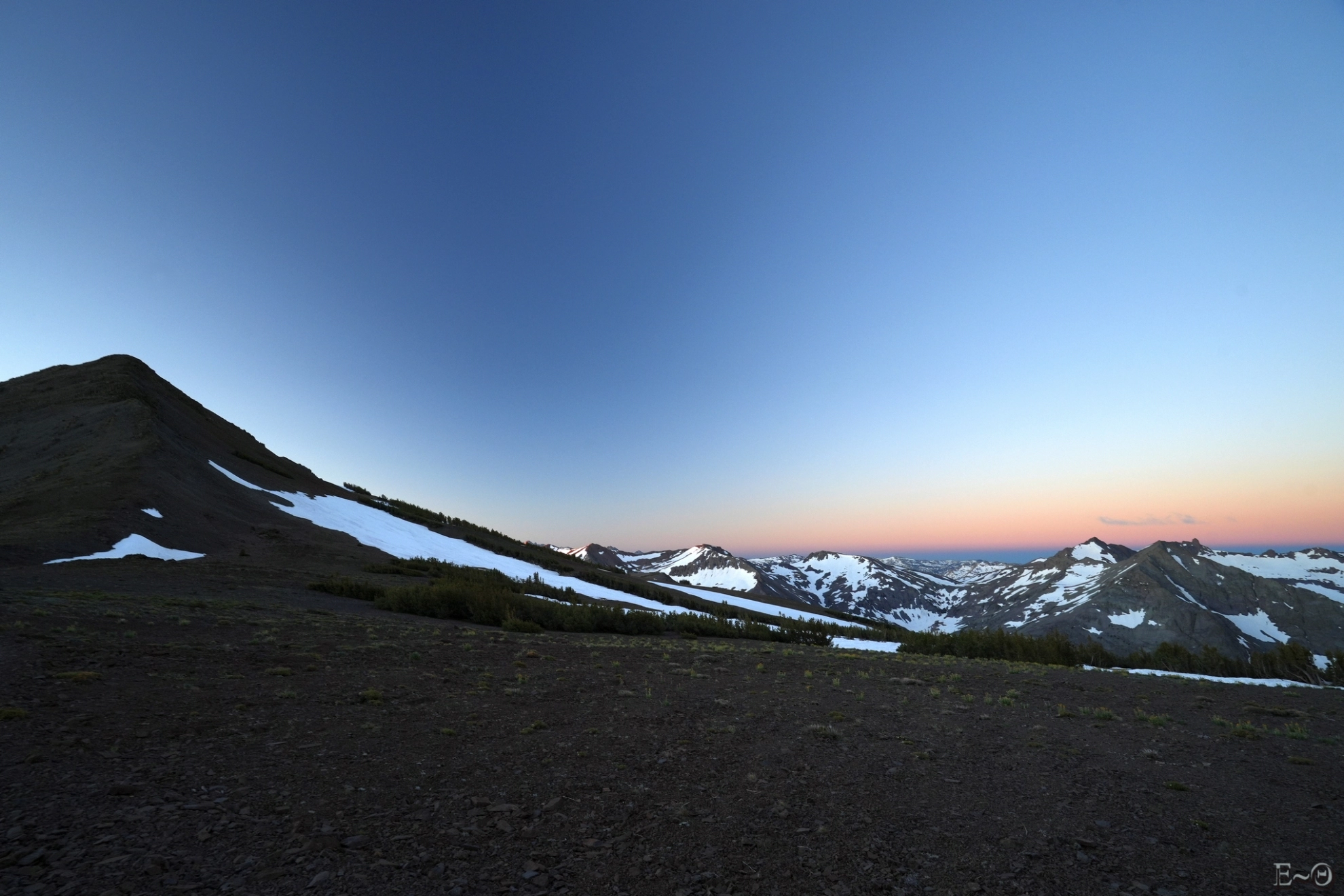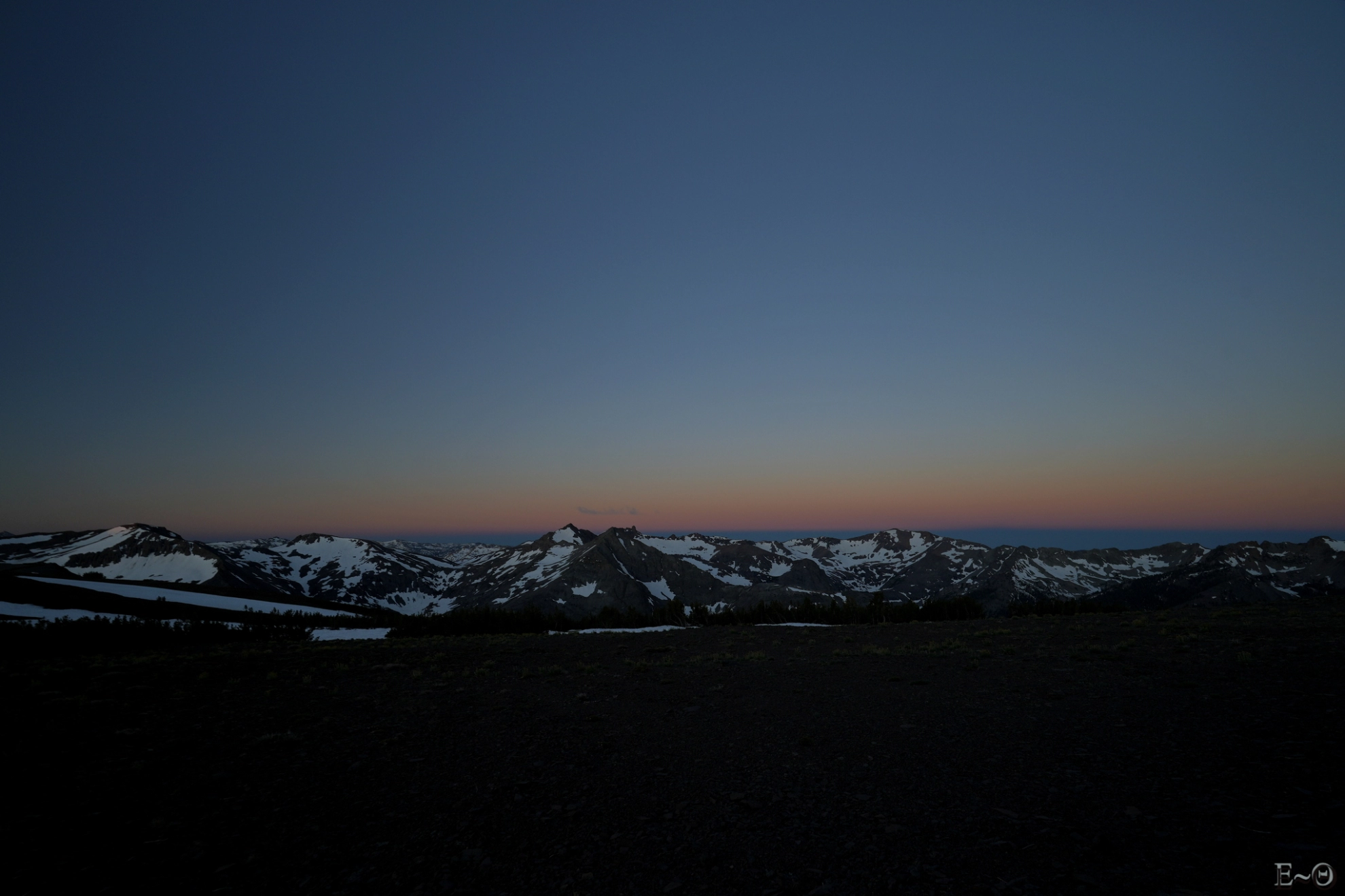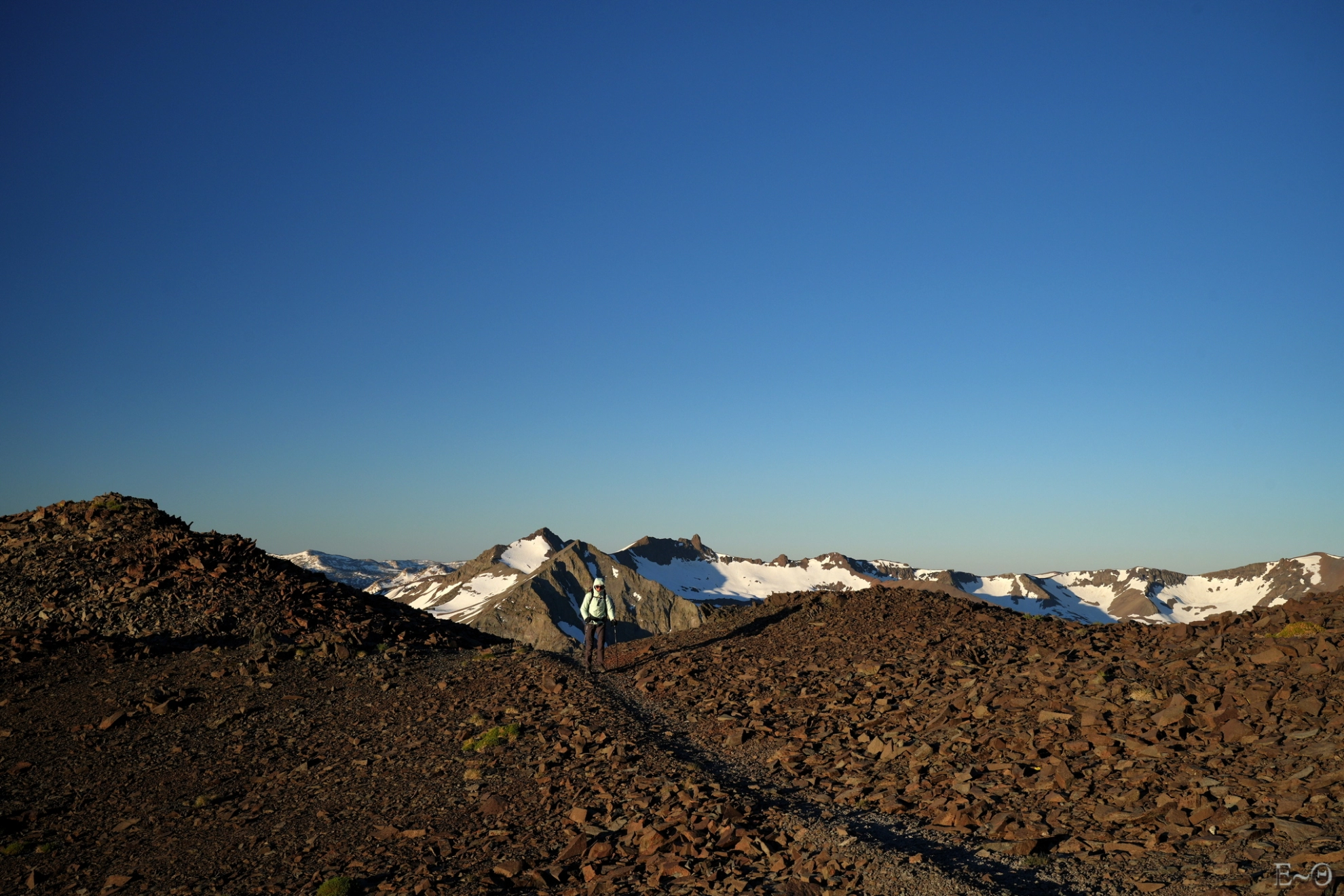Le lever de soleil dans l’environnement dénué d’arbre sur les calderas volcaniques est somptueux. Le ciel se teinte d’un rose sang, qui se fond dans l’immensité bleu noir au-dessus des sommets que nous avons dépassés durant les étapes précédentes. Les rochers couleur ocre ajoutent à cette ambiance une dimension qui nous donne l’impression d’être sur Mars. Nous déjeunons dans la tente, puis démarrons le chemin en direction de Leavitt Peak.