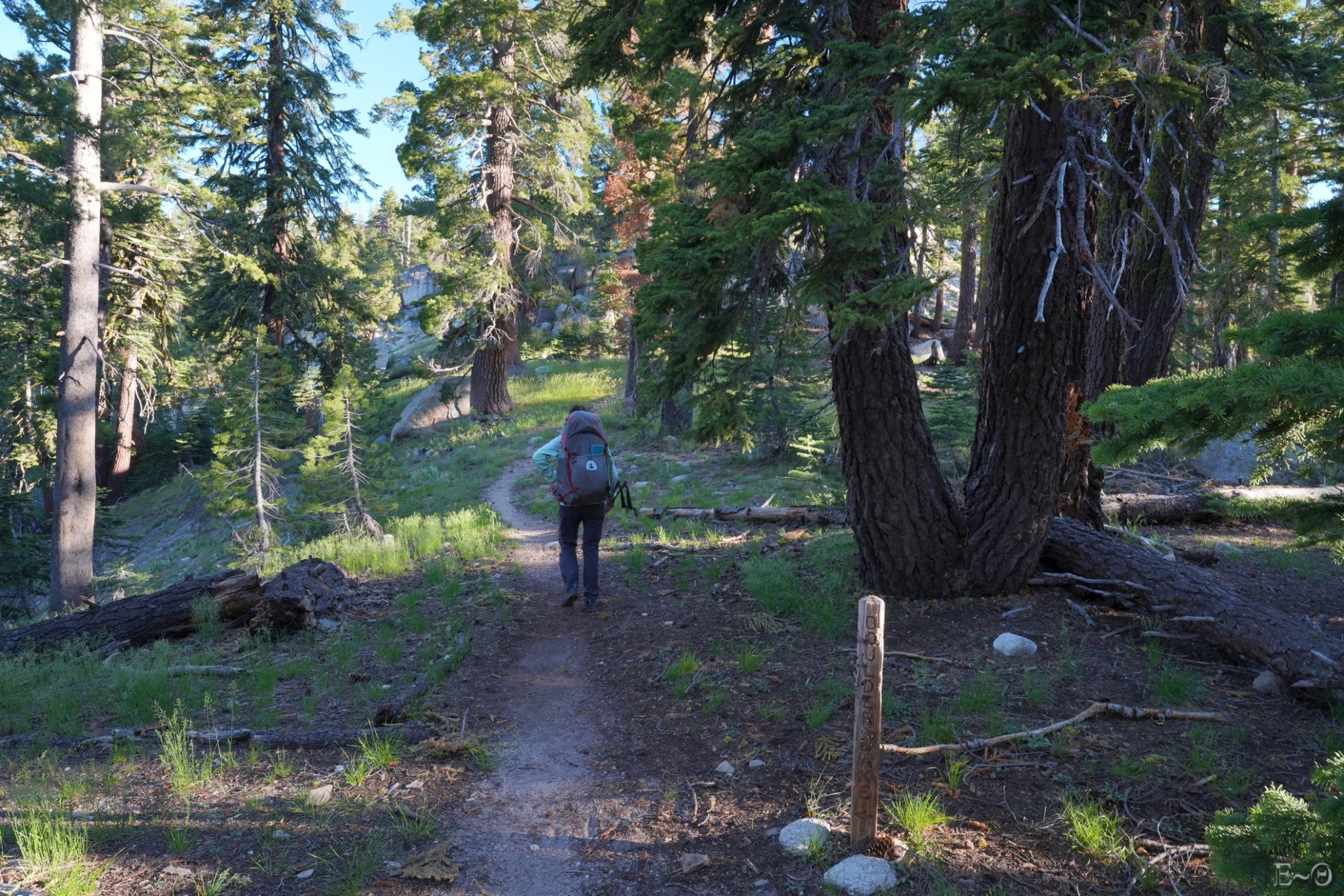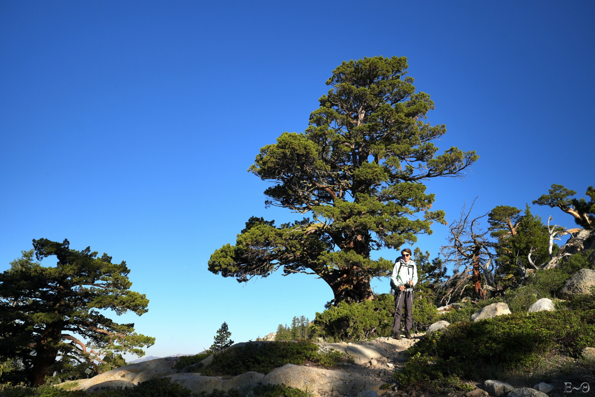 Après celui-ci nous grimpons en une longue diagonale vers Tryon Peak où nous passons une brèche sans nom. L’endroit est splendide et les vues sur Ebett et Highland Peak compensent ce que nous n’avons pas admiré ce matin. Nous filons rapidement vers ce qui sera la plus belle section de la journée, dans Nobble Canyon. Dans le verrou glaciaire, sous le lac éponyme, des dizaines de pins Brittlescone sont accrochés à la pente. Ils ressemblent à des bonsaïs géants, et sont parmi les arbres les plus graphiques qui soient.