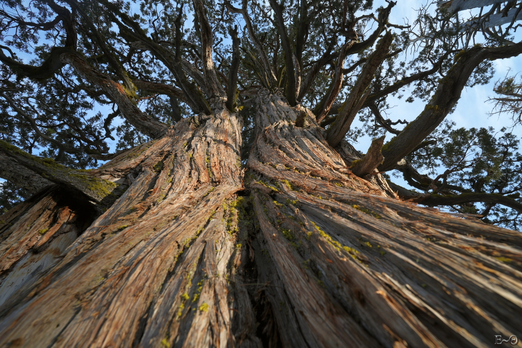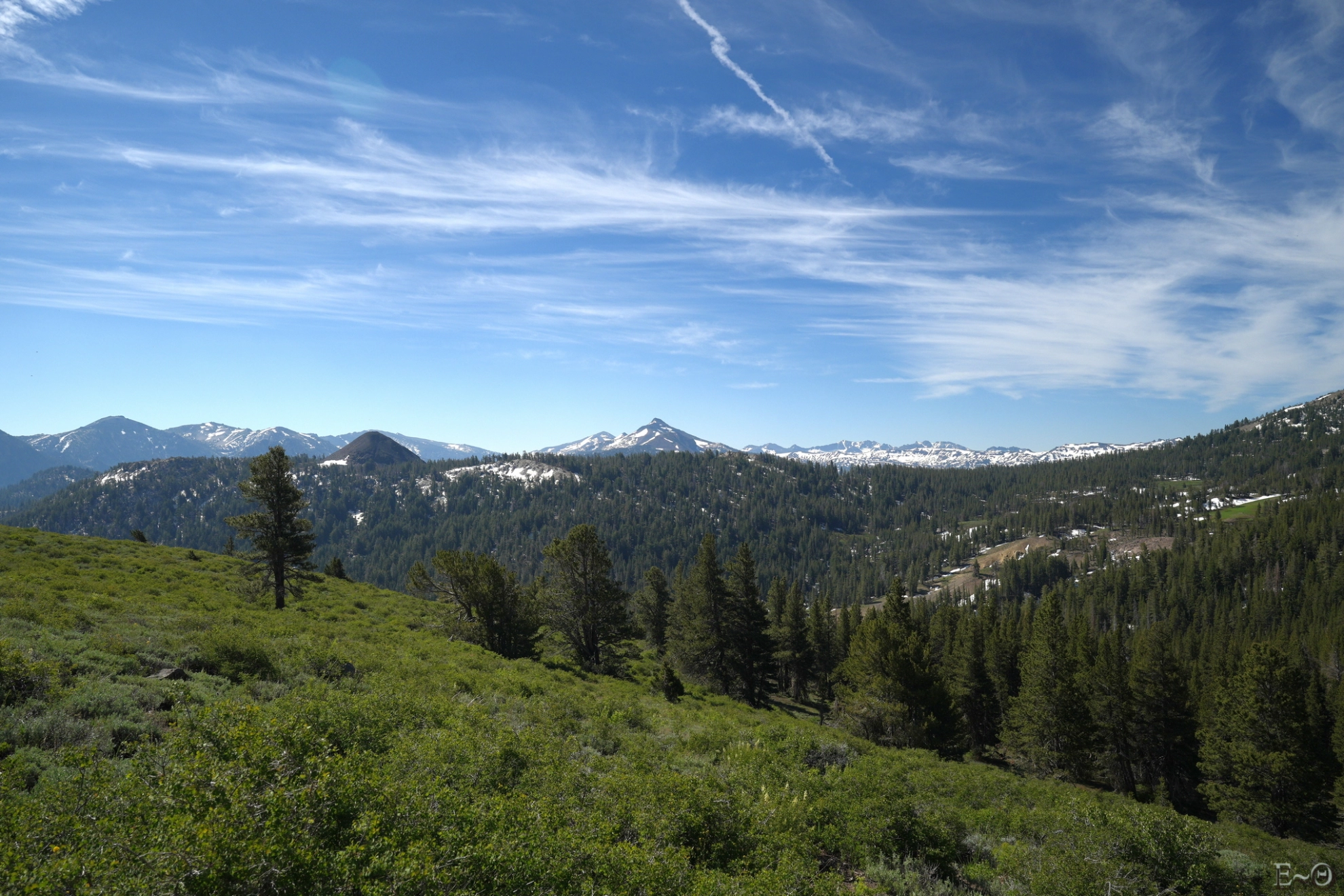 Dans cette portion où prédomine la forêt, l’absence de vue est dommage. Nous devinons par moment que les montagnes qui nous entourent sont magnifiques. Nous en profitons pour regarder plus souvent les fleurs, car nous vivons un deuxième printemps après celui du désert. Les variétés sont nombreuses, et alternent bleus, jaunes, rouges, parmes. Dans les zones et pentes volcaniques, de rares pins bristlecones essaient de pousser. Les formes de ceux-ci sont torturées, bien plus que celles des arbres communs. Les troncs de couleur ocre, associés aux nuances sombres des roches environnantes rend l’ensemble particulièrement esthétique.