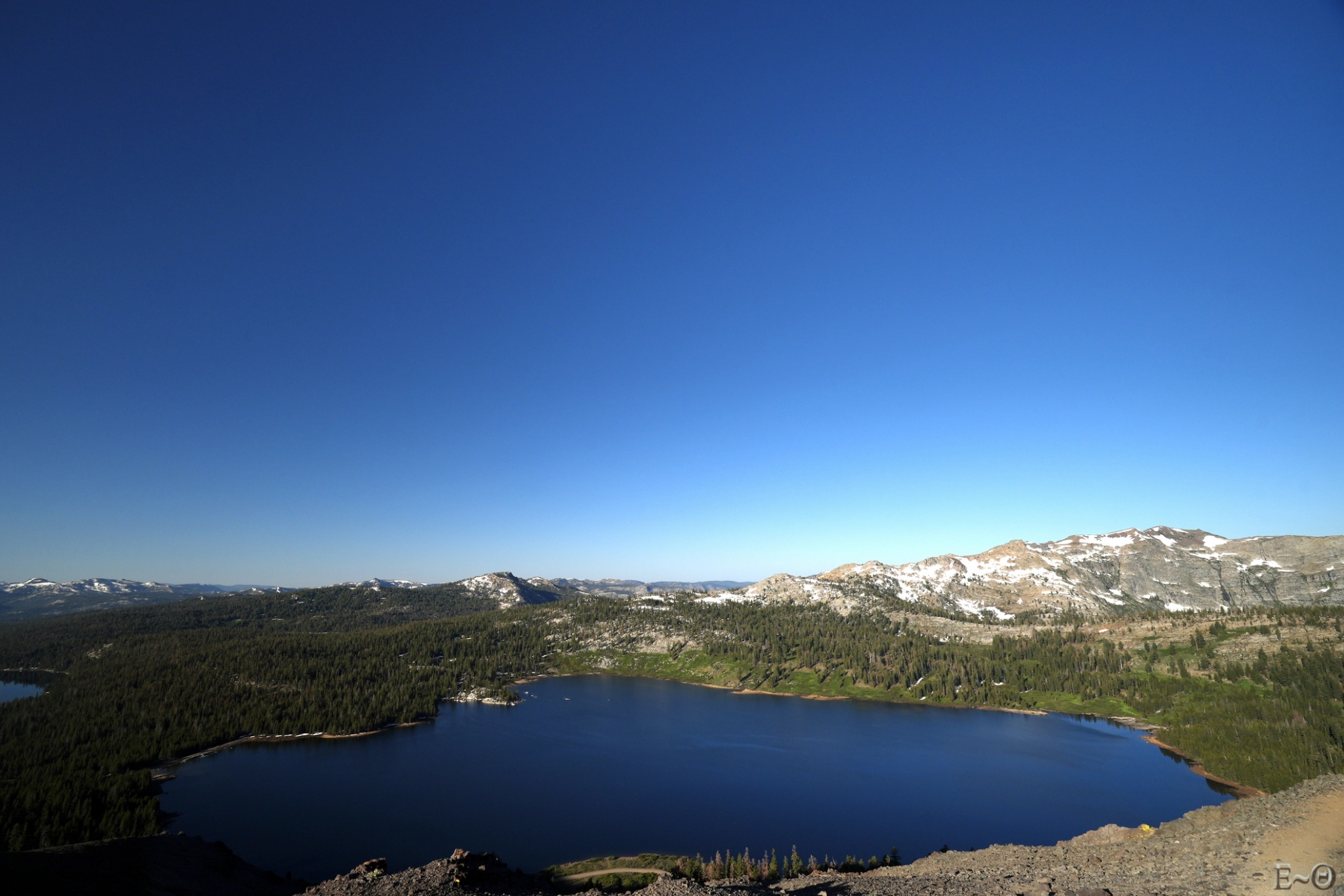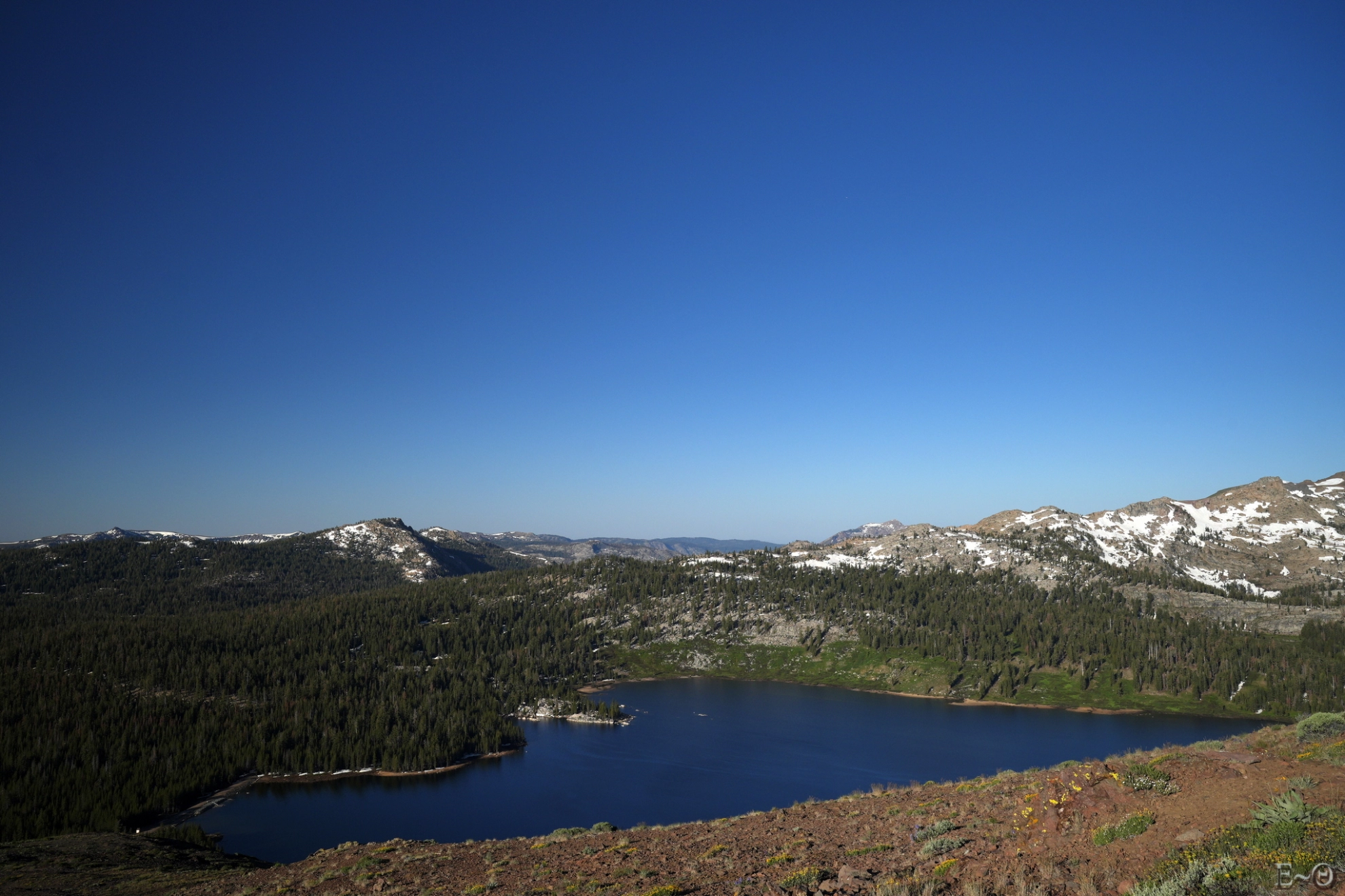 Nous avons même droit à un retour de la neige, au nord du pic Elephants Back, avec une immense traversée en diagonale évoquant la haute Sierra. C’est presque un baroud d’honneur du chemin pour nous rappeler que rien n’est gagné sur le PCT. Nous prenons le temps de passer en sécurité, Hélène met les crampons et ce ne sera finalement qu’une formalité. Nous arrivons à un petit col sans nom et apercevons Carson Pass, derrière un mini lac, Frog Lake. Nous retrouvons plusieurs randonneurs à la journée en provenance du trail head juste à proximité.