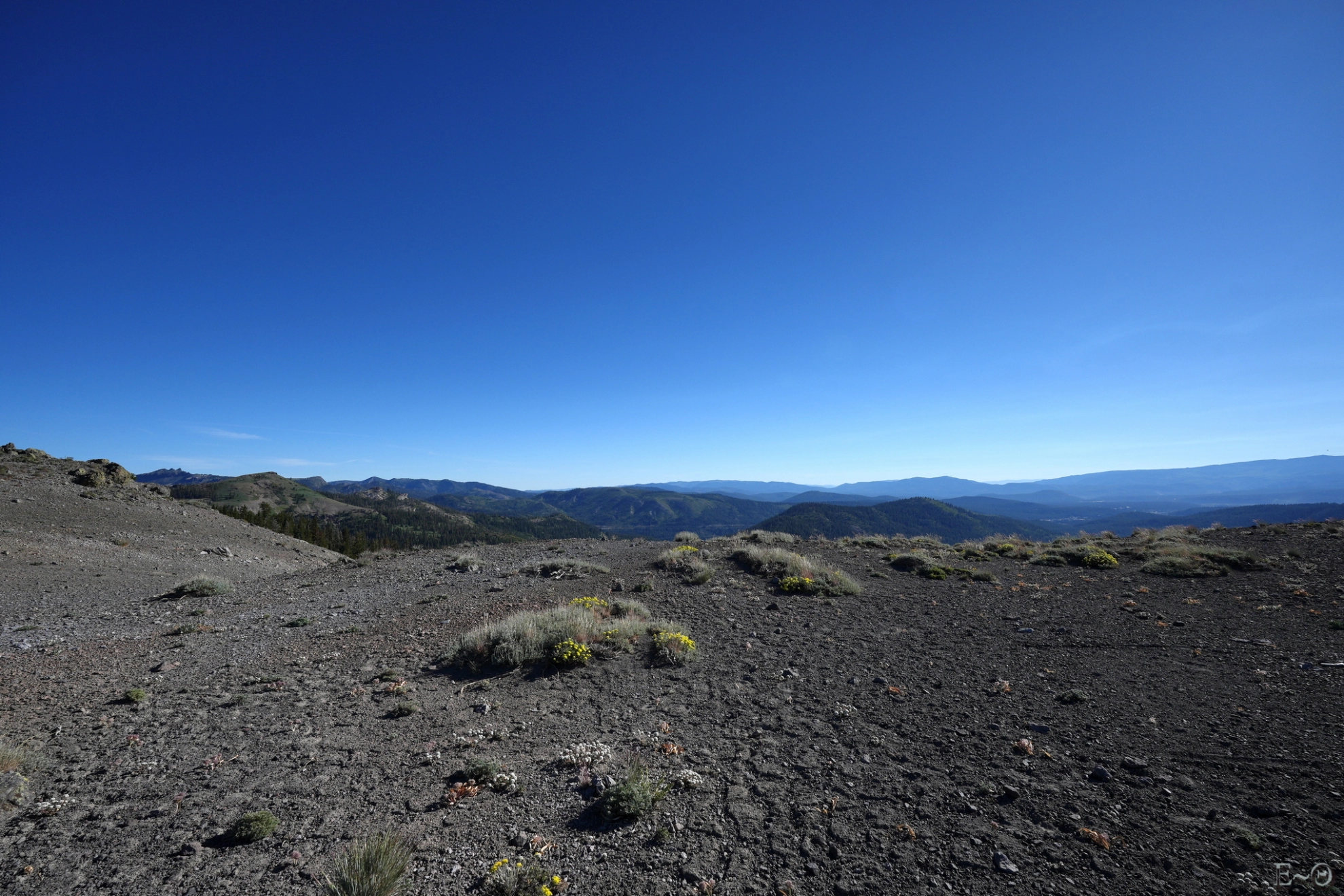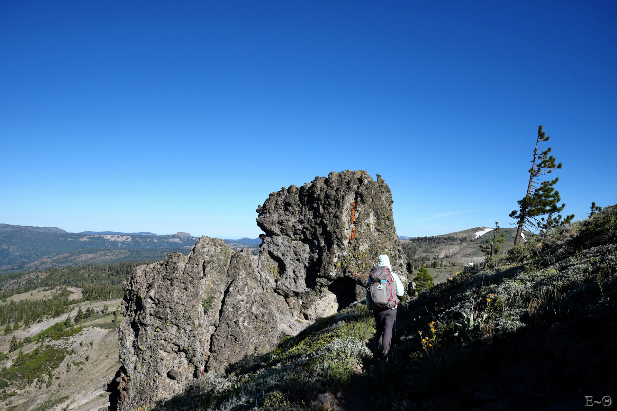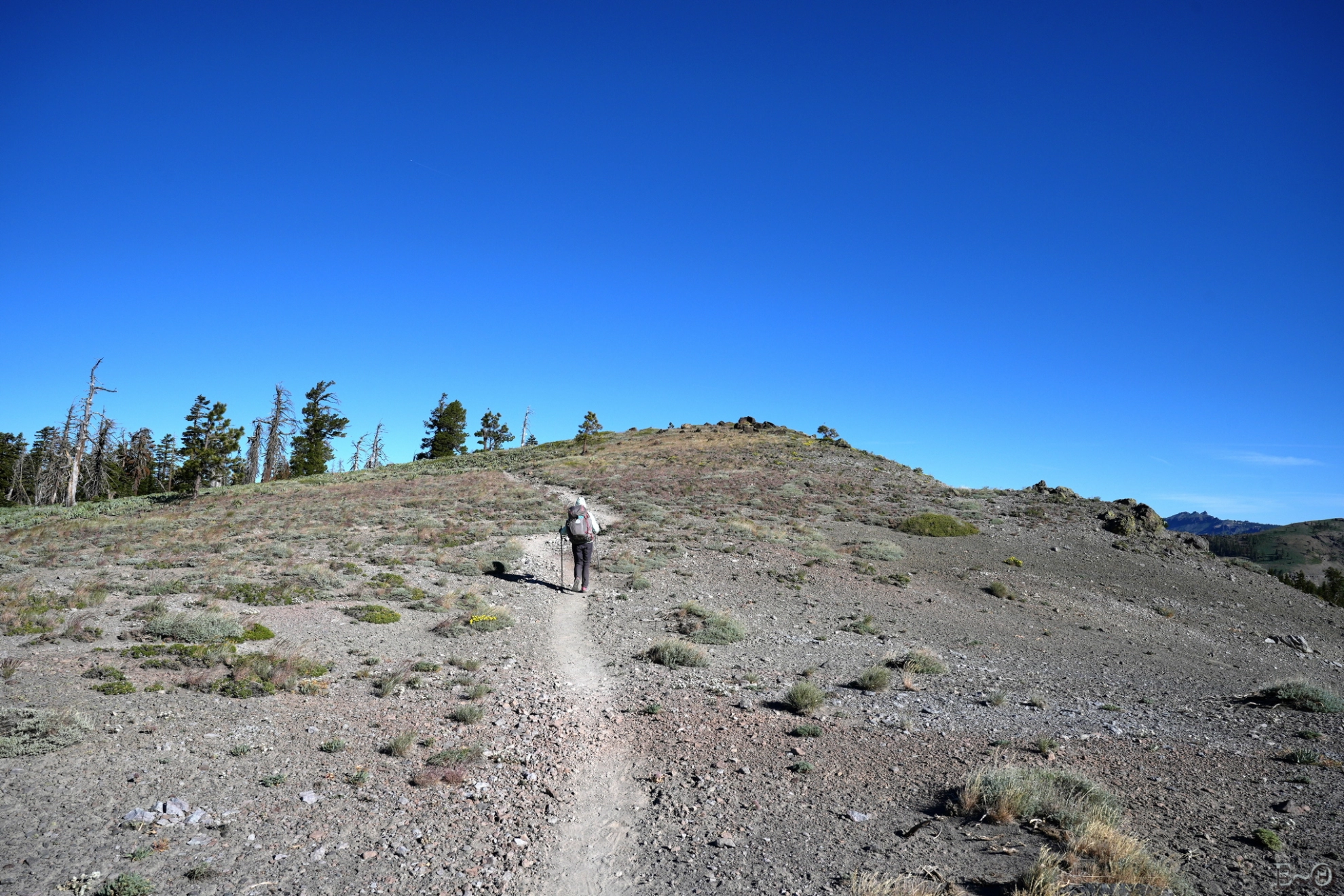 La première montée très minérale vers les crêtes sous Tinker Knob est bien tonique, avec deux cents mètres de dénivelé en plein vent. Nous débouchons sur une arrête de roches volcaniques pelées. Les températures sont bien fraîches. Nous surplombons les forêts du nord du Lake Tahoe et les paysages sont extraordinaires. Nous avons bien fait de faire le bivouac en bas, les bourrasques sont redoutables. Nous retrouvons Benjamin et Chloé qui sont en train de finir de déjeuner et de ranger leurs affaires. Ils ont réussi à trouver le seul endroit sans trop de vent pour dormir. Heureusement pour eux.