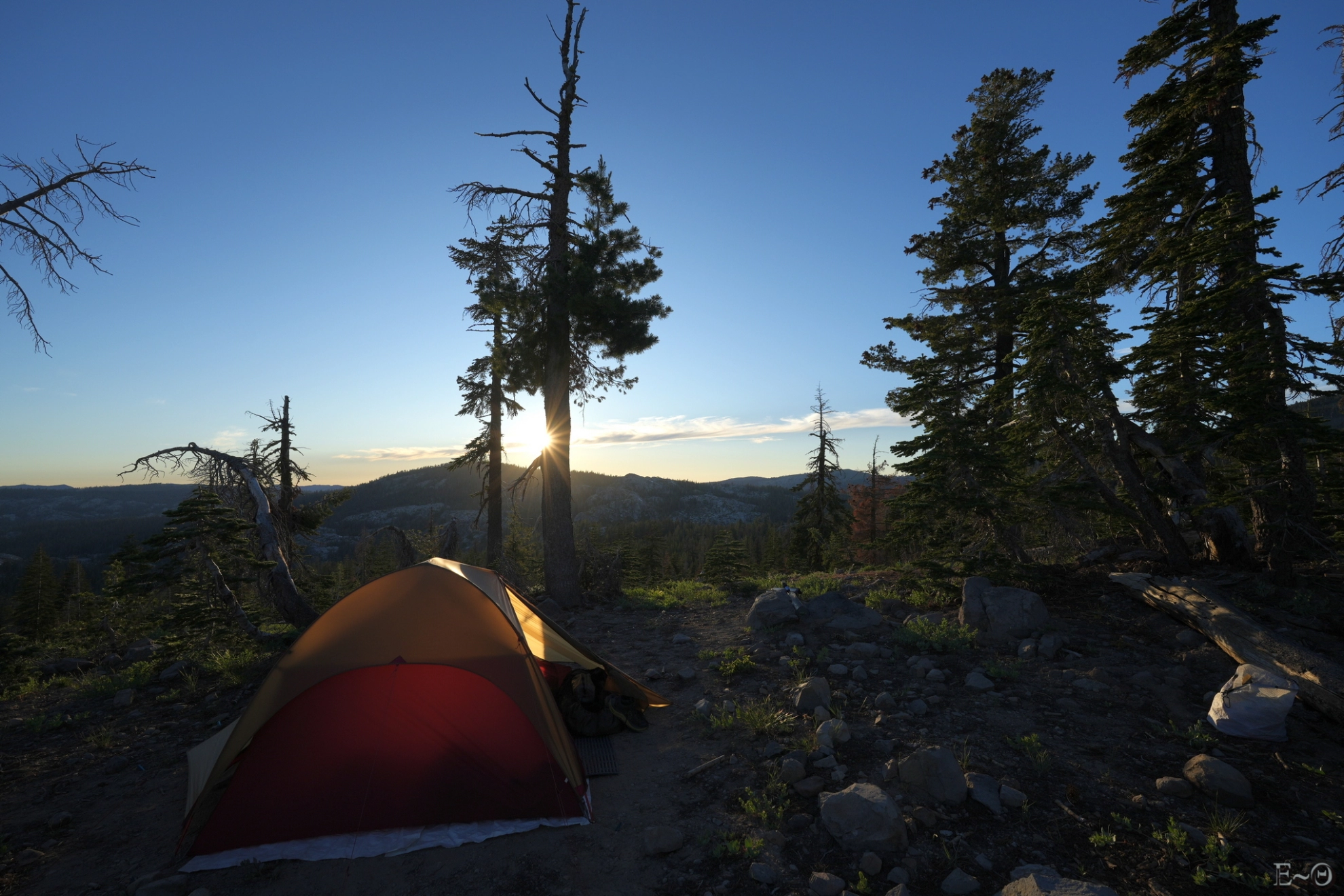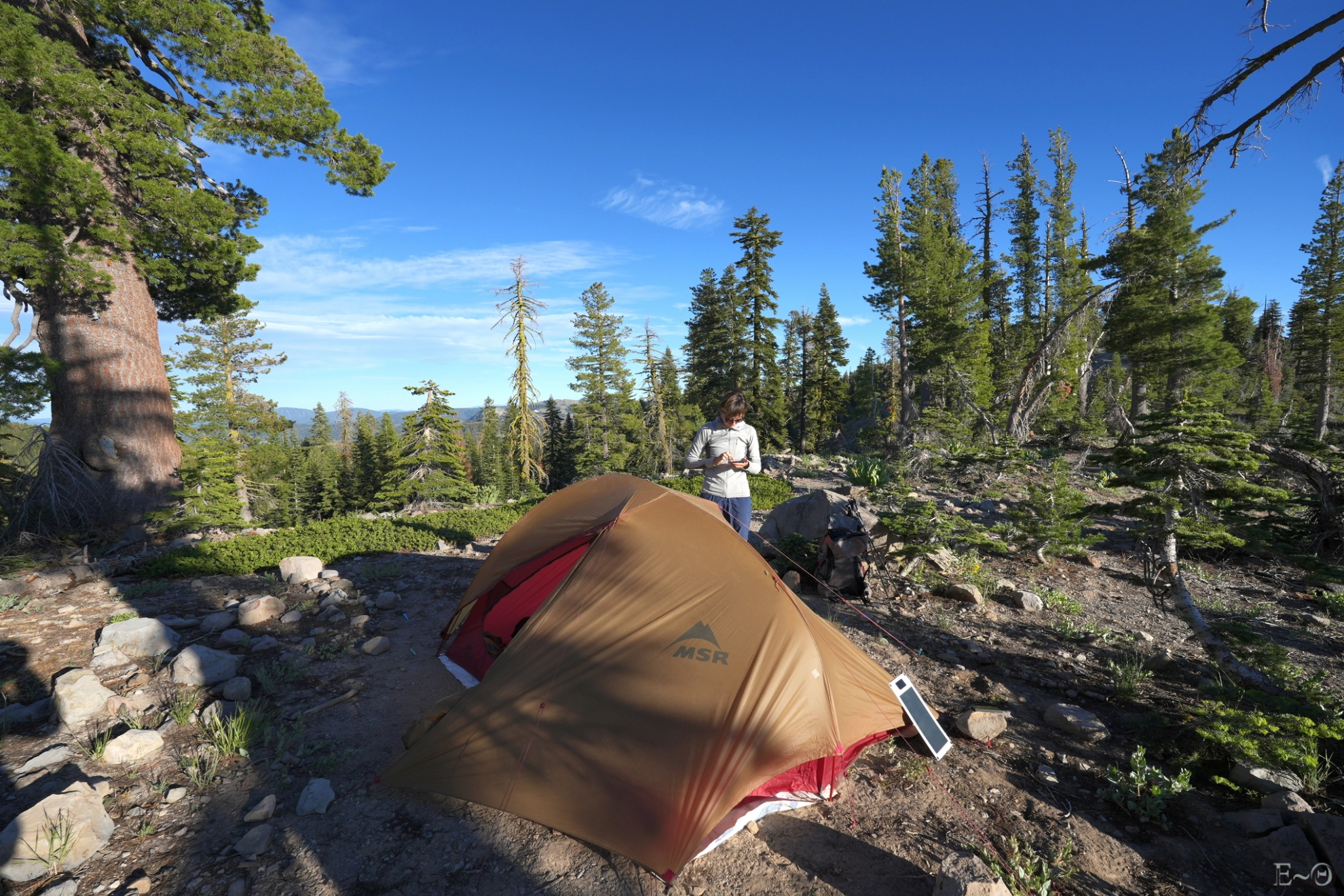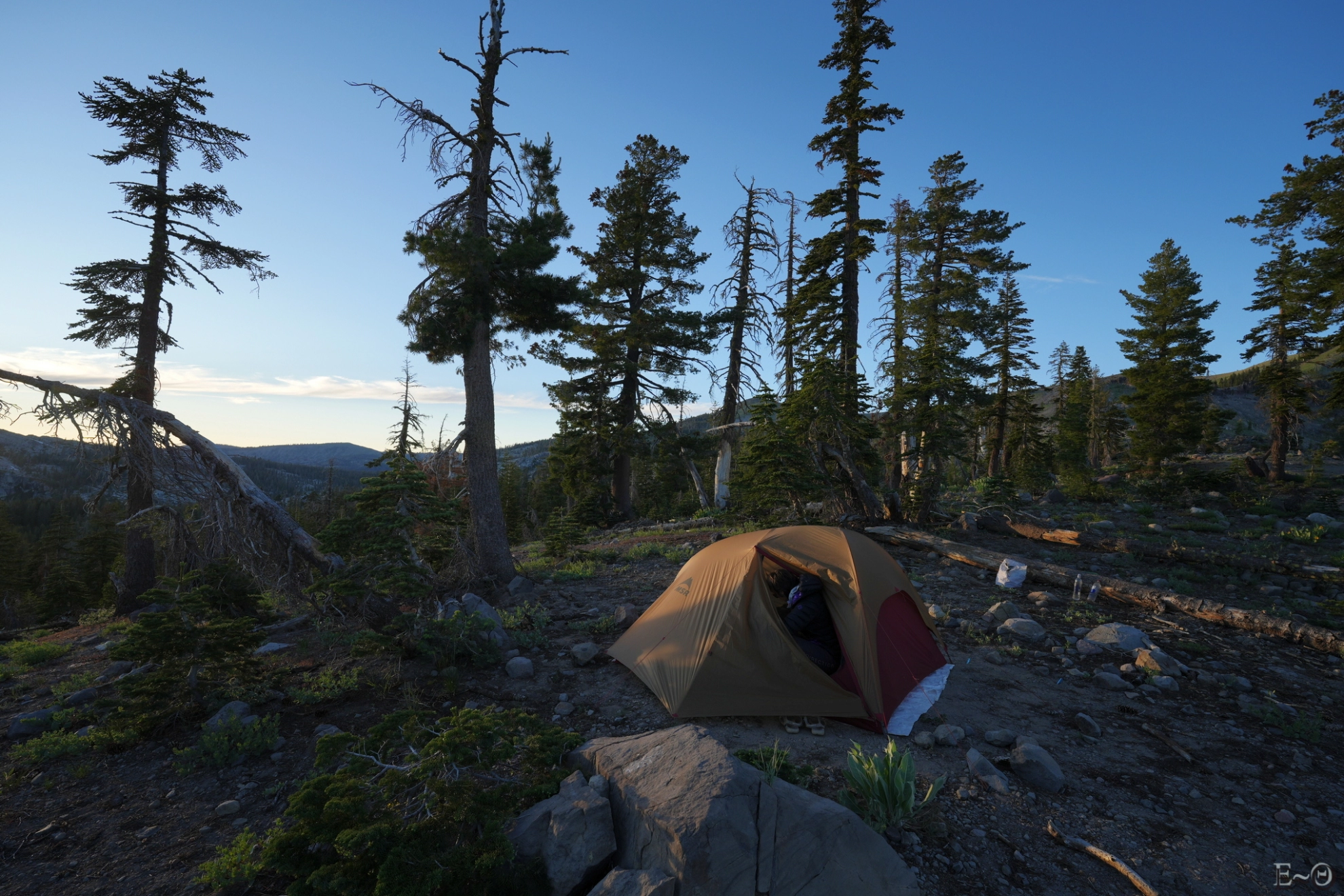 La première montée très minérale vers les crêtes sous Tinker Knob est bien tonique, avec deux cents mètres de dénivelé en plein vent. Nous débouchons sur une arrête de roches volcaniques pelées. Les températures sont bien fraîches. Nous surplombons les forêts du nord du Lake Tahoe et les paysages sont extraordinaires. Nous avons bien fait de faire le bivouac en bas, les bourrasques sont redoutables. Nous retrouvons Benjamin et Chloé qui sont en train de finir de déjeuner et de ranger leurs affaires. Ils ont réussi à trouver le seul endroit sans trop de vent pour dormir. Heureusement pour eux.