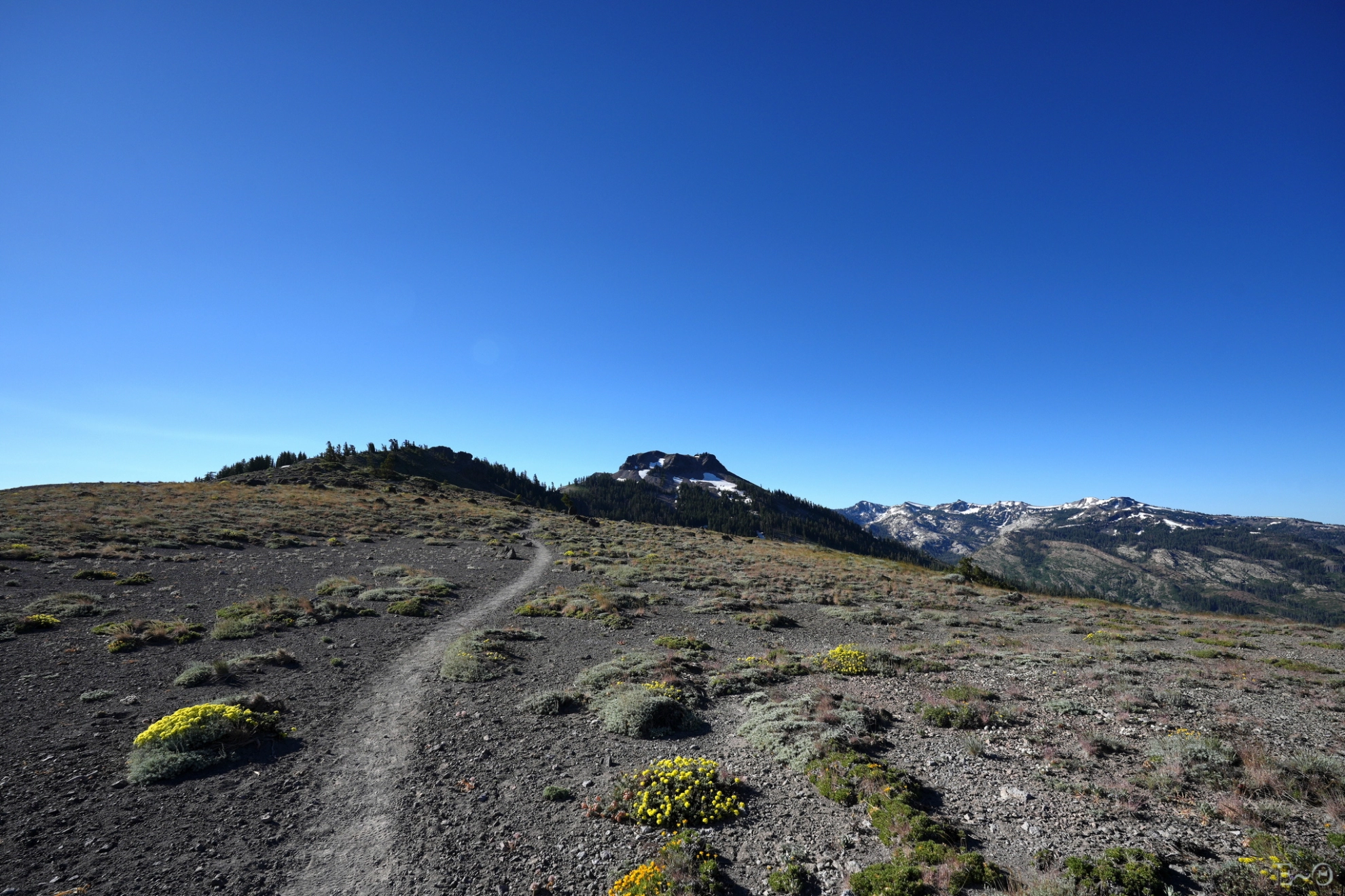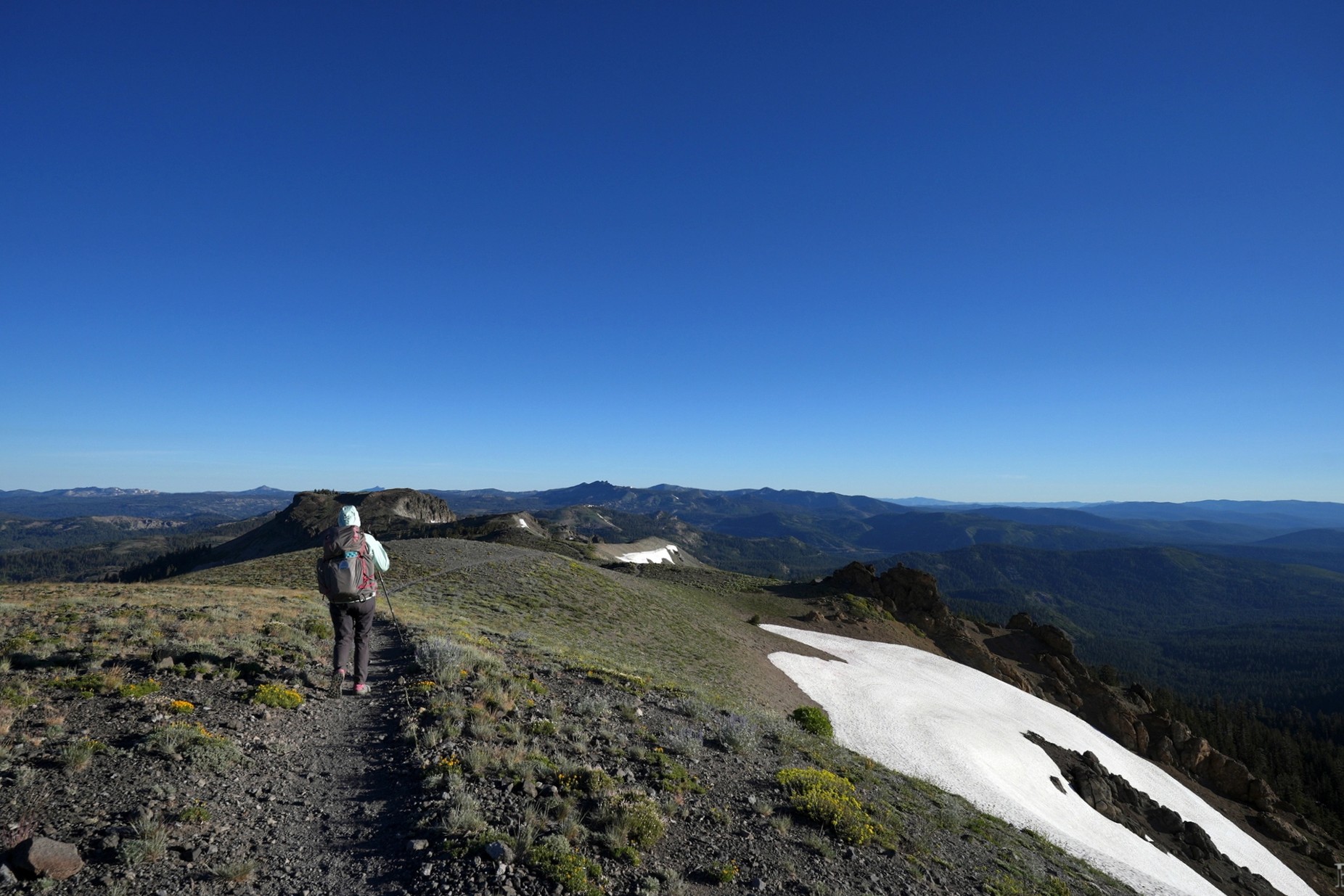 Nous continuons le chemin en direction des pics Anderson et Lincoln. Il n’y a pas un nuage dans le ciel qui est d’un bleu azur et les vues sont toutes impressionnantes. Au loin, vers le col de Donner, nous devinons de rares névés sur les sommets de plus de 2600 mètres. En arrivant sous Lincoln Peak, nous croisons un dernier passage enneigé bien pentu. Tamara et Anthony sont en train de le franchir. Nous décidons de rester plus bas. Après plusieurs mois de Sierra, nous éludons aisément le problème et filons sur le PCT.