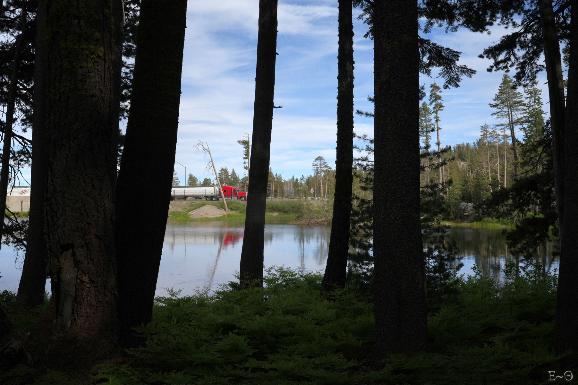 De retour à Donner Pass, nous retrouvons le chemin qui passe sous des falaises ou des grimpeurs… grimpent vers Stephens et G.R Stewart peak. Au vingt et unième kilomètre, nous passons dans un tunnel d’une trentaine de mètres de long sous l’autoroute 80 en mode petite souris. Nous longerons ensuite celle-ci sur un kilomètre. Le bruit est infernal et ne dure heureusement pas.