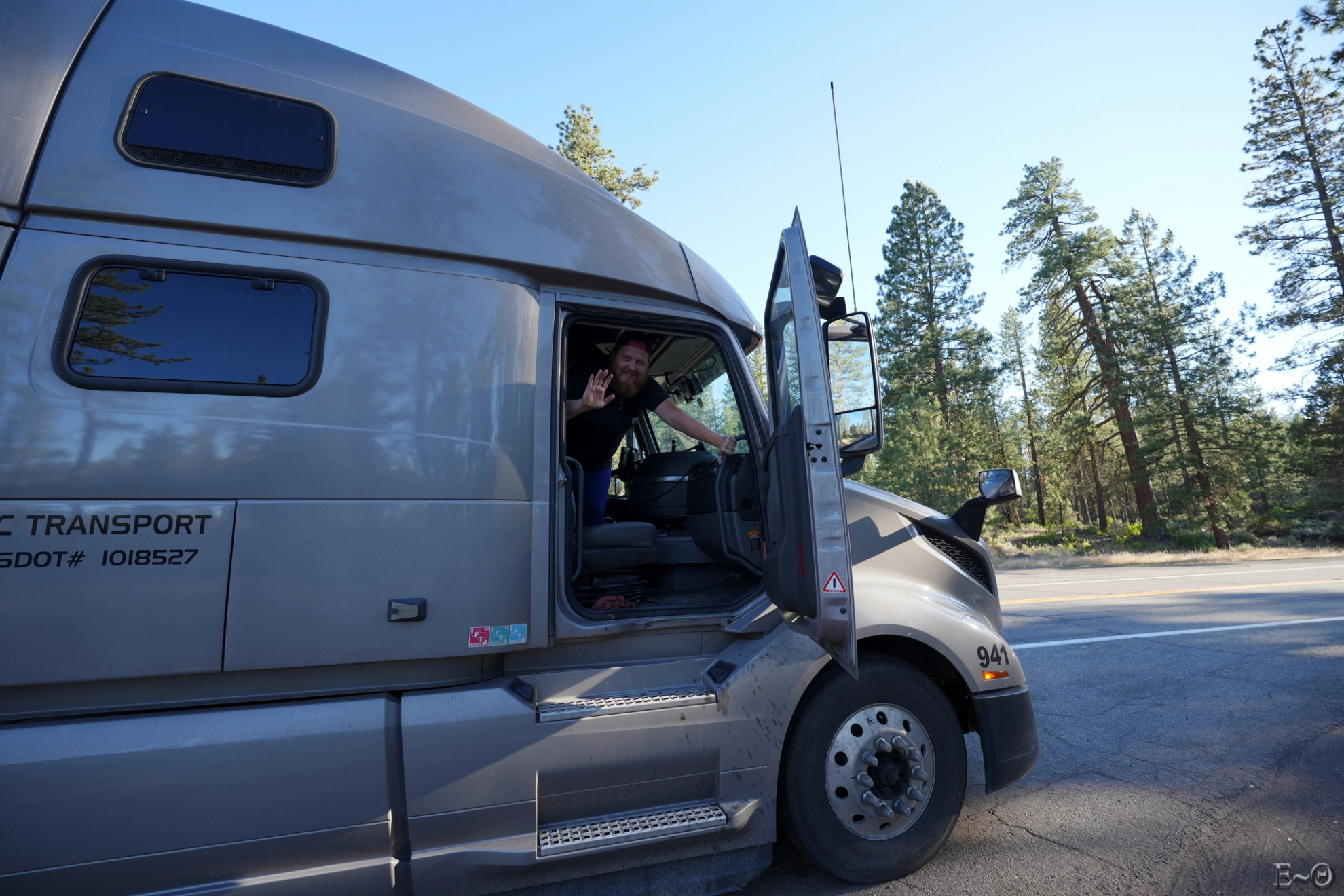 On commence par le plus simple, 1,5 km pour quitter le PCT et rejoindre la route qui nous conduira en ville. À l’accoutumée, levé à 6 h, marche à 7 h 30 et objectif atteint à 8 h. Trop facile. Et là, coup de bol, on moment où on sort du PCT, on voit un véhicule qui dépose un randonneur et repart… sur Quincy. Celui-ci interpelle son collègue et nous voilà, après à peine deux minutes d’attente au milieu de nulle part, déjà en partance. C’est inespéré.