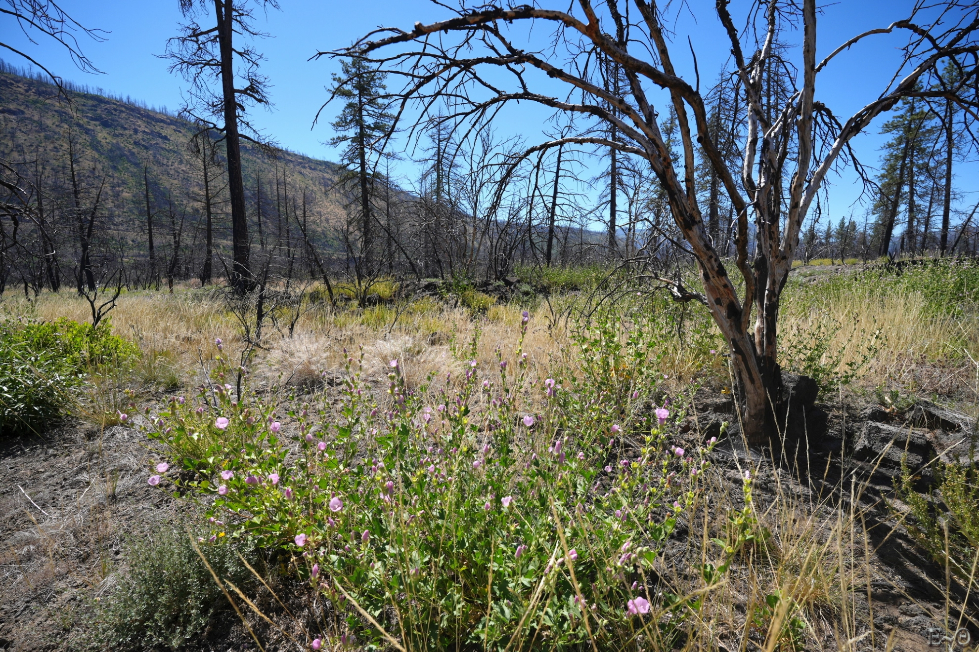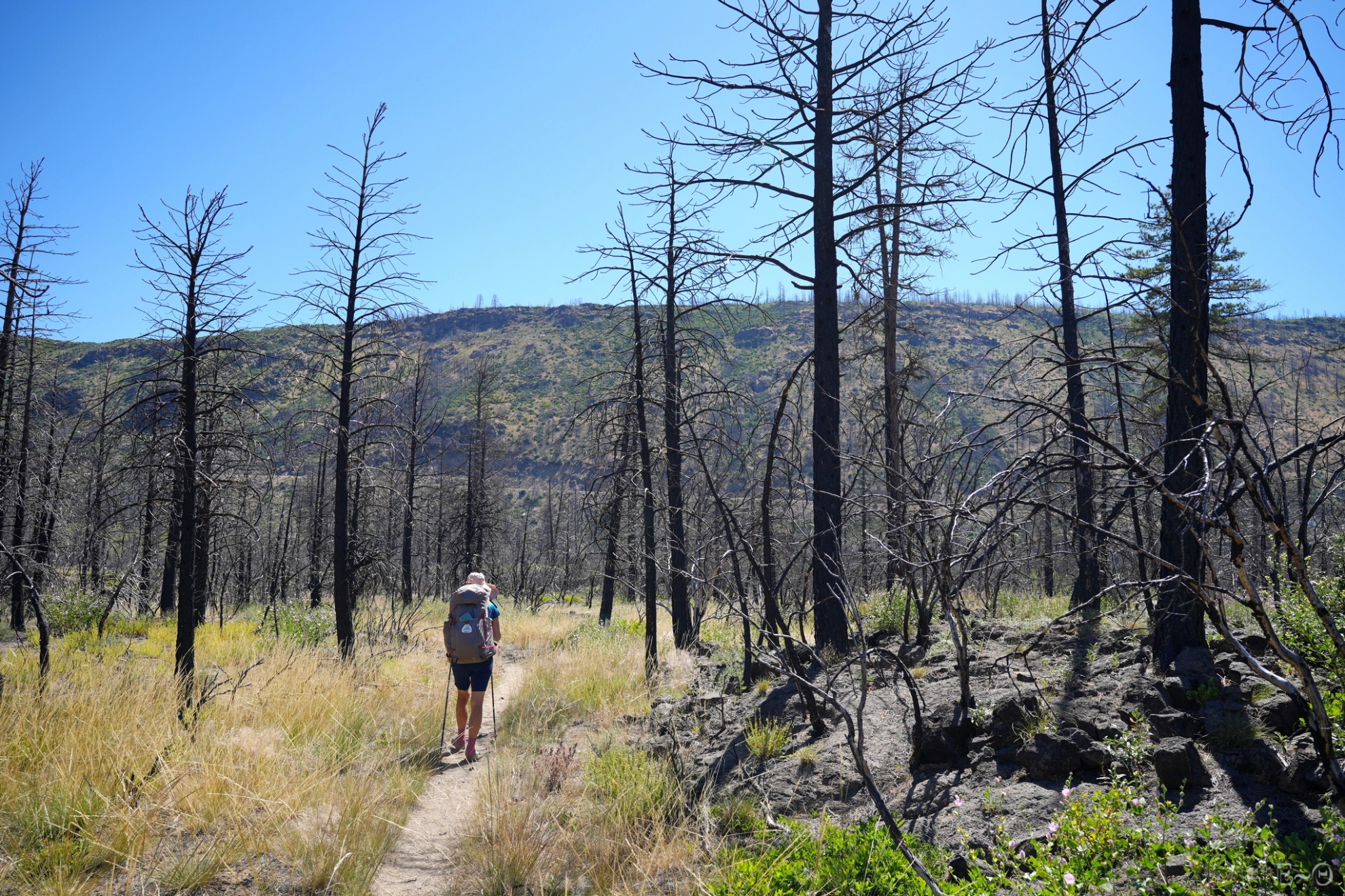Nous démarrons par une courte montée, dans une zone brûlée, avancée ultime au nord du Dixie Fire, pendant 3 kilomètres. Quand on imagine la surface détruite, un carré de 52 *52 km, c’est hallucinant. Nous ne regrettons pas d’avoir sauté la portion concernée. C’est bien glauque, les arbres sont morts, et la végétation basse essaie de reprendre vie. Une poussière de suie est omniprésente.
