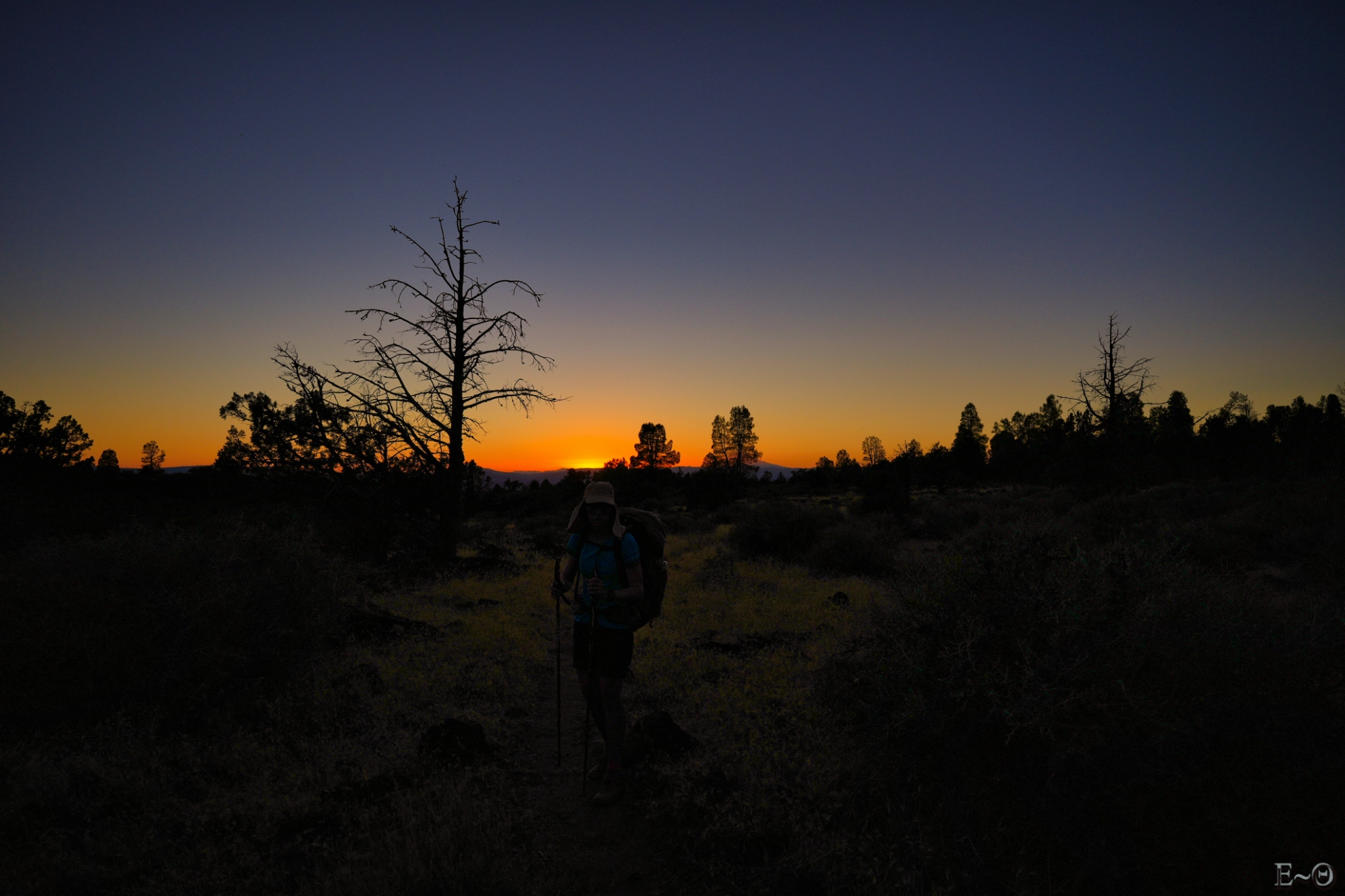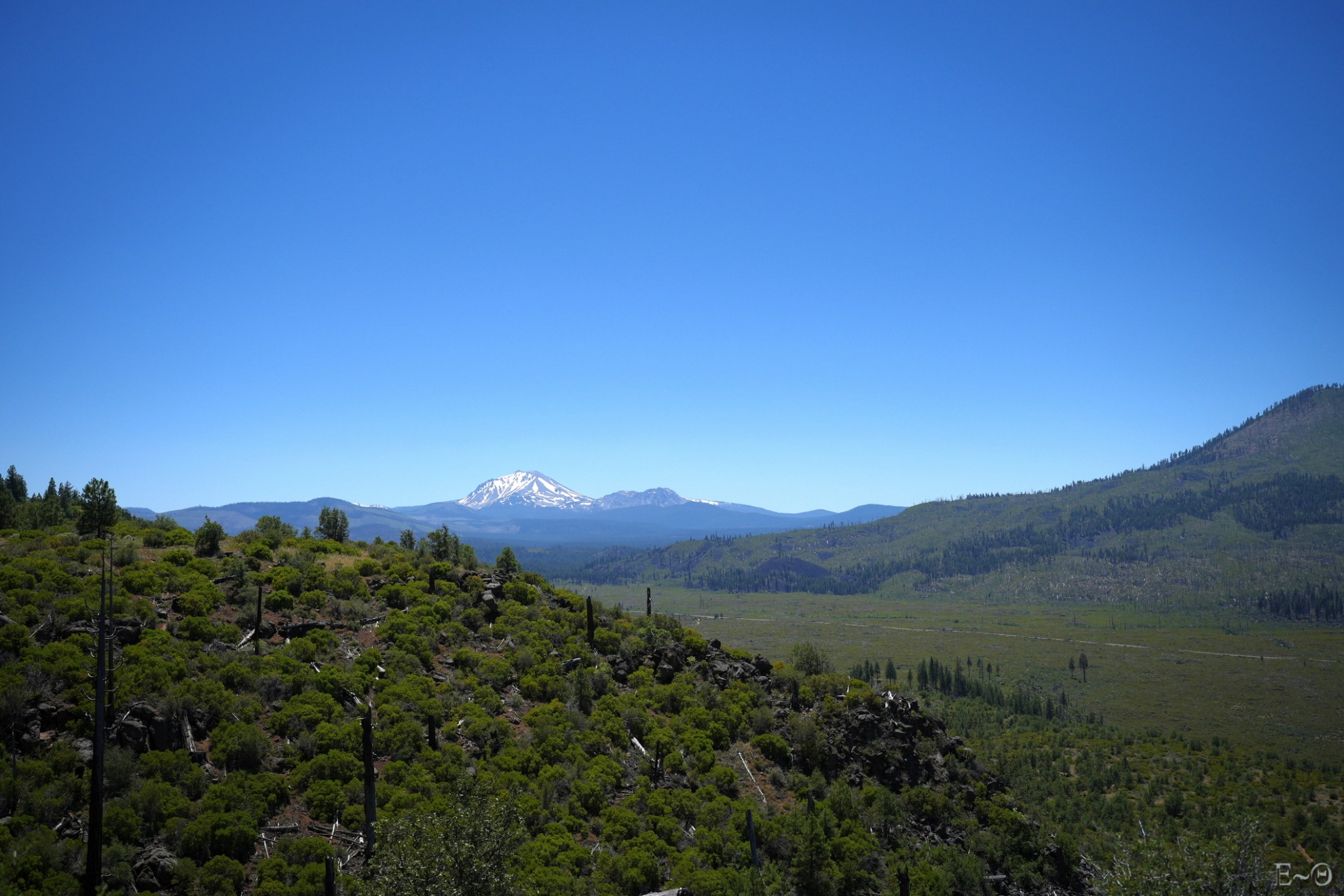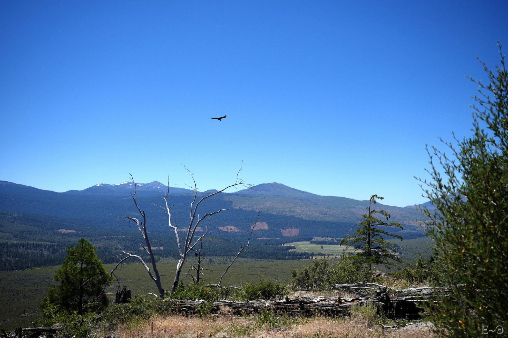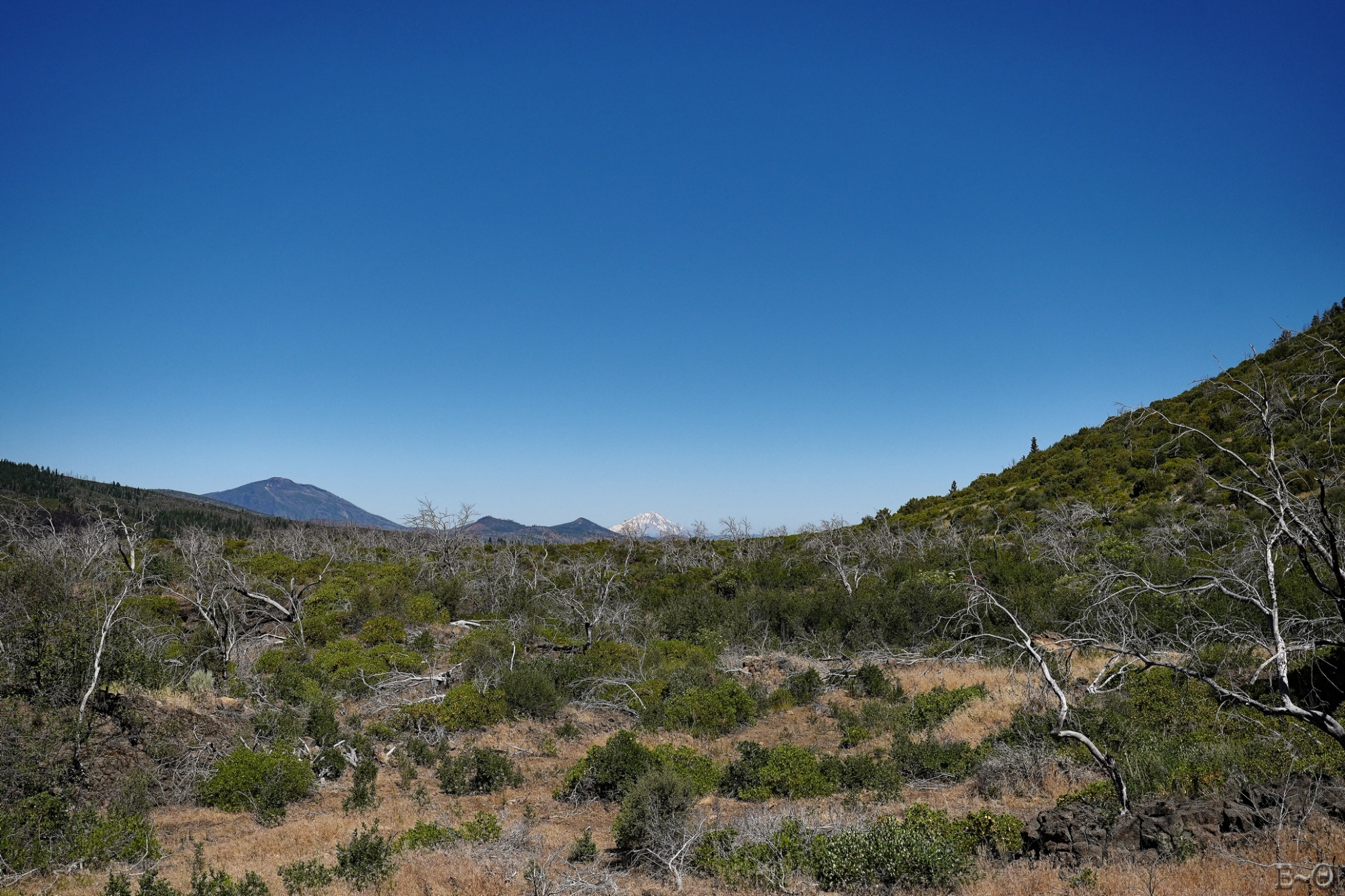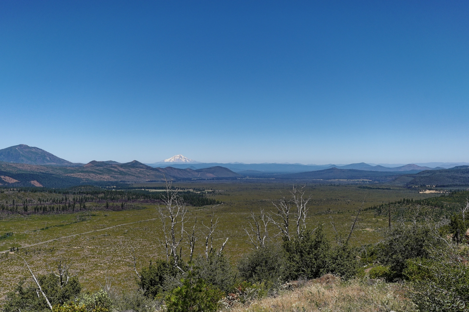 Ce sera le thème récurrent de la journée, la région a été particulièrement abîmée par les feux récents et anciens. Au cinquième kilomètre, nous arrivons à un parking vers Mud Lake avec un mémorial aux victimes du Burney Fire de 2009. Le panorama sur l’immense vallée de Hat Creek et le plateau Hat Creek Rim que nous allons suivre pendant les 25 km est peu rassurant. Ça va être long et suffocant. Les traces du feu sont encore présentes 15 ans après, même si la végétation rase a repris. Il n’y a plus un seul pin, c’est une vraie hécatombe.
