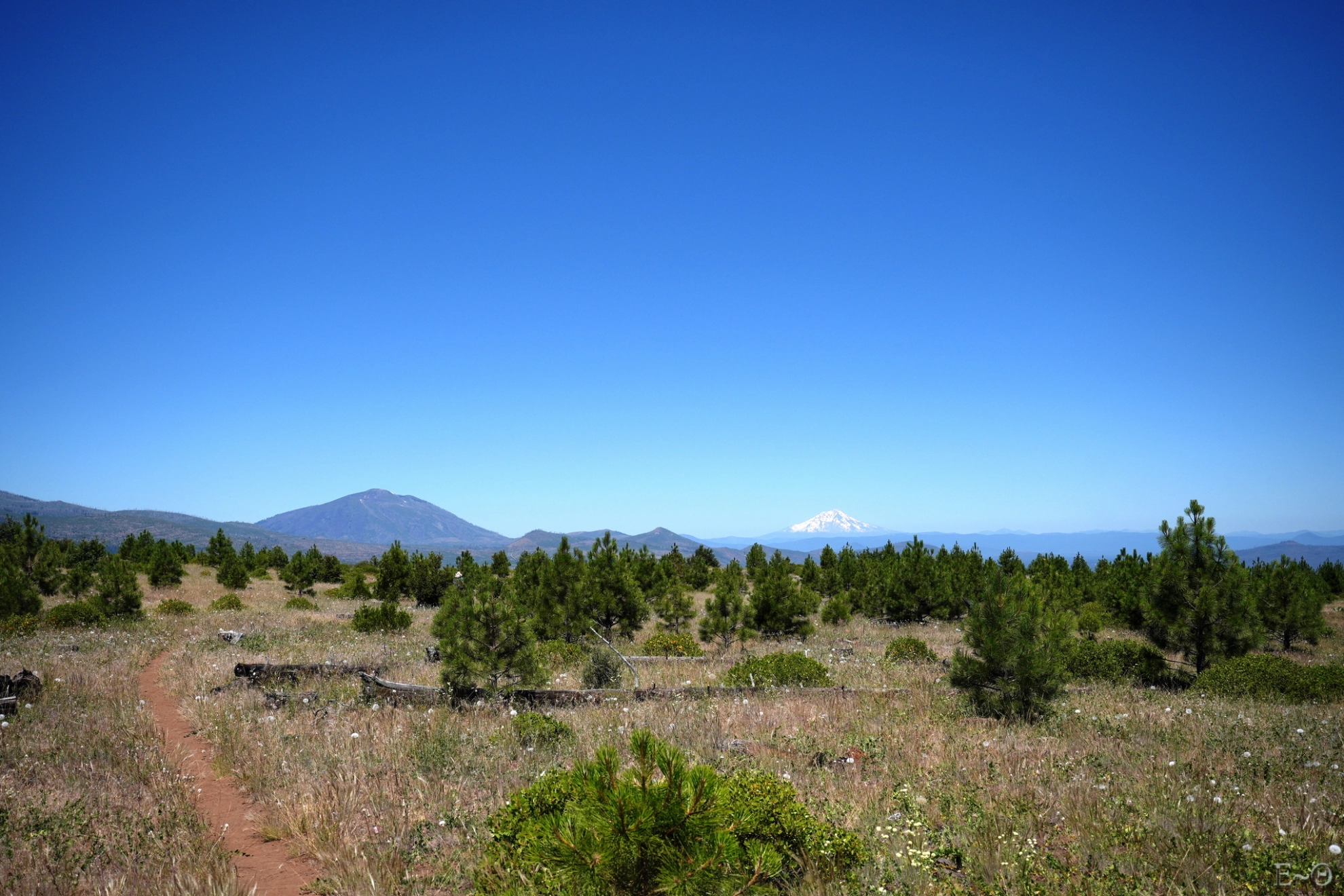 En contrepartie, les vues dégagées qui s’offrent aux randonneurs sont magiques. Le mont Lassen bien enneigé à notre gauche, et le mont Shasta, copie du mont Fuji domine la vallée en contre bas. La plaine aride qui fait penser à la savane africaine est jaune paille. La sécheresse commence. Le chemin progresse sur un sol volcanique rougeâtre de latérite bien salissante.