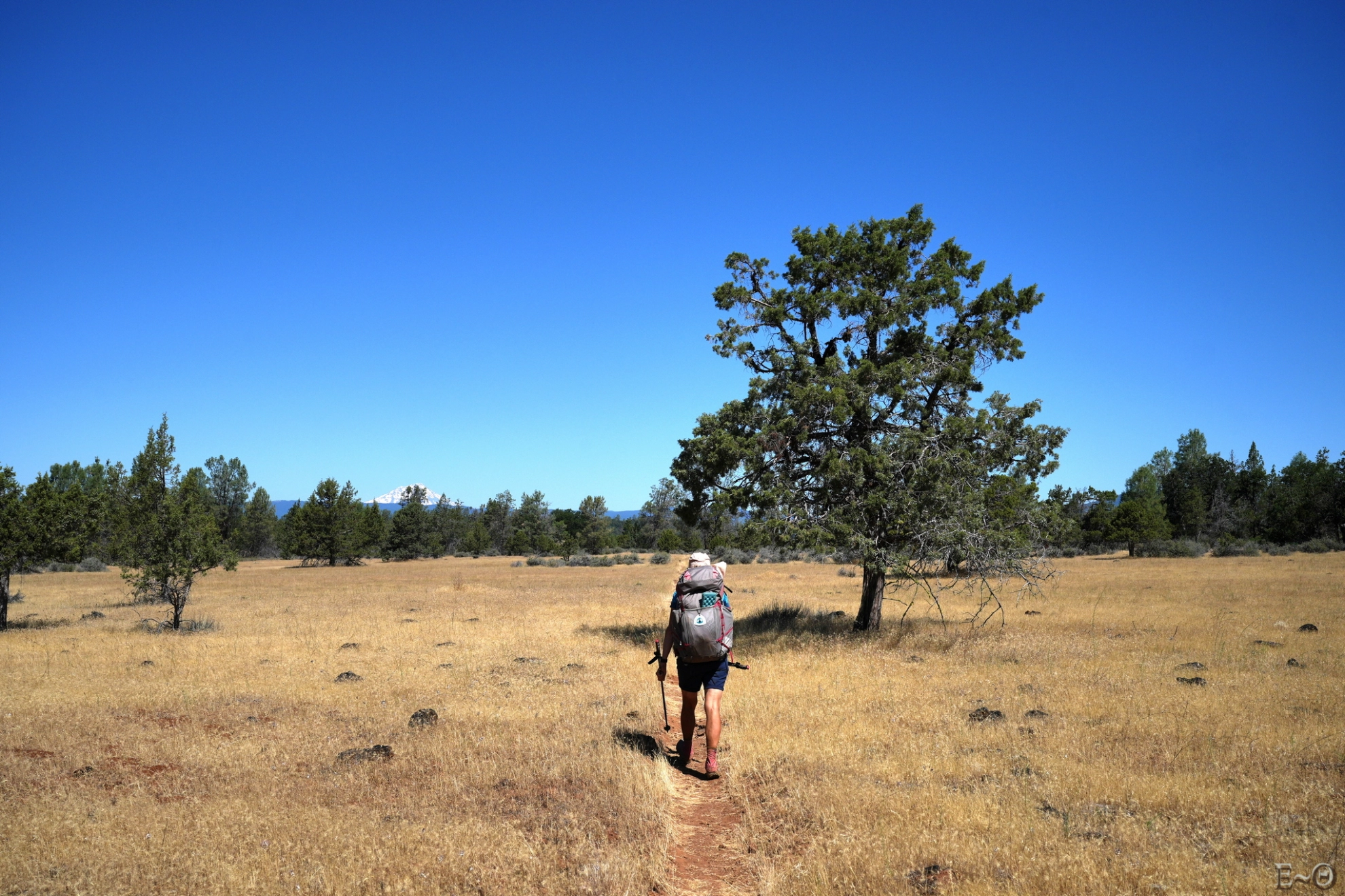 Nous repartons et avançons dans des paysages qui donnent l’impression d’être au milieu d’une savane africaine. Les herbes sont brûlées par la canicule, et de rares arbustes présents concèdent de temps en temps des refuges ombragés salvateurs. Au loin le cône parfait du mont Shasta crée la sensation d’être au Kenya et de voir vers le Kilimandjaro.