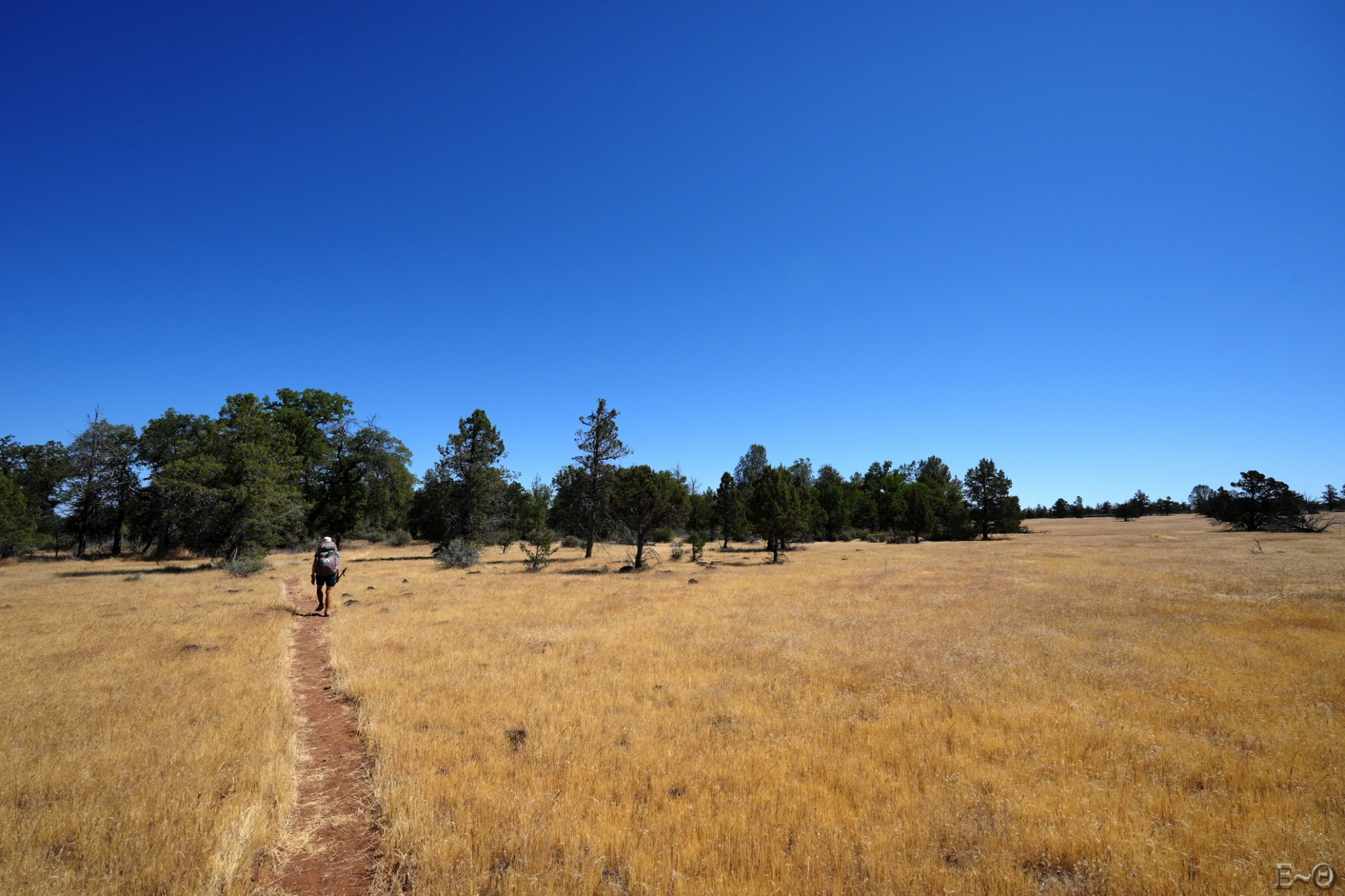Nous démarrons en continuant de suivre en hauteur la plaine de Hat Creek Valley. A hauteur de Six Mill Hill, nous descendons rapidement par une échancrure de la falaise vers celle-ci.